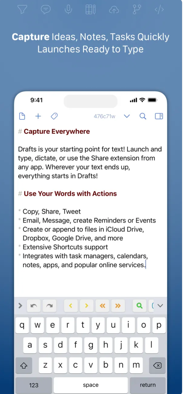 Drafts je jedna z nejoblíbenějších aplikací pro psaní, která nabízí také vestavěnou automatizaci, jež vám pomůže zpracovat text. Drafts také nabízí několik widgetů na zamykací obrazovce. Pomocí widgetů Drafts můžete zobrazit dokument nebo složku, otevřít nový dokument, spustit diktování, naskenovat dokument, spustit nový koncept s obsahem schránky a další.