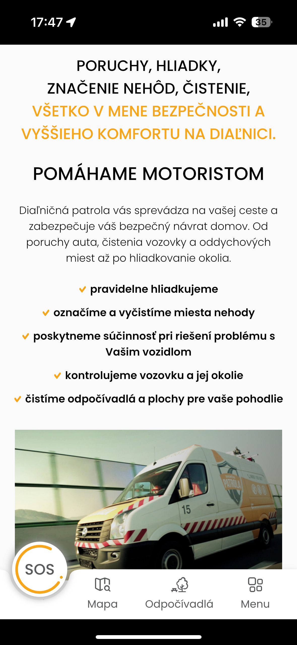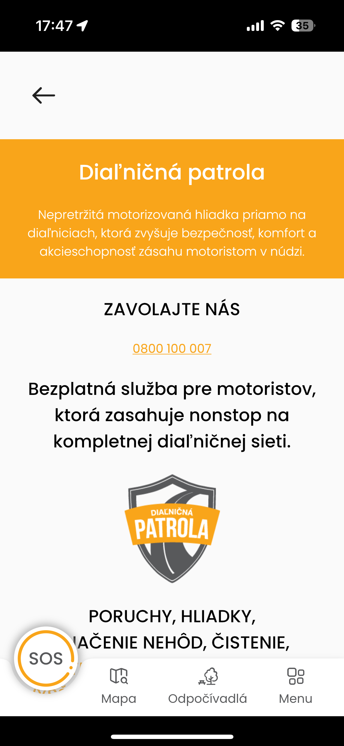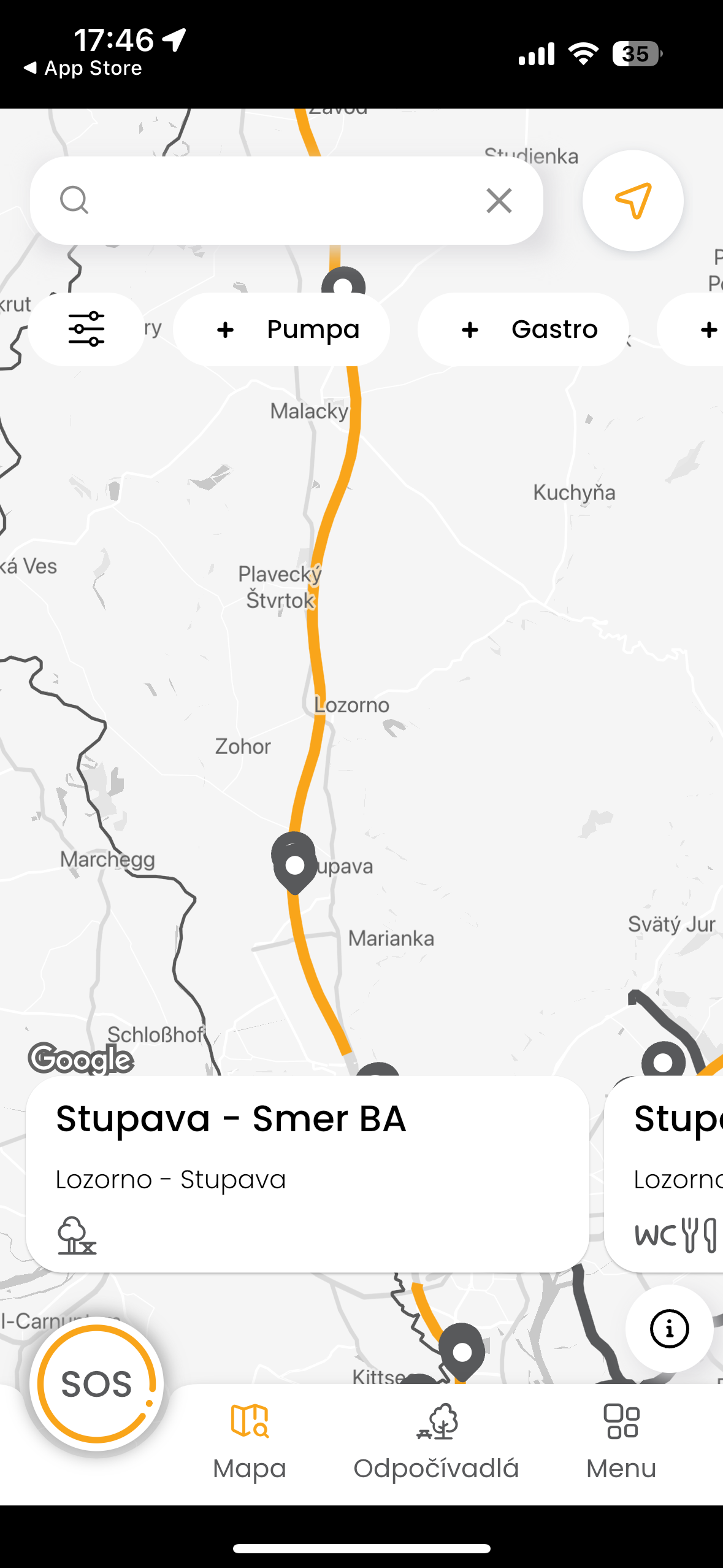 Kromě toho umí aplikace nabídnout veškerá odpočívadla v okolí dálnice a to včetně toho, že vám zobrazí, co na nich je k dispozici ať už jsou to toalety, občerstvení, hřiště pro děti nebo cokoli dalšího. Upřímně řečeno další funkce, které aplikace nabízí, nejsou ničím zajímavé a v podstatě vše najdete v Google Maps nebo kdekoli jinde, ovšem přivolání patroly je funkce, díky které se hodí mít ji nainstalovanou, když míříte na Slovensko. Technicky je na tom aplikace celkem špatně, protože v roce 2024 není přizpůsobena pro větší displeje iPhonů a i grafické zpracování neodpovídá tomu, že se jedná o oficiální aplikaci.