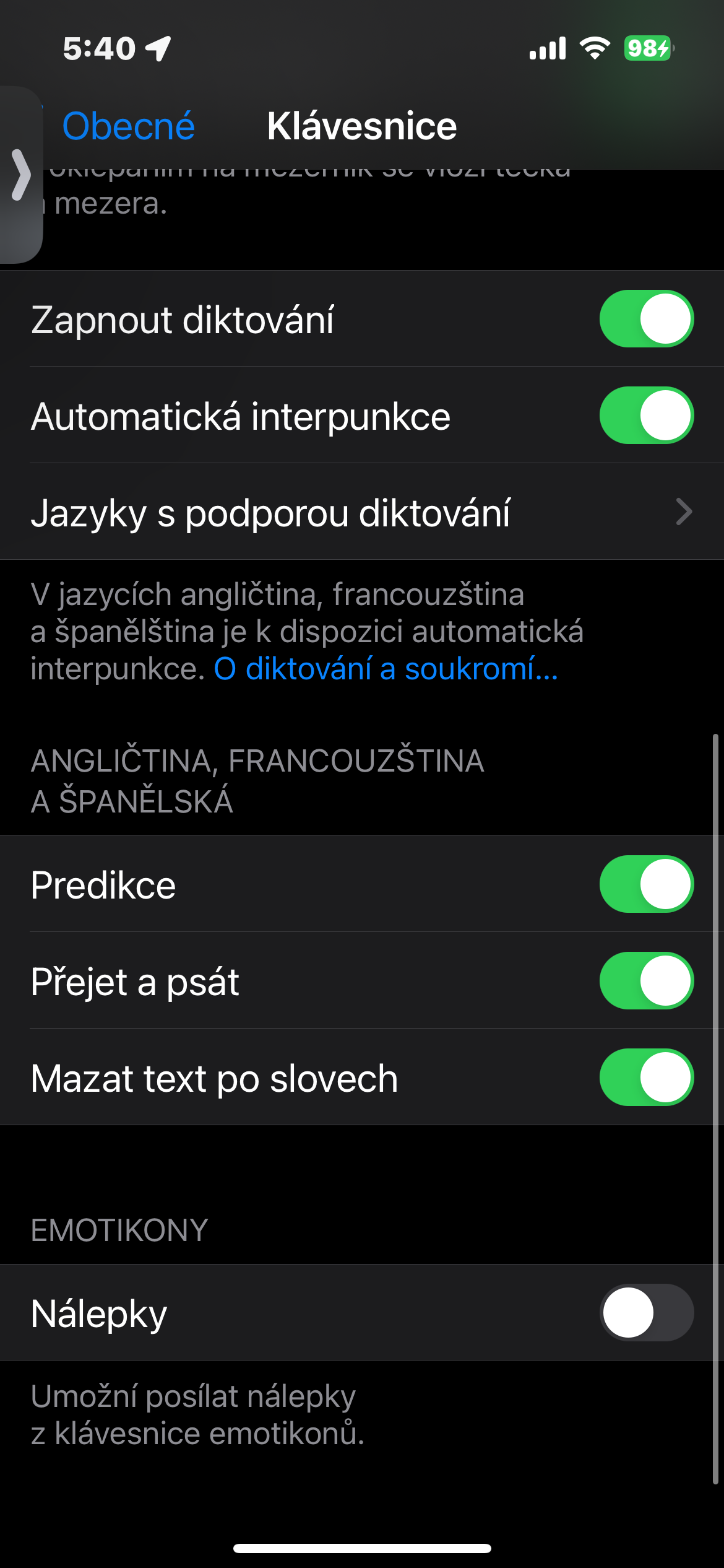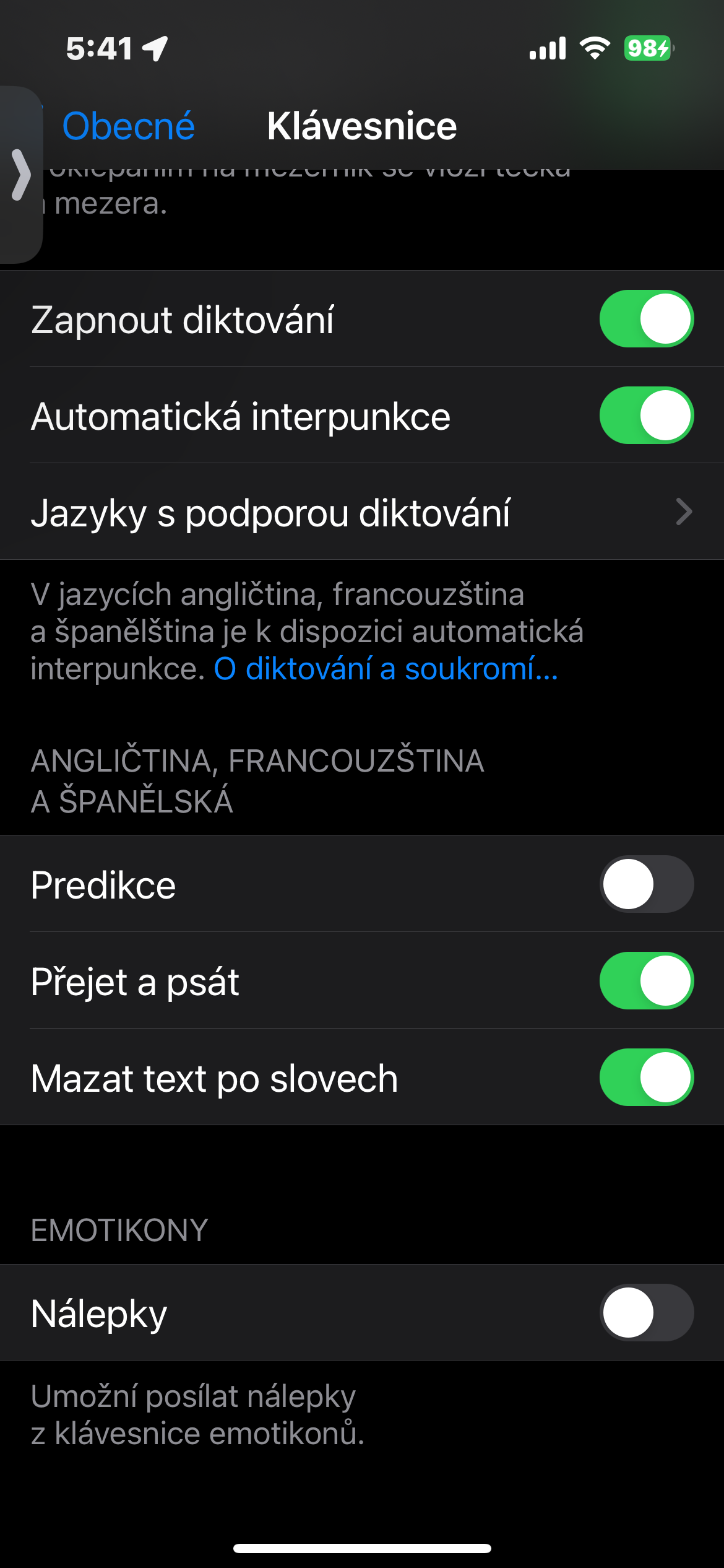 V Nastavení -> Obecné -> Klávesnice zkuste deaktivovat a opět aktivovat položku Prediktivní text. Tento krok by měl ve většině případů zabrat. Pokud ne, můžete zkusit restartovat váš i Phone, a v krajním případě zkrátka jen vyčkat na další aktualizaci.