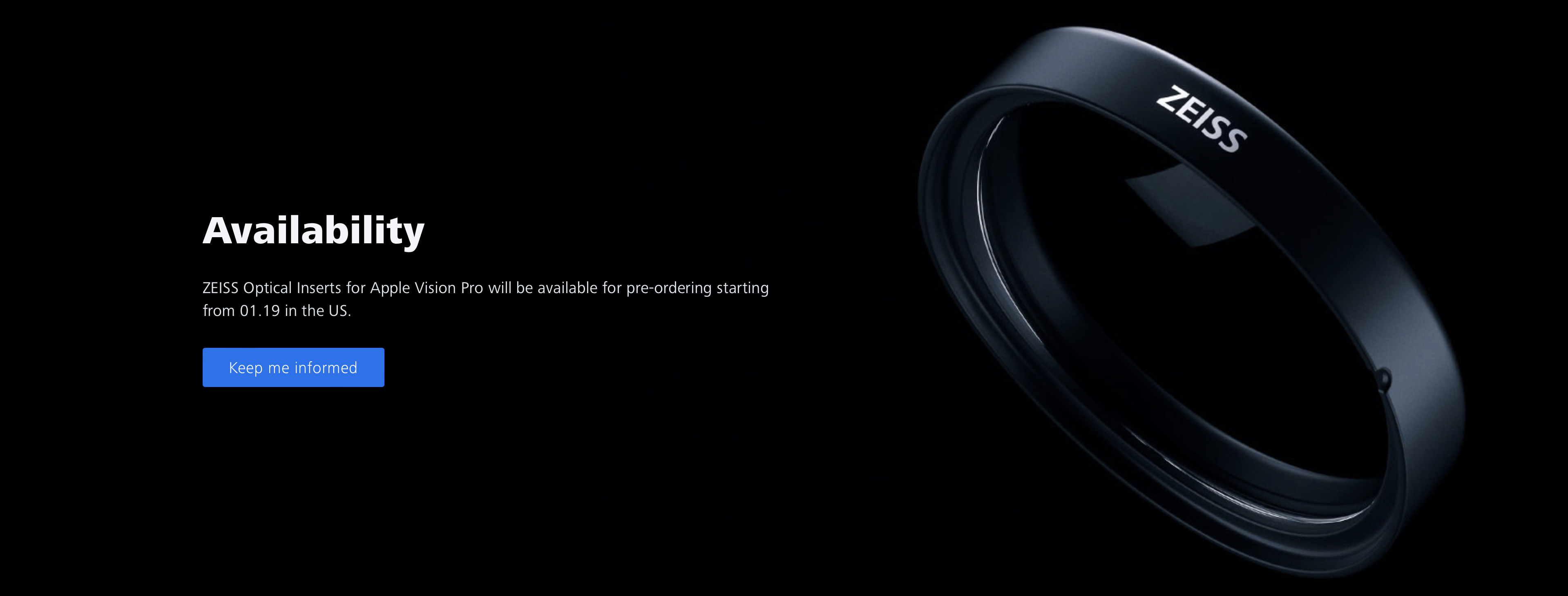 Společnost Zeiss, dříve Carl Zeiss zveřejnila na svých oficiálních webových stránkách první pohled na Zeiss Optical Inserts for Apple Vision Pro. Tedy na dioptrické čočky, které se vkládají do Vision Pro. Ty slouží ke korekci zrakových problémů uživatelů a nahrazují při používání Vision Pro brýle, se kterými nejsou brýle Vision Pro kompatibilní. Čočky jsou k dispozici ve dvou typech, jeden takzvaně unifikovaný, který řeši standardní zrakové problémy a druhý, který je k dispozici na lékařský předpis.