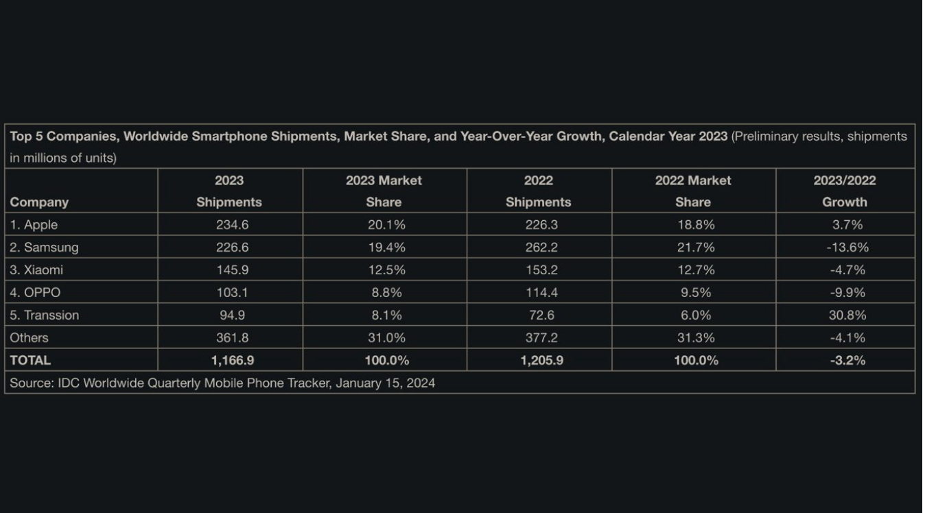 Předběžné údaje ukazují, že se společnosti Apple podařil předběhnout vůbec poprvé v historii firmu Samsung na prvním místě v celosvětových dodávkách chytrých telefonů pro rok 2023, a že je Apple navíc jedinou společností z první trojice, která v daném roce zaznamenala pozitivní růst.