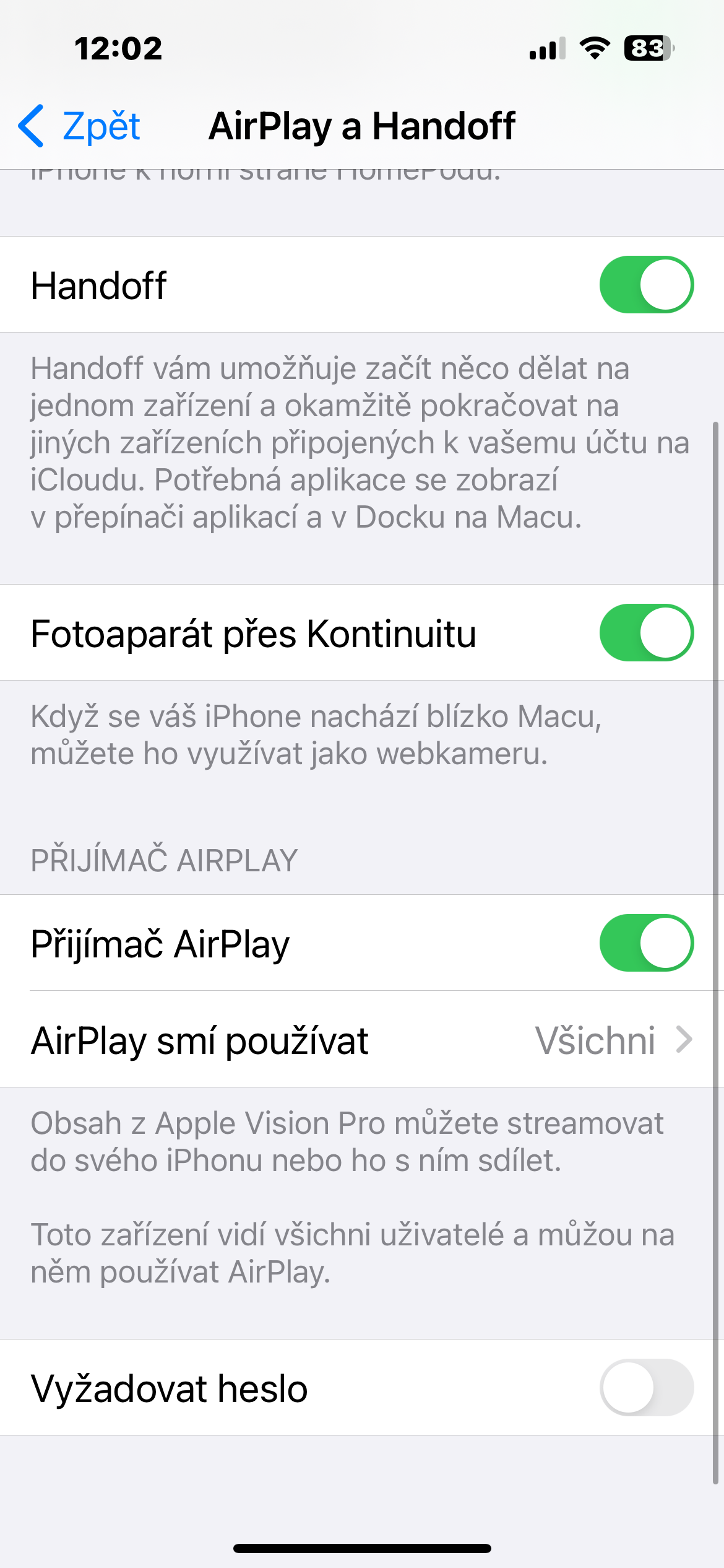 K dispozici je v iOS 17.2 také nové nastavení Přijímač AirPlay, které umožní připravované náhlavní soupravě Apple Vision Pro streamovat nebo sdílet obsah do iPhonu. V Nastavení -> Obecné -> AirPlay a Handoff můžete v sekci Přijímač AirPlay aktivovat Přijímač AirPlay a nastavit, kdo všechno může AirPlay používat.