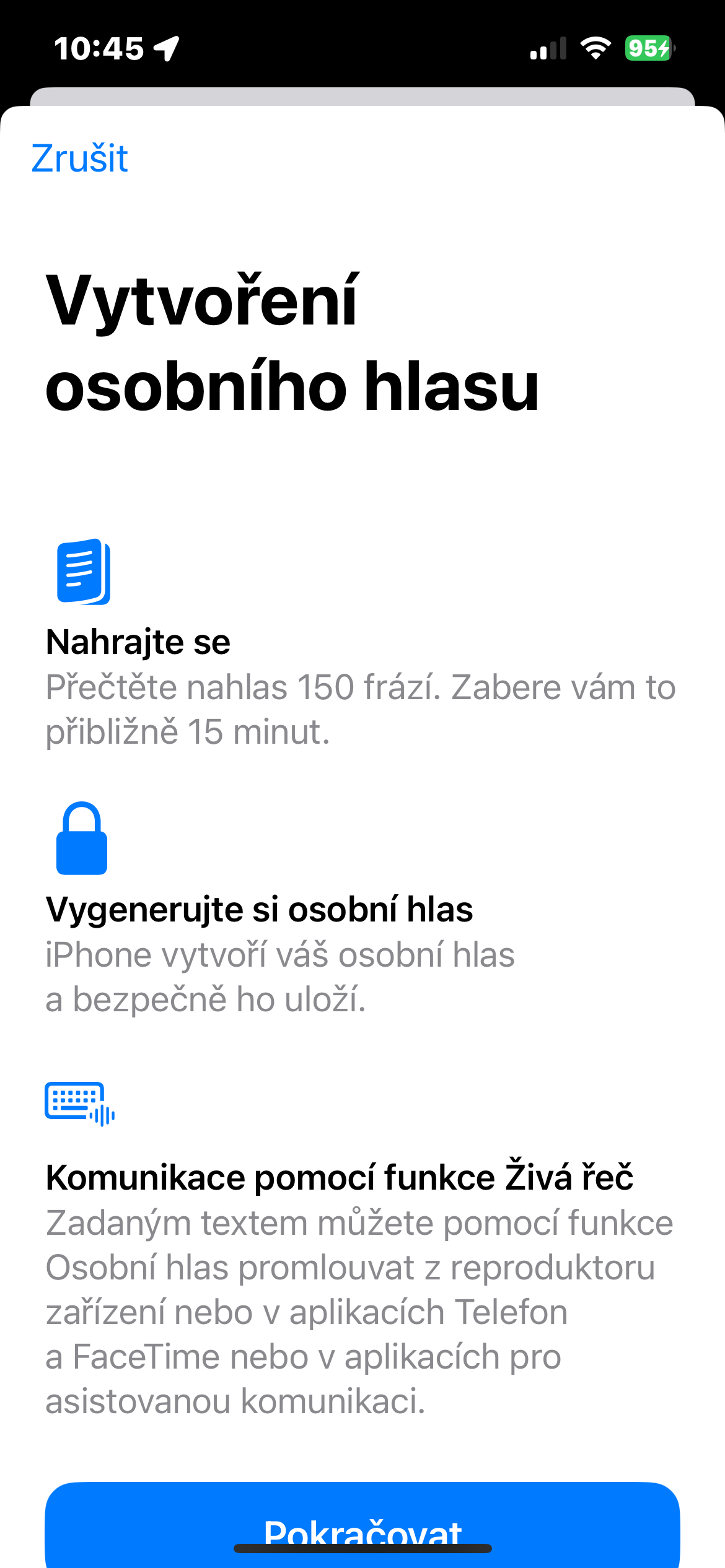 Samotné nahrávání vět trvá zhruba 15 minut – jedná se celkem o 150 frází. Jakmile fráze přečtete, iPhone vytvoří a uloží vás Osobní hlas, který můžete následně využívat v rámci funkce Živá řeč.