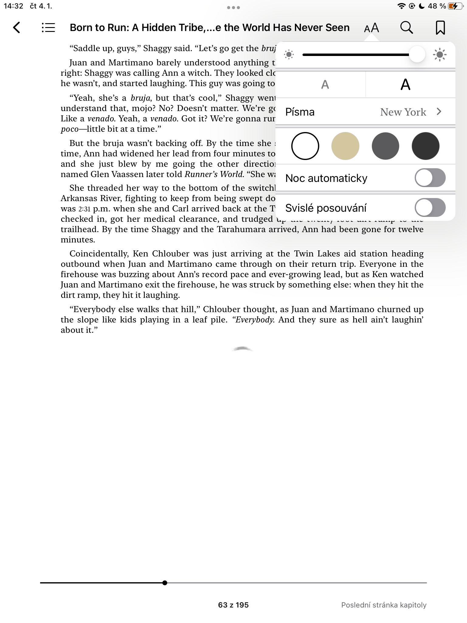 Velikost ani font písma není ničím, co by bylo v Apple Knihách neměnné. Pokud vám aktuální formát nevyhovuje, můžete jej do jisté míry změnit. V dané knize klepněte na ikonku Aa v horní části displeje vašeho zařízení. Zde můžete vybrat velikost písma, zbarvení papíru, nebo po klepnutí na Písma změnit i font písma dané knihy.