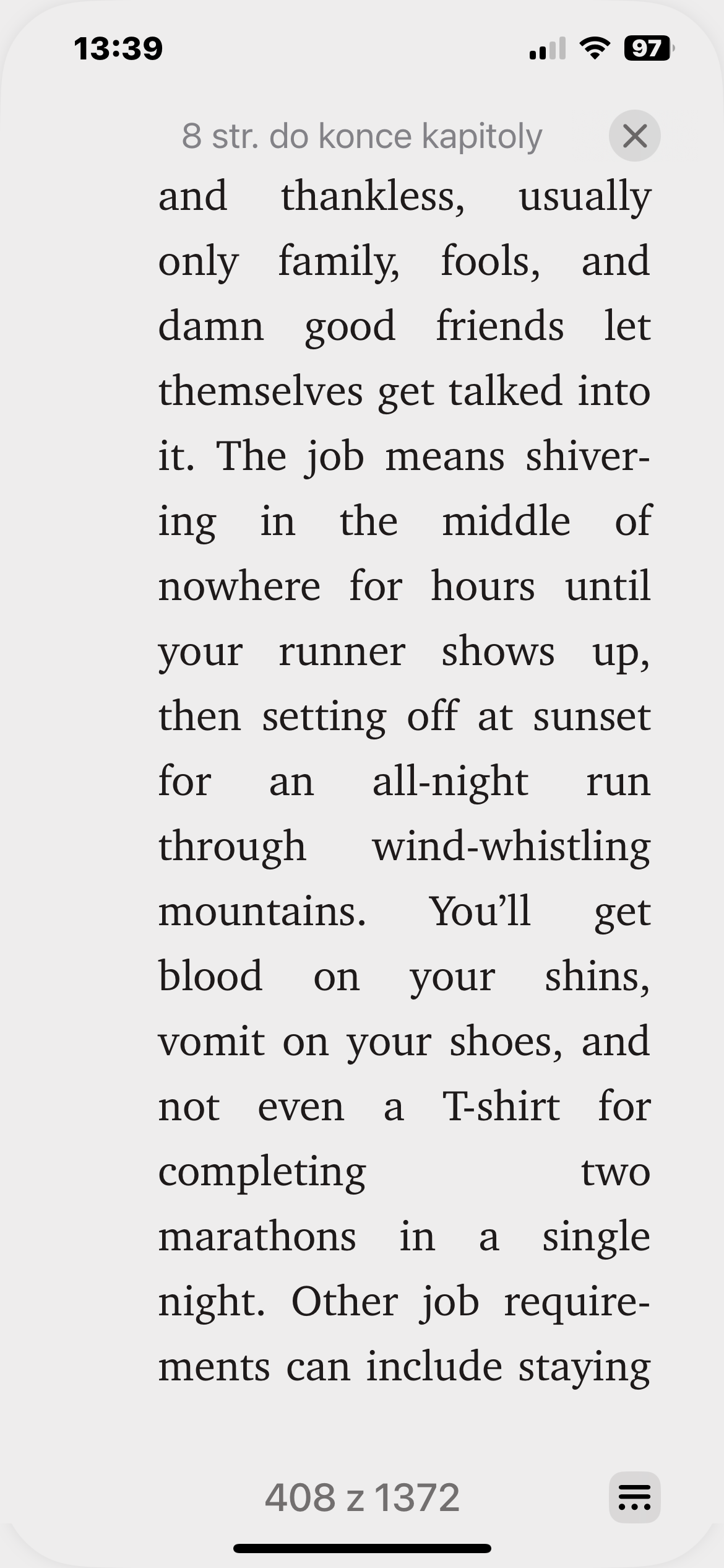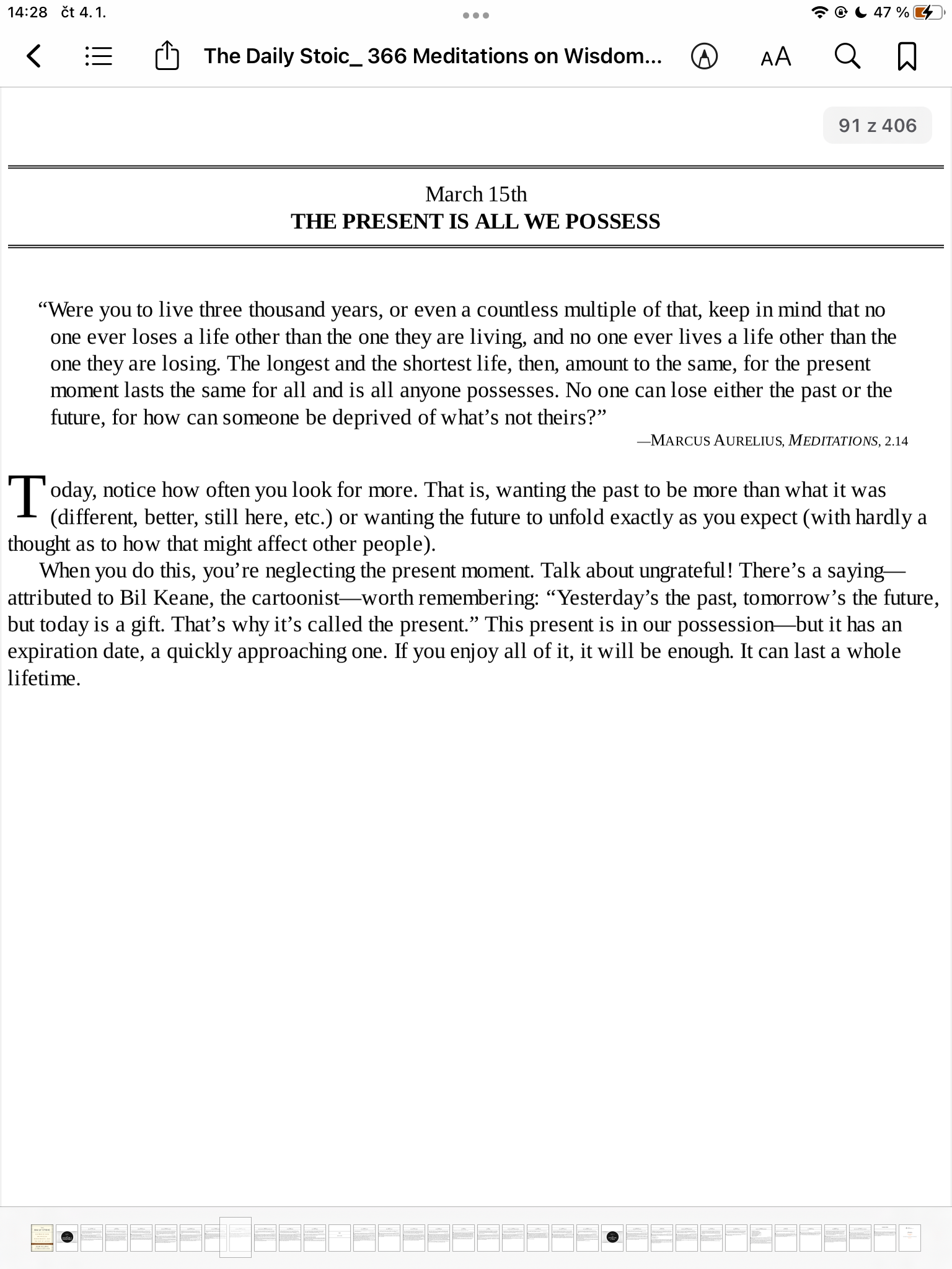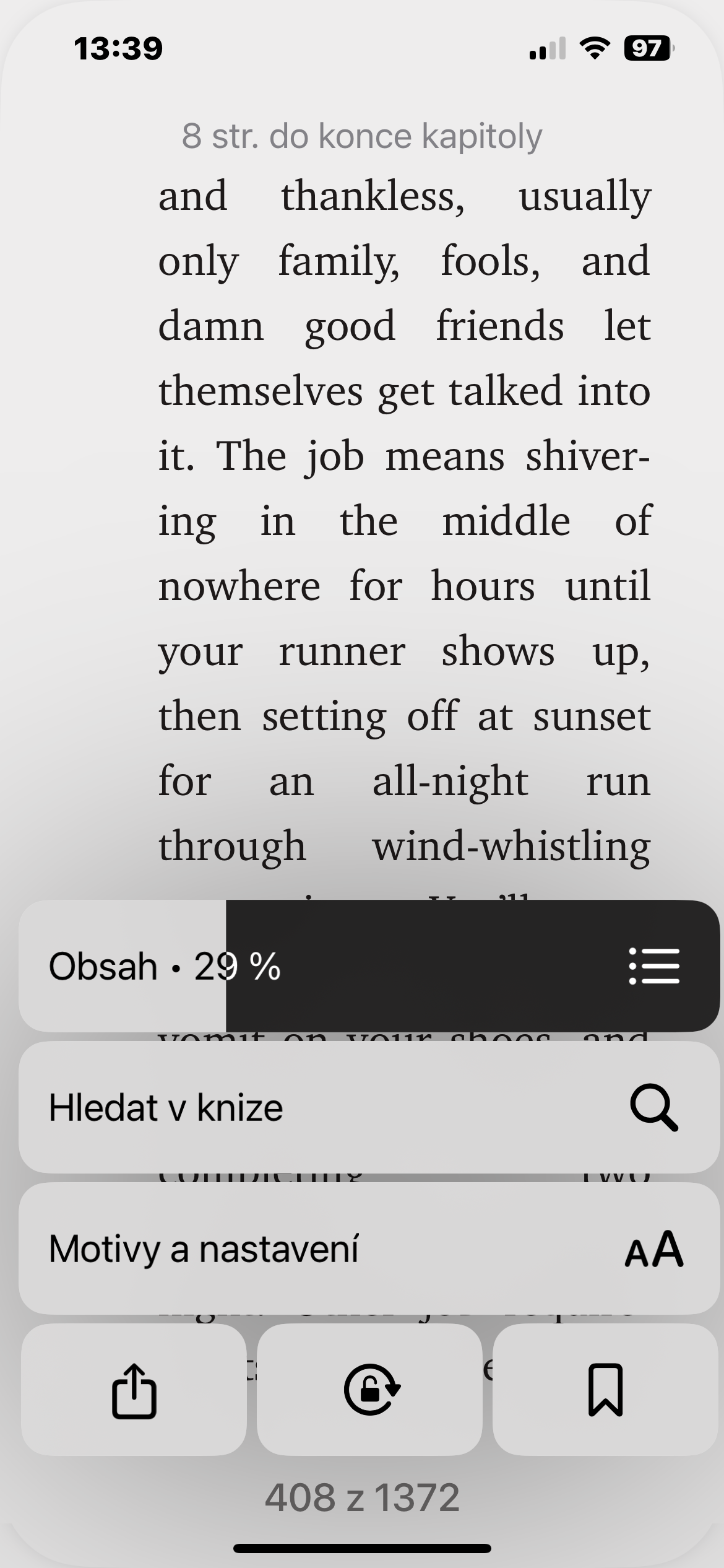 Při čtení knihy v aplikaci Knihy automaticky zmizí nabídka ovládacích prvků. Tím získáte čistý pohled na knihu bez rušivých prvků. Pokud ovšem potřebujete během čtení knihy, souboru PDF nebo jiného dokumentu vstoupit do této nabídky, stačí klepnout na střed obrazovky, a v případě iOS následně na ikonku v pravém dolním rohu. Poté můžete provádět řadu akcí, například přidání záložek nebo návrat do knihovny.