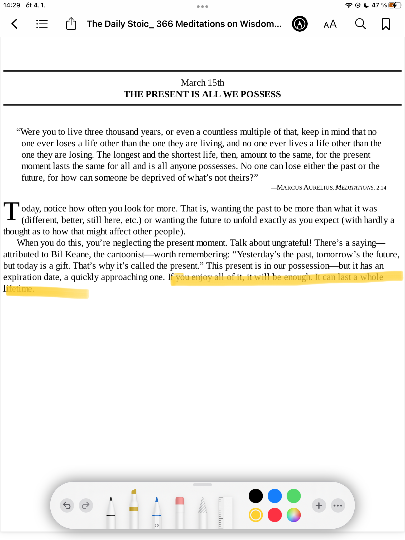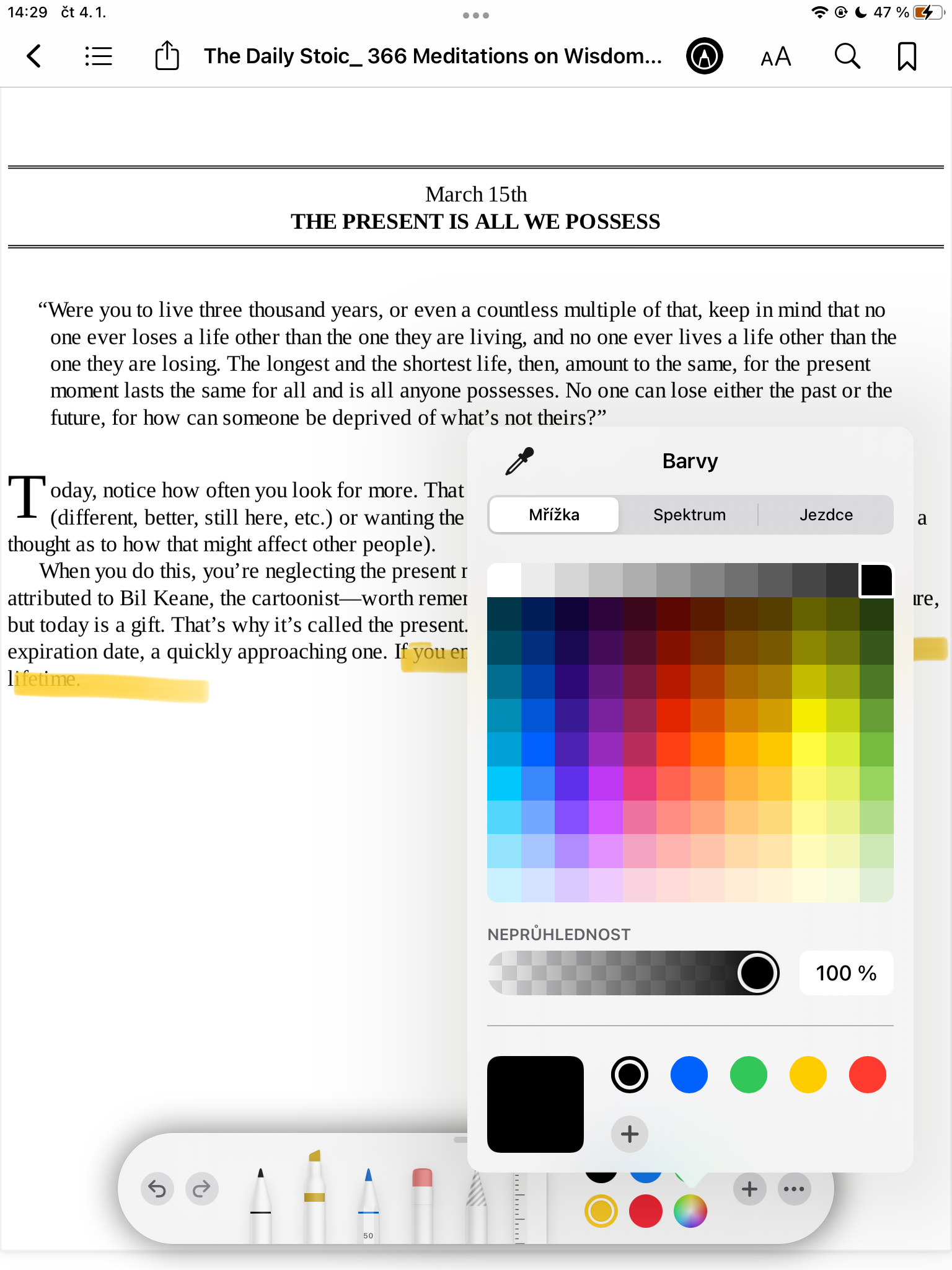 Mnoho lidí si při čtení rádo zvýrazňuje fyzické knihy – velmi snadno se tak později vrátí k důležitým pasážím. Věděli jste, že text můžete zvýrazňovat i při čtení v nativních Apple Knihách? Stačí klepnout na ikonu tužky vpravo nahoře a poté na liště ve spodní části displeje vybrat vhodný nástroj.