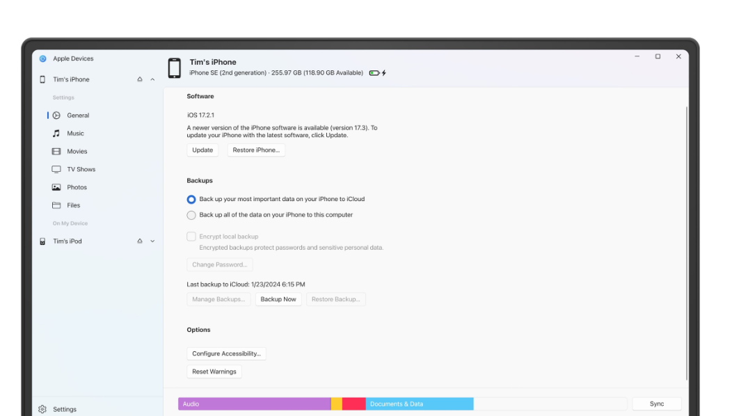 Aplikace Apple Music poskytuje uživatelům systému Windows možnost poslouchat a spravovat hudbu z jejich knihovny iTunes, včetně nákupů v iTunes Store, zatímco aplikace Apple TV umožňuje uživatelům sledovat a spravovat filmy a televizní pořady z iTunes. Obě aplikace také umožňují přístup ke streamovacím službám společnosti Apple, Apple Music a Apple TV+. Aplikace Apple Devices je navržena tak, aby umožnila majitelům počítačů aktualizovat, zálohovat a obnovovat a spravovat jejich iPhony a iPady a synchronizovat obsah z jejich počítačů.