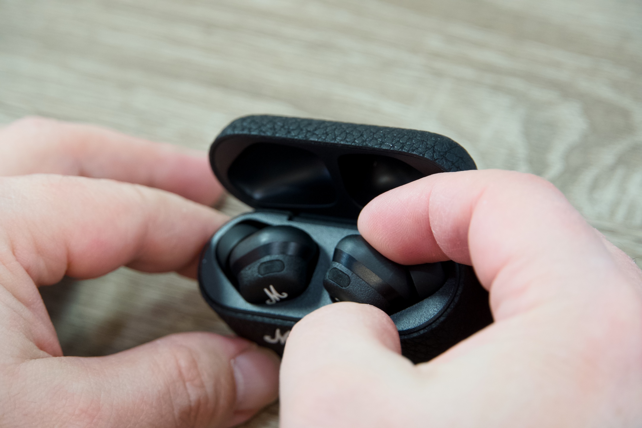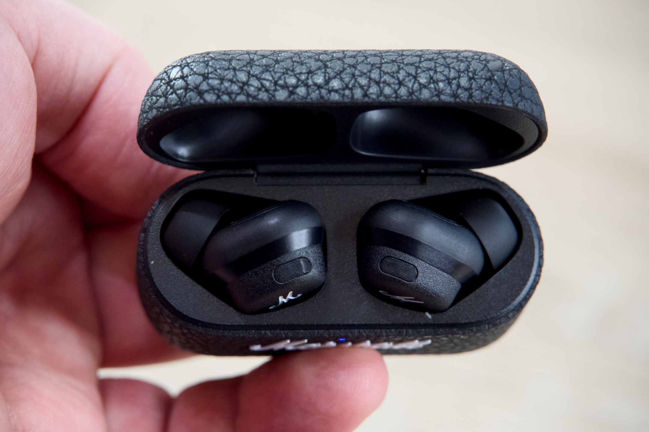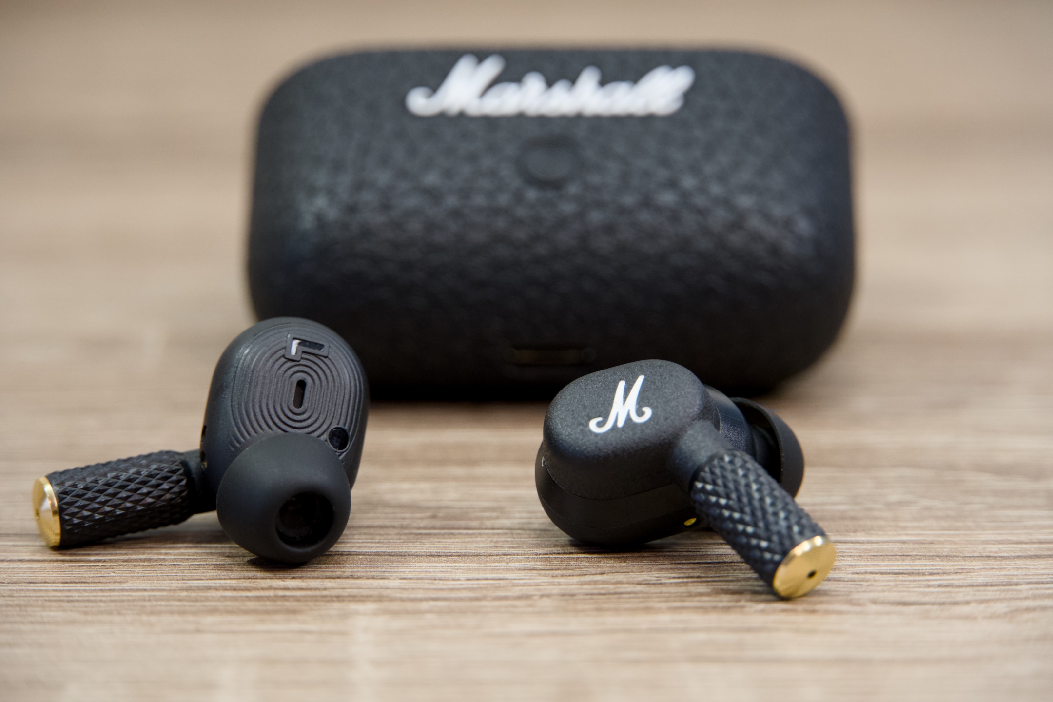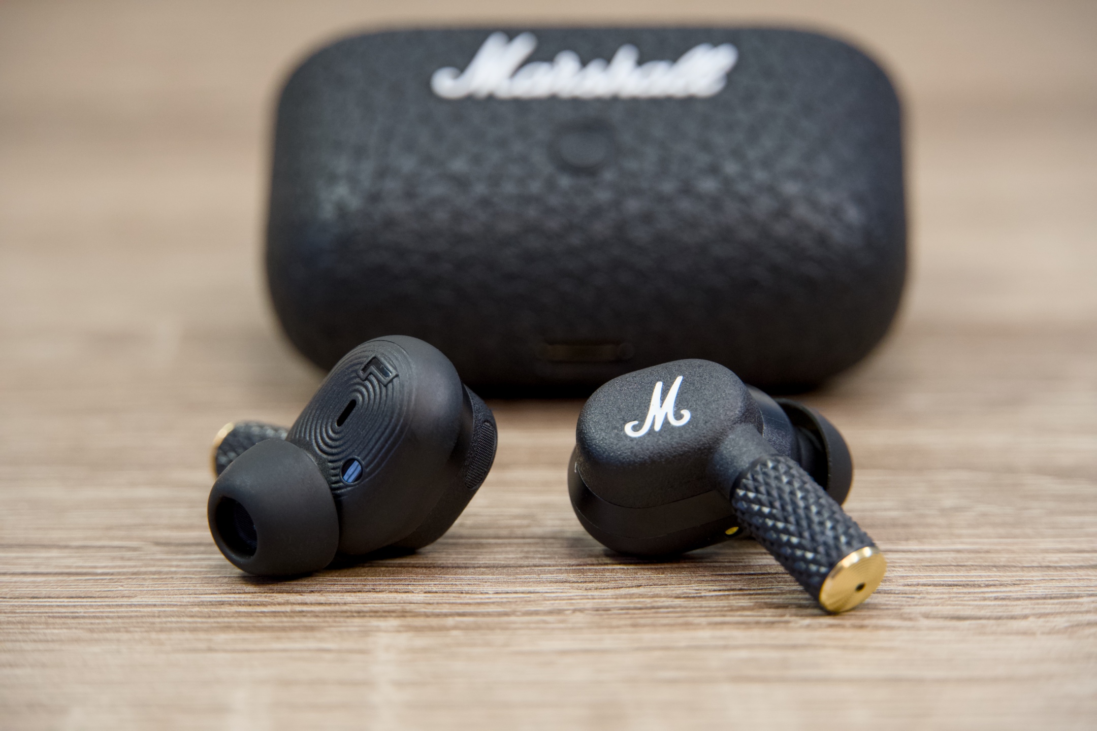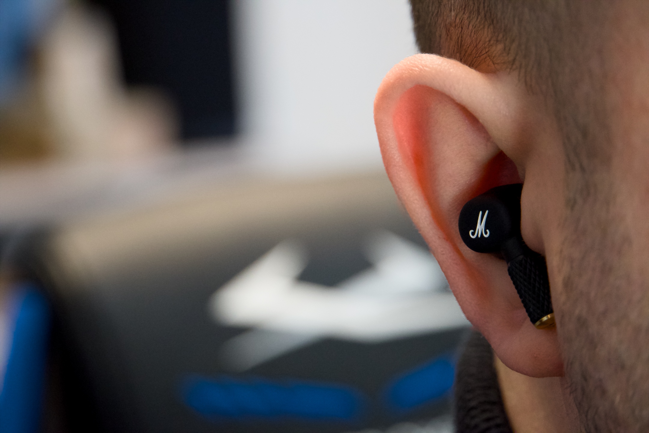 In-ear sluchátka, z nichž každé je uvnitř vybaveno dvěma mikrofony, jedním směřujícím dovnitř a jedním ven, mají klasický oválný tvar, zvenčí je zdobí velké „M“ a na konci stopky zlaté zakončení, což koresponduje s typickým vizuálním pojetím značky.