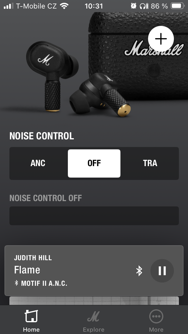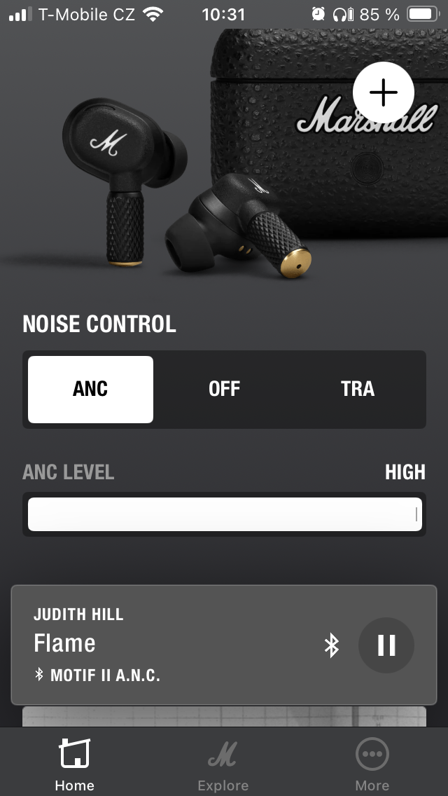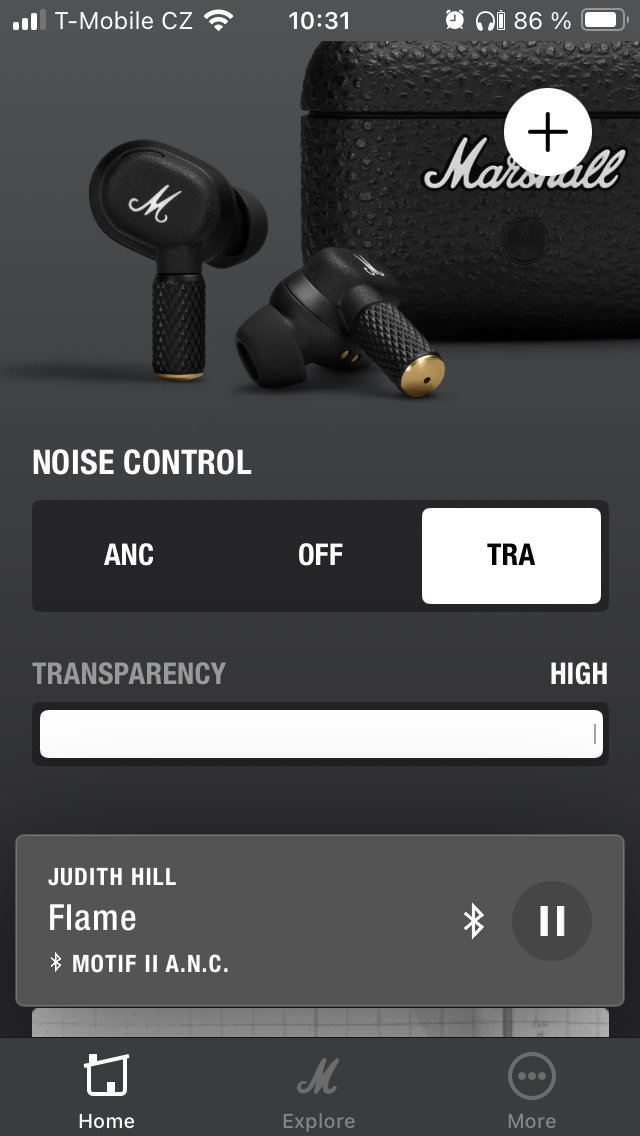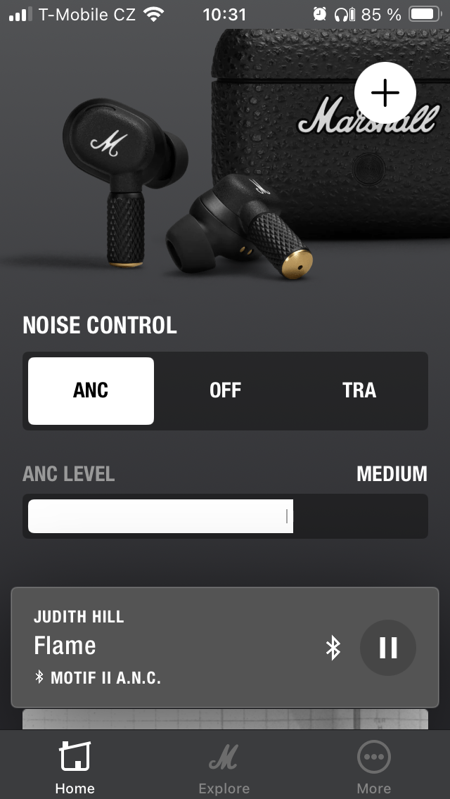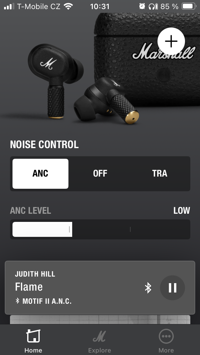 Nejprve jsou to zásadní data o stavu nabití pravého a levého sluchátka i pouzdra. První sekce je pak zaměřena na potlačení hluku a propustnost, přičemž lze v obou případech zvolit intenzitu ve 3 úrovních nebo funkci zcela vypnout. Dále je uživateli k dispozici 5pásmový ekvalizér s 5 předpřipravenými presety a variantou „Custom“ pro úpravu dle individuálních požadavků, takže si každý najde „svůj zvuk“. Níže je možné přizpůsobit dotykové ovládání, projít si informace o tom, jak operuje Spotify tap a přistupovat k dalším položkám, včetně využití funkce „Battery Preservation“, kde je opět na výběr ze 3 levelů opatření pro úsporu energie. Pakliže by vás MOTIF II A.N.C. zaujaly natolik, že zvažujete zjistit, co dalšího se nachází v nabídce Marshall, je zde pro tyto potřeby tlačítko „Explore“, zatímco pod „More“ najdete nápovědu, přihlášení k odběru novinek a několik odkazů směřujících na web společnosti.
