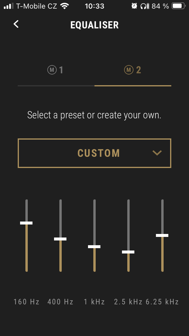 Kromě aparátů pro elektrickou i akustickou kytaru jsem před lety měl možnost vyzkoušet Marshall Major II, které zněly velmi vyrovnaně, a něco podobného jsem tak trochu očekával také od MOTIF II A.N.C. Dočkal jsem se plného zvuku s pevnými basy a nezaznamenal jsem cokoli nežádoucího ani při maximálním posílení spodních frekvencí na ekvalizéru, díky němuž jsem nakonec vyladil projev přesně podle svých představ. Ve výchozím nastavení v aplikaci označeném jako „The original Marshall sound“ se z mého pohledu trochu zbytečně prosazovaly středy, ovšem rozumím tomu, že někdo má takový zvuk raději. Zatímco například pro akustickou hudbu se hodí skvěle, při poslechu klasického rocku nebo taneční hudby jsem upřednostnil úpravu EQ ve tvaru písmene „U“. Pokud ve snaze o přizpůsobení dáte zelenou ekvalizéru, doporučuji si zkontrolovat, zda už jej nepoužíváte ve Spotify nebo jiném přehrávači. Vzájemná kombinace nemusí přinést očekávané výsledky.