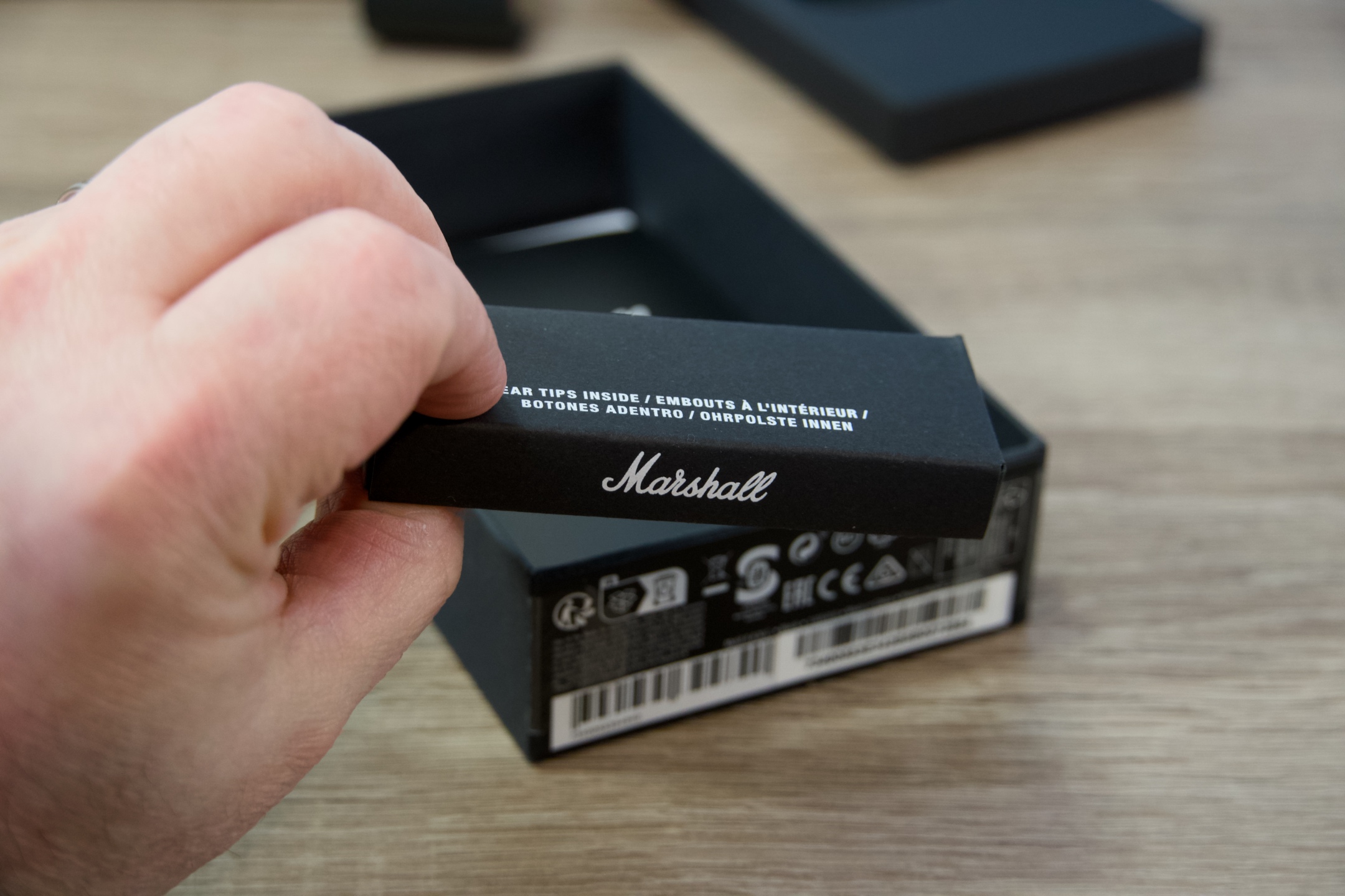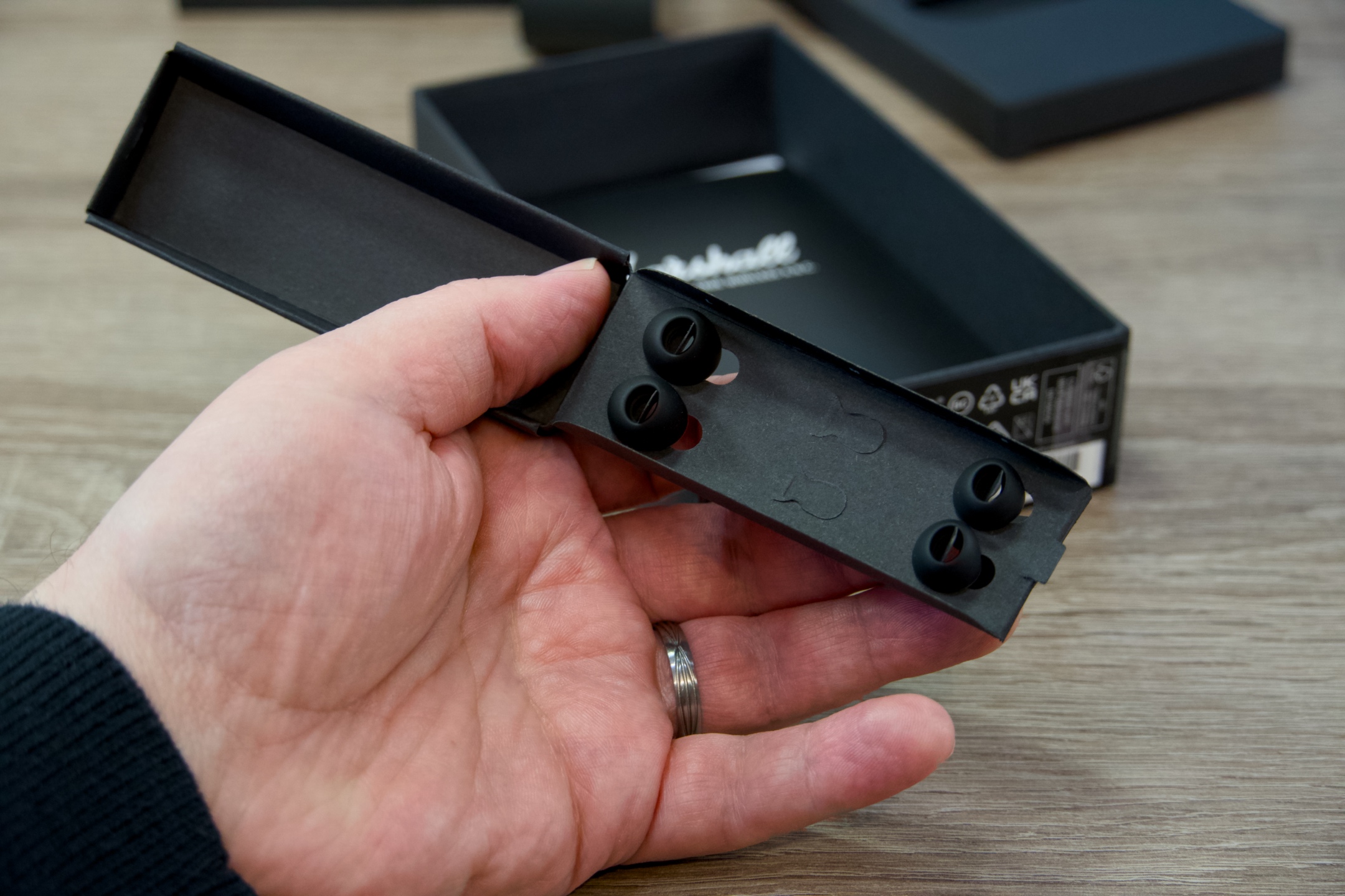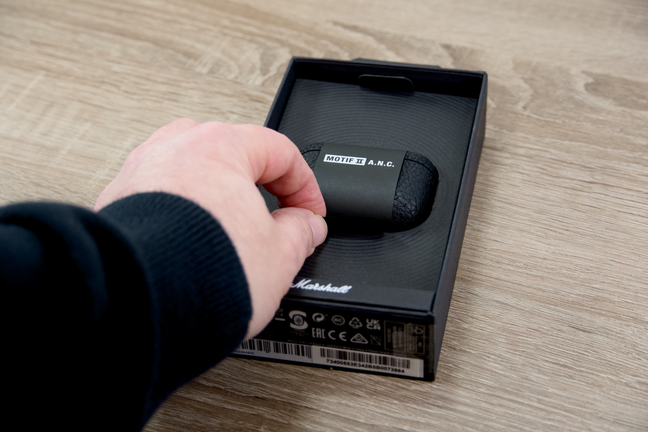 Nevelkou černou krabičku otevřete vysunutím dolů, načež se před vámi objeví pouzdro s vizuálně poutavou texturou ovinuté papírovým páskem, za který stačí mírně zatáhnout a MOTIF II A.N.C tak vyjmout z balení. Obdobným způsobem se dostanete k o vrstvu níže uloženému 20cm nabíjecímu kabelu USB-A na USB-C a dokumentaci, zatímco se ve spodní části nachází doplňující sada nástavců různých velikostí, které zajistí, že vám sluchátka skutečně padnou do ucha. Pak už zbývá jen pustit se do párování a připravit se na jedinečný zvukový zážitek.