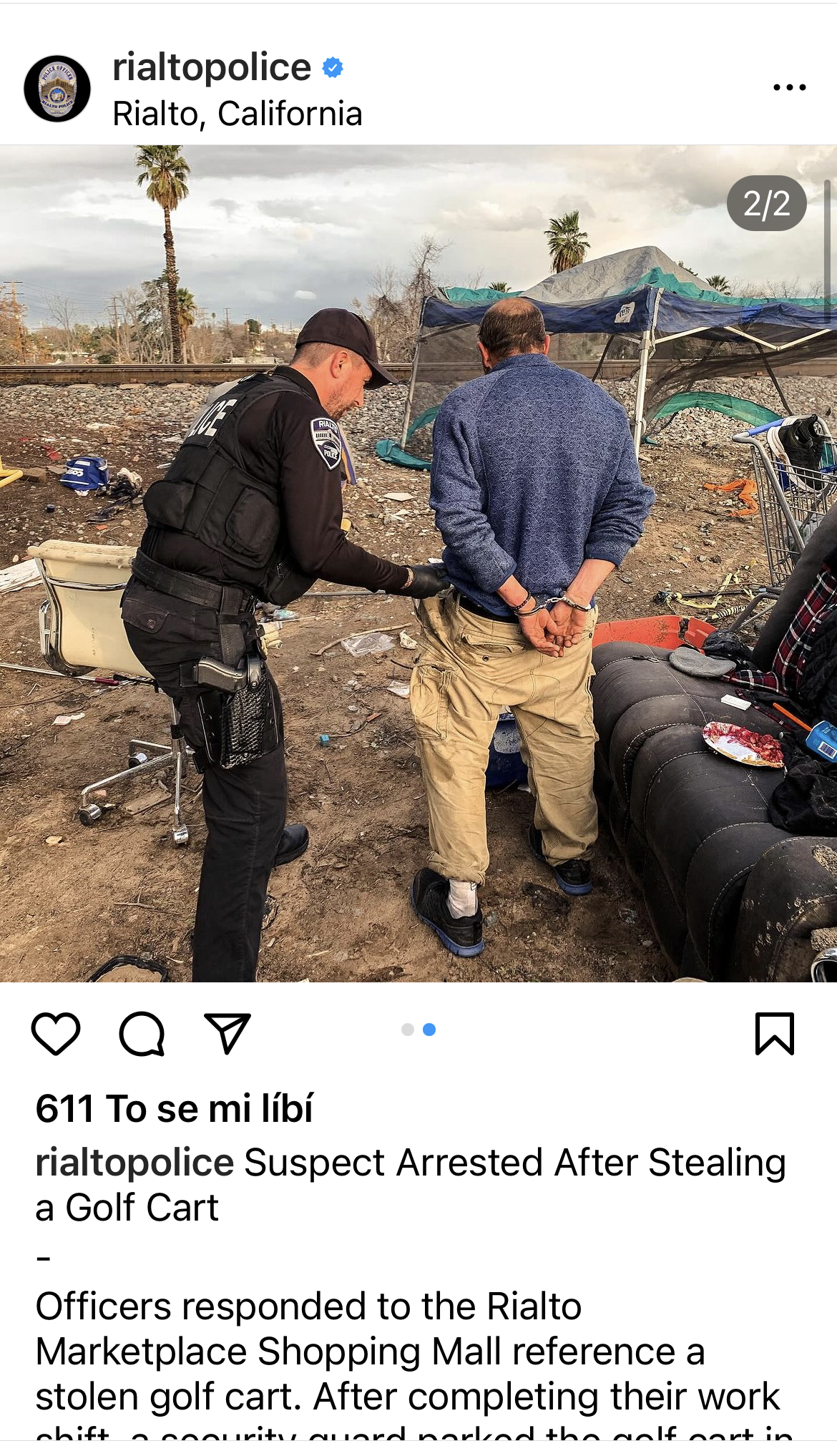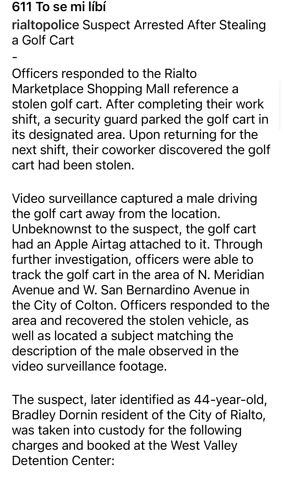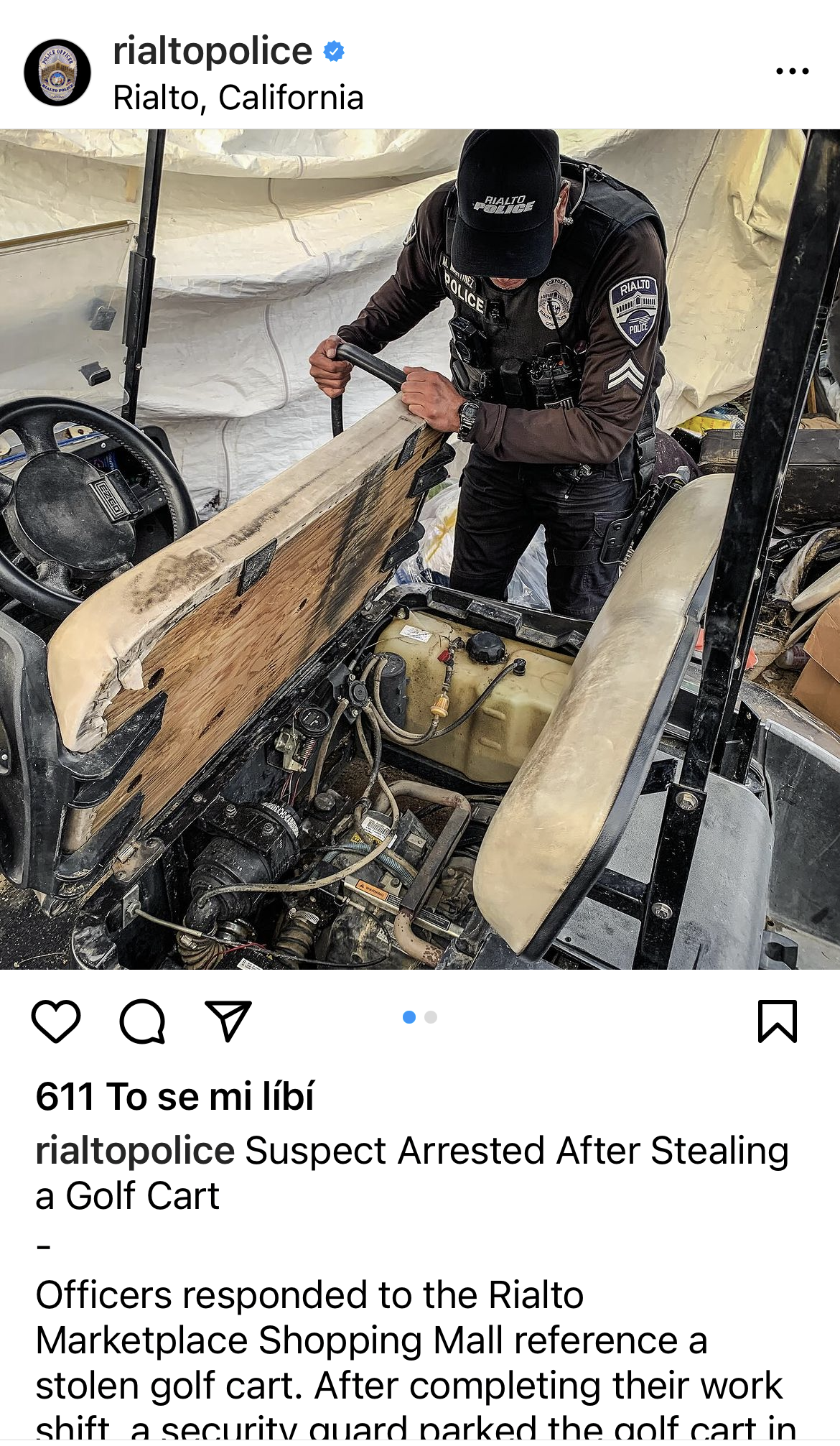 Pokud máte golfový vozík (nebo vlastně cokoli jiného), pravděpodobně byste měli AirTag schovat někam dovnitř. Minulý týden se policejní oddělení v kalifornském městě Rialto podělilo na Instagramu o příběh, jak díky ukrytému lokalizátoru AirTag vypátrali ukradený golfový vozík. Zmíněný příspěvek vysvětluje, že policisté reagovali na hlášení o ukradeném golfovém vozíku v nákupním centru Rialto Marketplace. „Po skončení pracovní směny zaparkoval pracovník ostrahy golfový vozík na určeném místě,“ uvádějí policisté z Rialta. „Po návratu na další směnu jejich spolupracovník zjistil, že golfový vozík byl odcizen.“