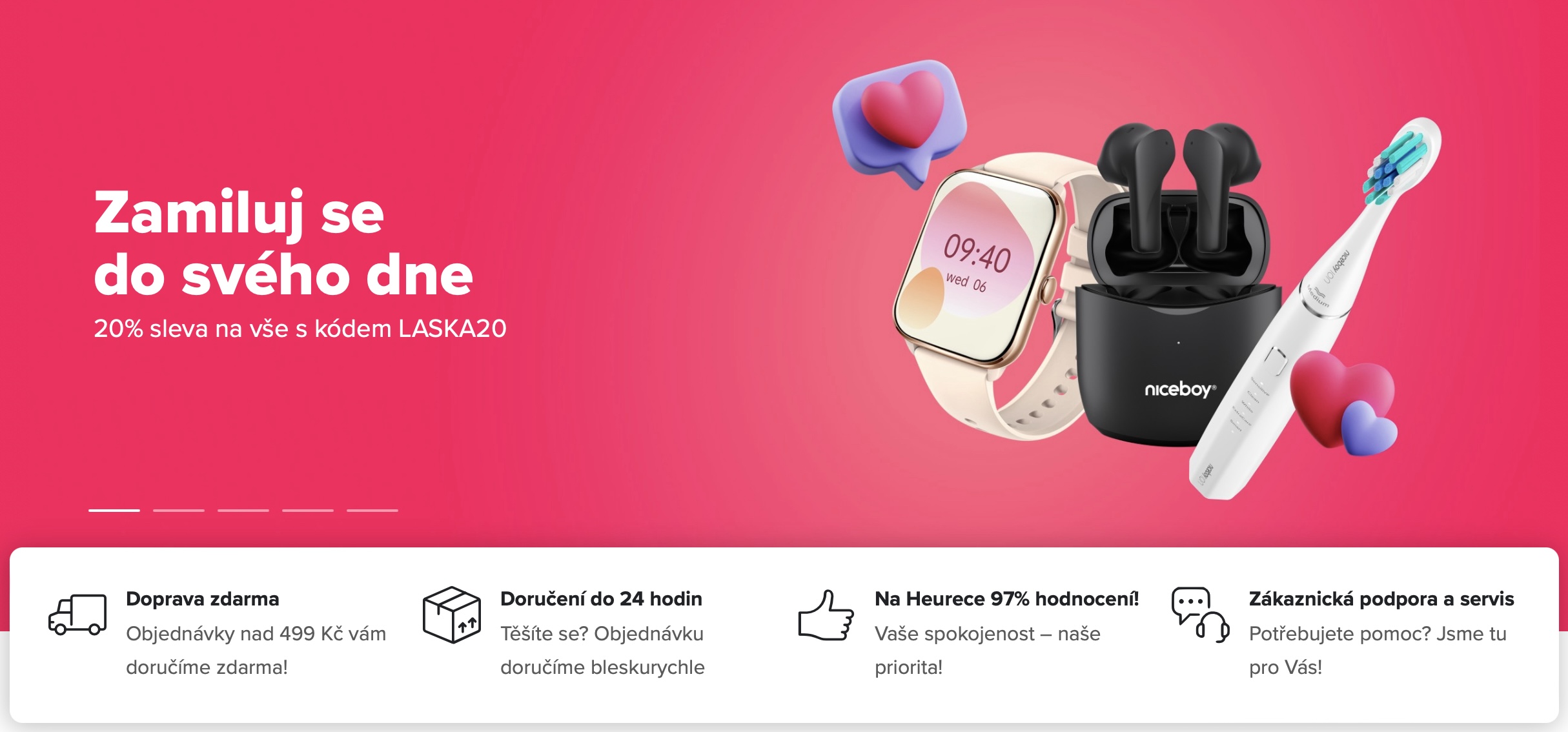 Získání slevy je naprosto jednoduché. Stačí totiž vlastně jen to, abyste v procesu objednávky do pole pro slevový kód zadali kód LASKA20 a sleva 20 % je vaše. Ať už si tedy chcete pořídit nová sluchátka, reproduktor či smartwatch, nebo chcete jít cestou užitečných doplňků typu elektrický zubní kartáček, robotický vysavač či fén, nynější akce Niceboy se rozhodně vyplatí využít. Přeci jen, 20% sleva není vůbec malá – tím spíš, když jí lze zkombinovat s dopravou zdarma u objednávek nad 499 Kč, doručením do 24 hodin (ve všední dny) či skvělou zákaznickou podporou a servisem v případě, že si s daným produktem nebudete tak úplně vědět rady. Je tedy rozhodně o co stát.