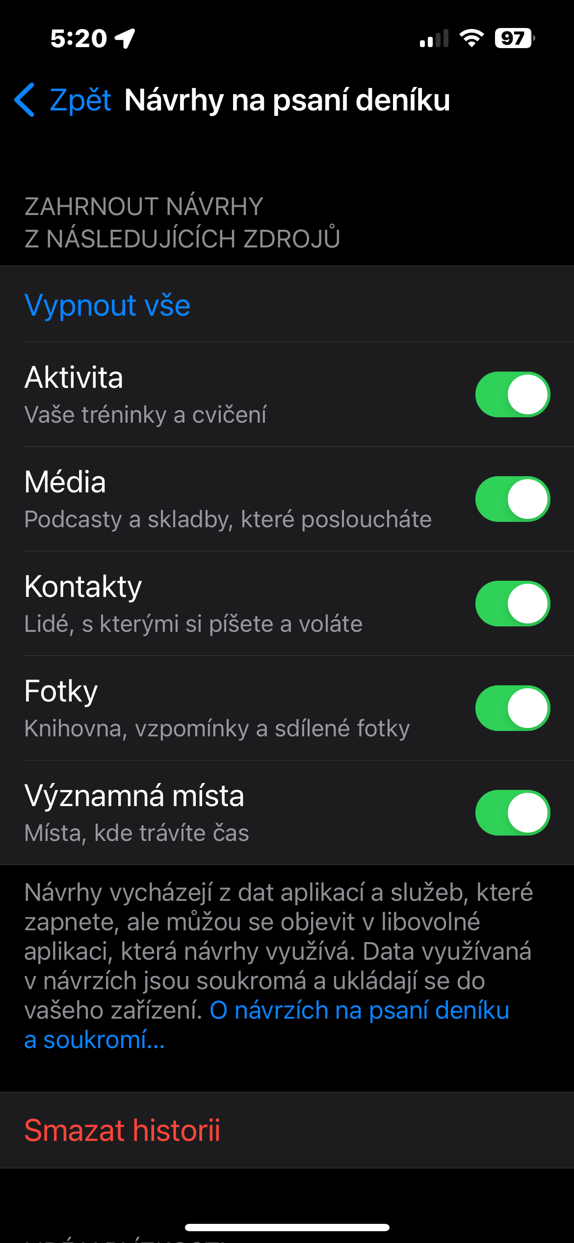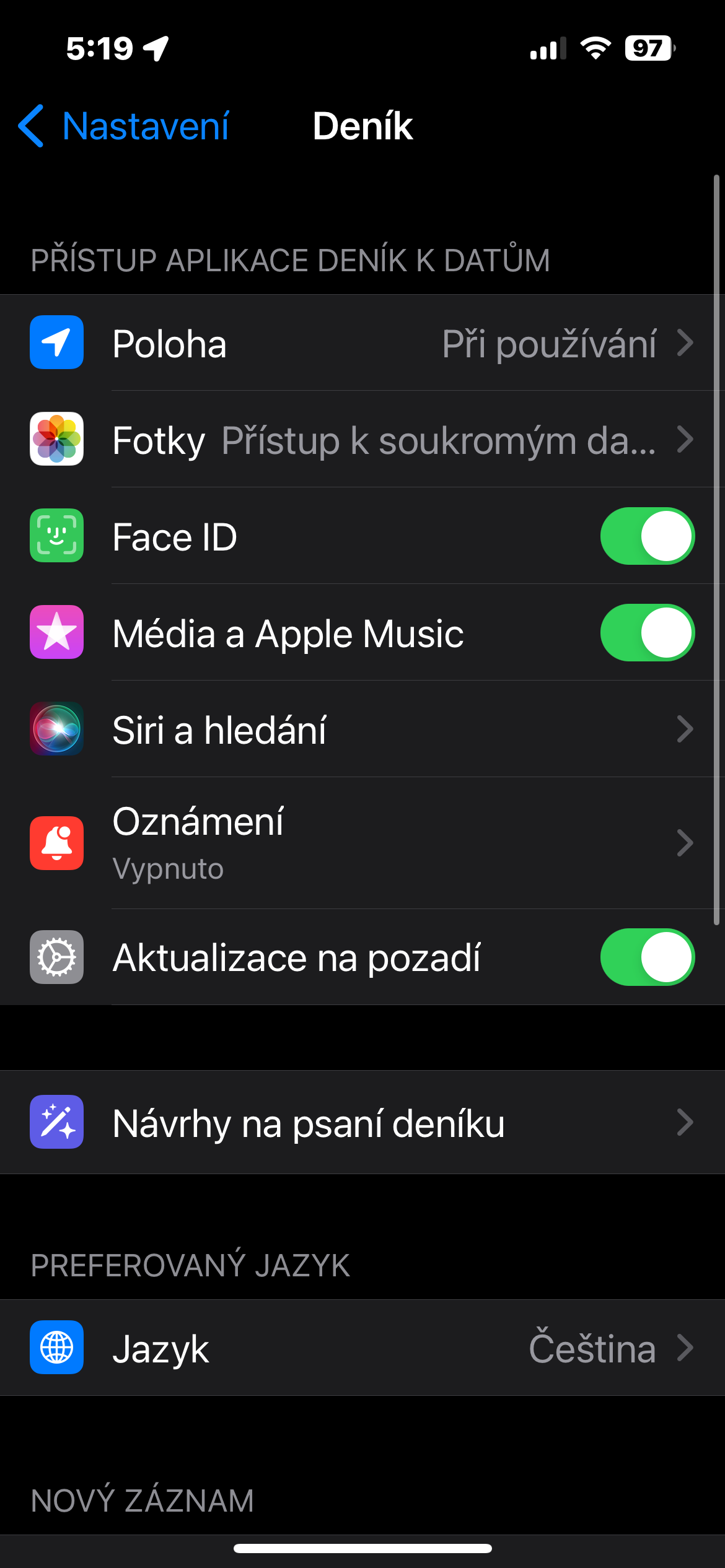 Pokud využíváte novou nativní aplikaci Deník, určitě uvítáte možnost přizpůsobení notifikací. Zamiřte na vašem iPhonu do Nastavení -> Deník, a klepněte na Návrhy na psaní deníku. Zde si můžete nejen nastavit notifikace s připomínkami na nový zápis, ale také přizpůsobit soukromí a určit, jaké položky se mají zahrnovat do návrhů na zápisky.