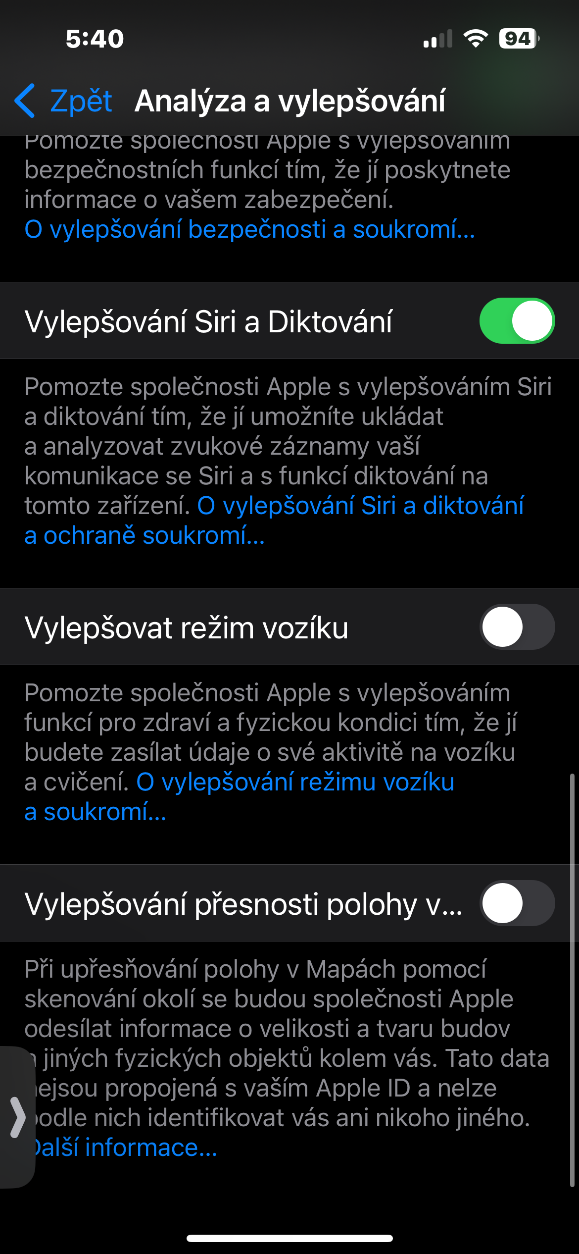 Společnost Apple již nějakou dobu sbírá specifická data z iPhonů v rámci zlepšení AR funkcí své nativní aplikace Apple Maps. Pokud chcete Applu v tomto směru pomoci, můžete v Nastavení -> Soukromí a zabezpečení -> Analýza a vylepšování aktivovat položku Vylepšování přesnosti polohy v AR. Příslušná data nejsou nijak spojená s vaším Apple ID a není tedy možné vás podle nich jakkoliv identifikovat.