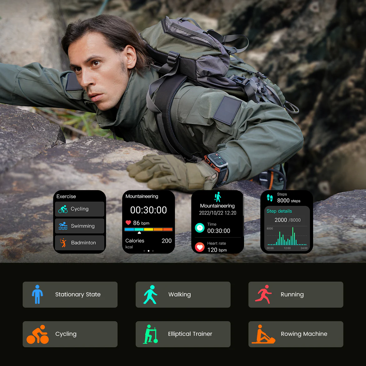 Pokud jde o monitorování sportovních aktivit, chytré hodinky KOSPET TANK T2 pečlivě sledují činnosti jako běh, cyklistika a chůze. Funkce měření tepu je užitečná pro přesné stanovení tepové zóny pro efektivní spalování tuků. Vestavěný krokoměr slouží jako motivace k pohybu a poskytuje přehlednou statistiku. Další jedinečnou funkcí je měření hladiny saturace krve kyslíkem. Jinými slovy, jedná se o opravdu výkonné hodinky, které nabízejí širokou škálu funkcí.