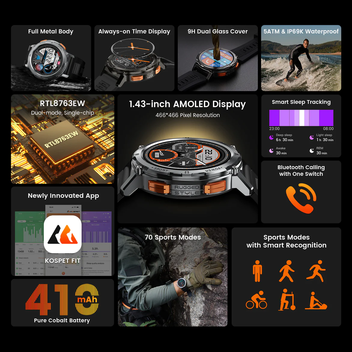 U chytrých hodinek KOSPET TANK T2 se tradiční hodinové funkce, jako je zobrazení času ve formátu 12/24 hodin, ukazatel data a upozornění na SMS, kombinují s pokročilými funkcemi, včetně sledování aktivity, krokoměru, měření rychlosti, tempa a tepové frekvence. Celková váha tohoto modelu je 71 g. Hodinky lze snadno propojit s telefony s operačními systémy Android a iOS pomocí technologie Bluetooth. Nechybí ani funkce sledování spánku, která poskytuje informace o hloubce spánku a bdění, a pomáhá zlepšit odpočinek a získat více energie během dne. Vestavěná baterie těchto chytrých hodinek by měla při standardním používání vydržet minimálně 360 hodin, což eliminuje obavy z vybití baterie během aktivity.