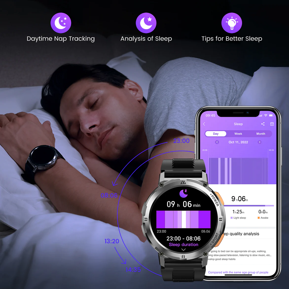 KOSPET TANK M2 jsou plně kompatibilní s operačními systémy Android a iOS a komunikují pomocí technologie Bluetooth. Jednou z nejzajímavějších funkcí je sledování spánku, které monitoruje délku fáze REM a hloubku spánku, což pomáhá optimalizovat odpočinek a předcházet nedostatku spánku. Baterie poskytuje dostatečnou energii pro běžné používání až 360 hodin. Kromě sledování spánku účinně monitorují také různé aktivity, jako je běh, cyklistika a chůze. Funkce měření tepové frekvence pomáhá přesně určit tepovou zónu a zvyšuje efektivitu cvičení, zatímco krokoměr slouží jako motivace k pohybu. Mezi dalšími funkcemi těchto hodinek patří například měření saturace krve kyslíkem.