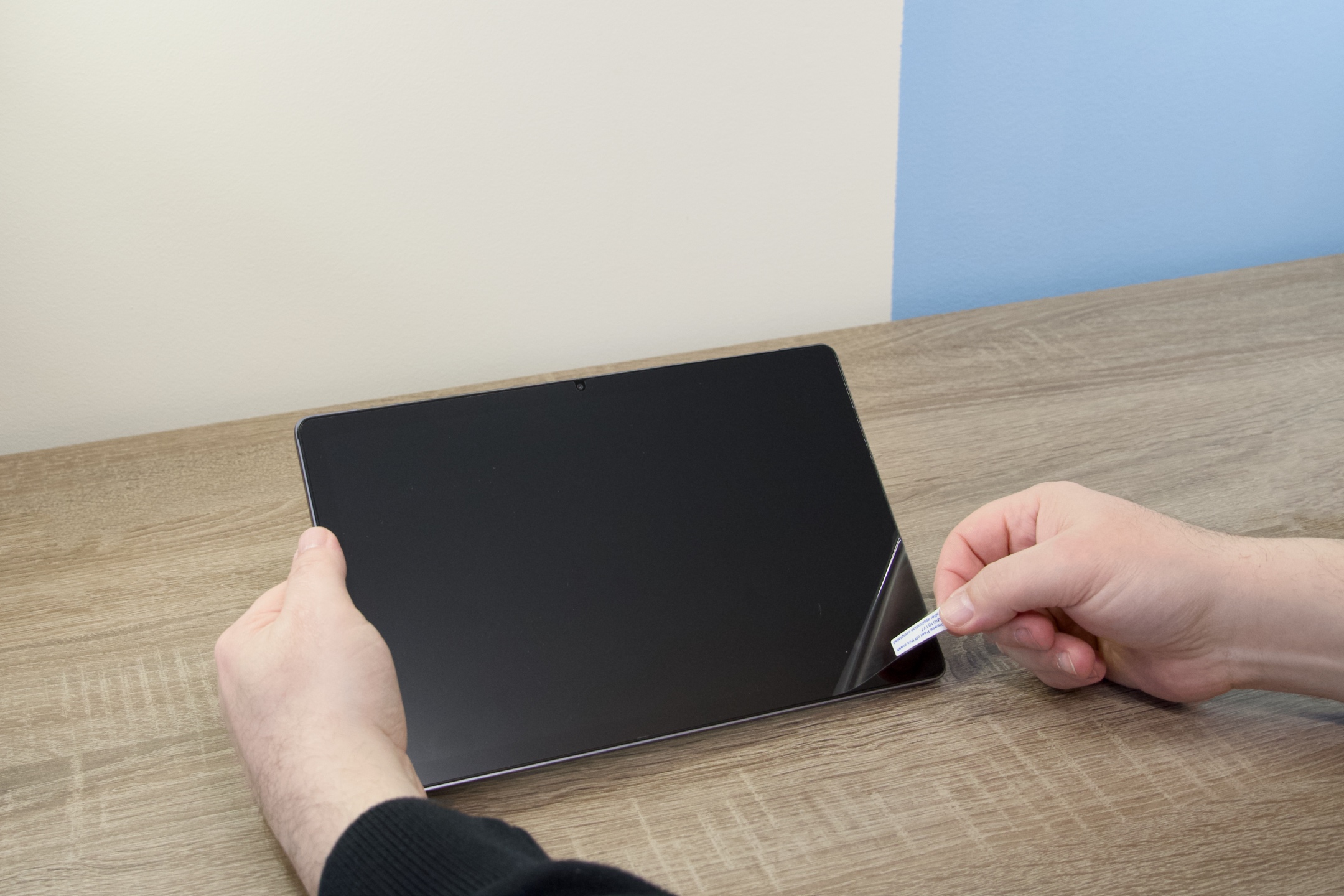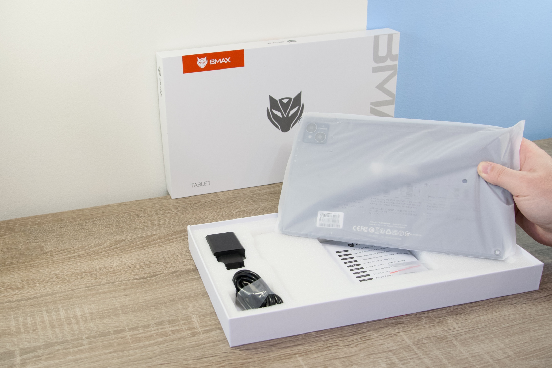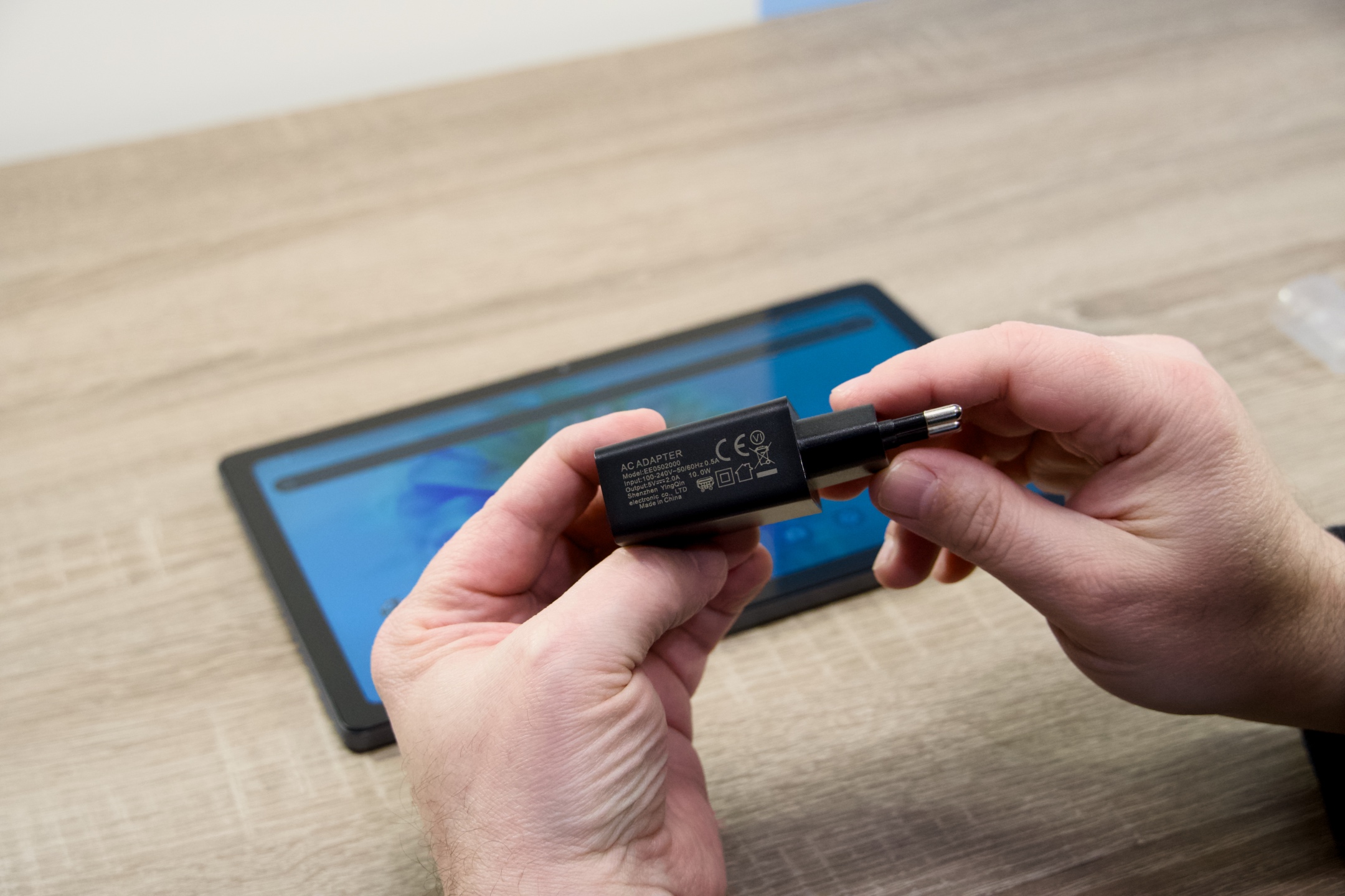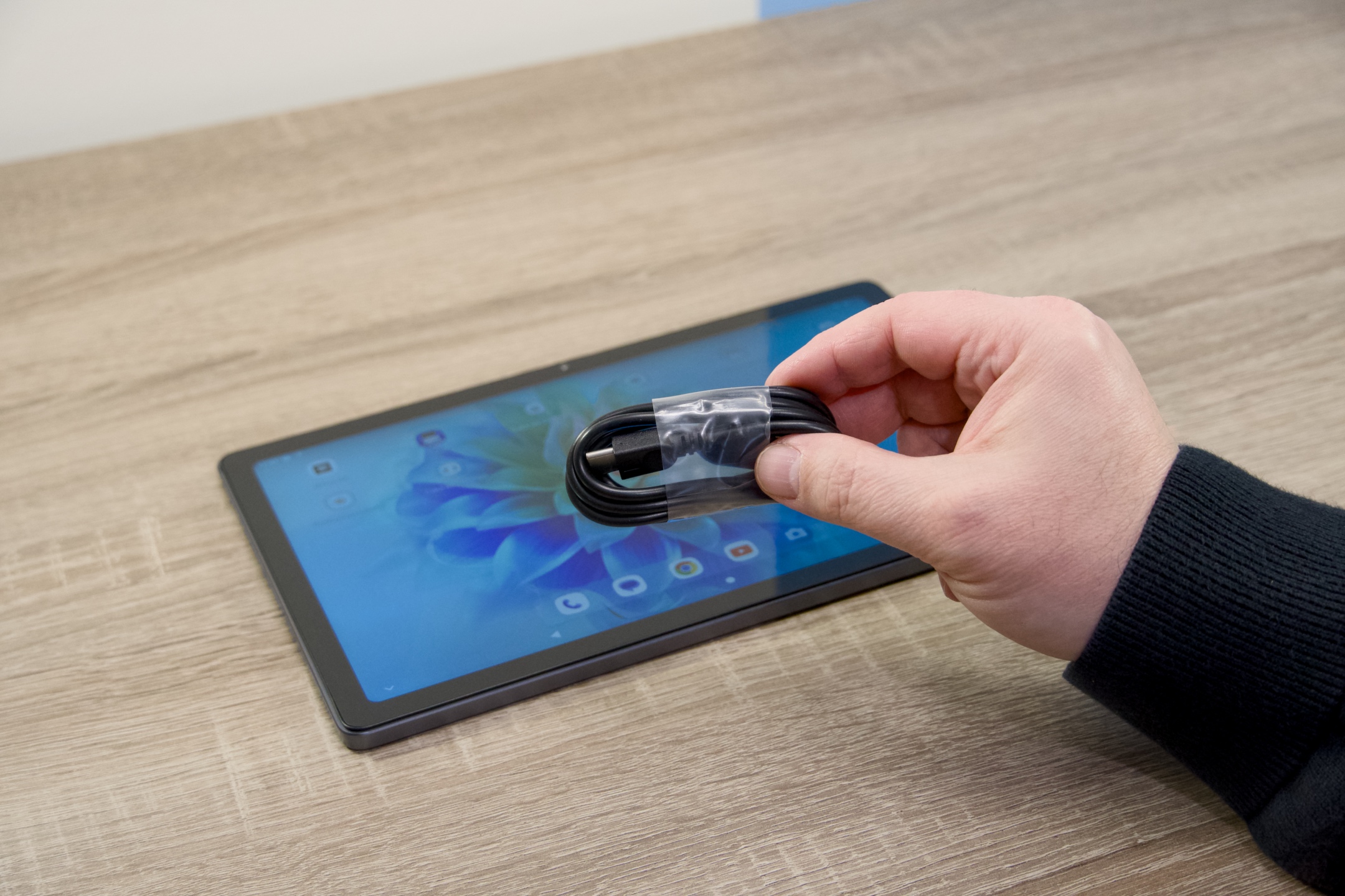 Uvnitř krabice se nachází kromě tabletu samotného vše potřebné, konkrétně kabel USB-A na USB-C, nabíječka, dokumentace a jehla pro vysunutí slotu pro Nano SIM i Micro SD kartu. Fyzickými proporcemi 247 mm do šířky, 157 mm na výšku a 8,3 mm do hloubky s hmotností 433 g je to tablet tak akorát do ruky.