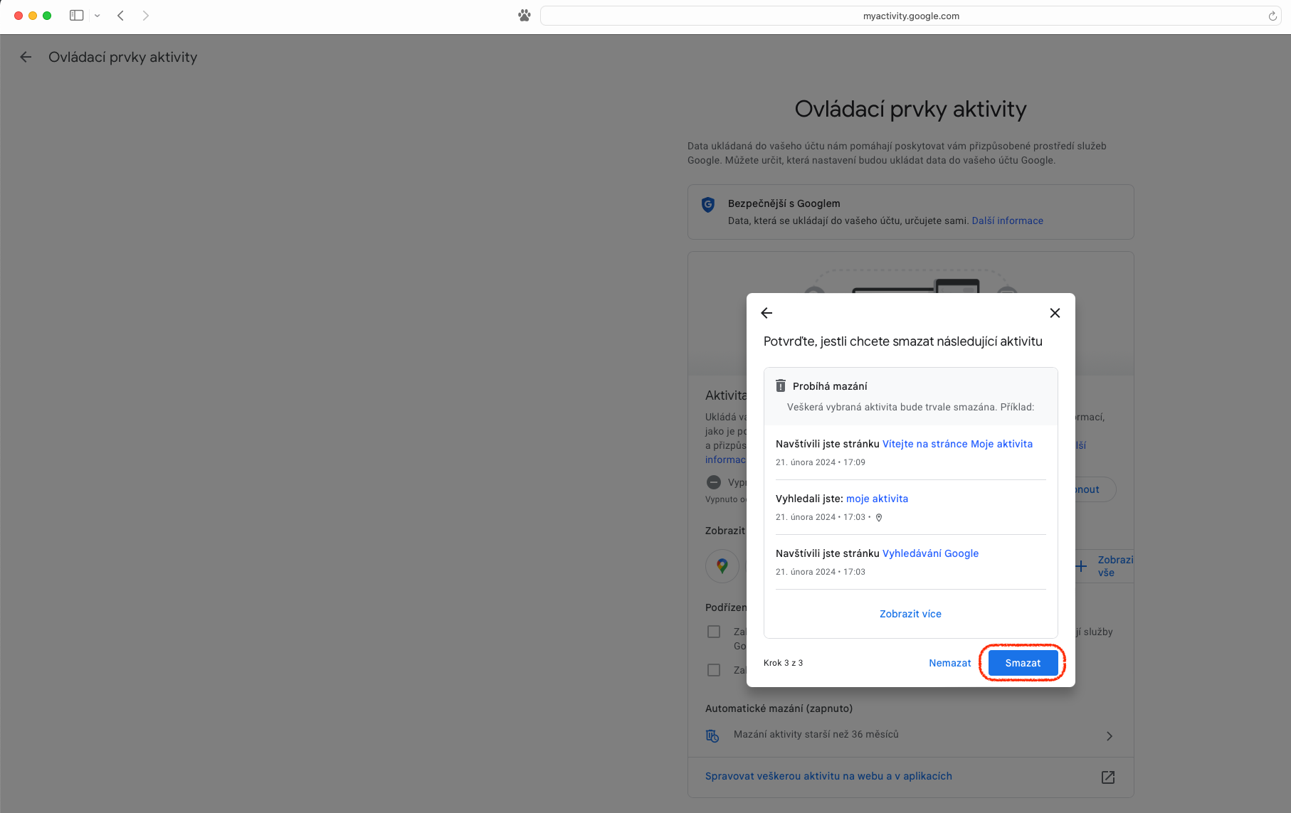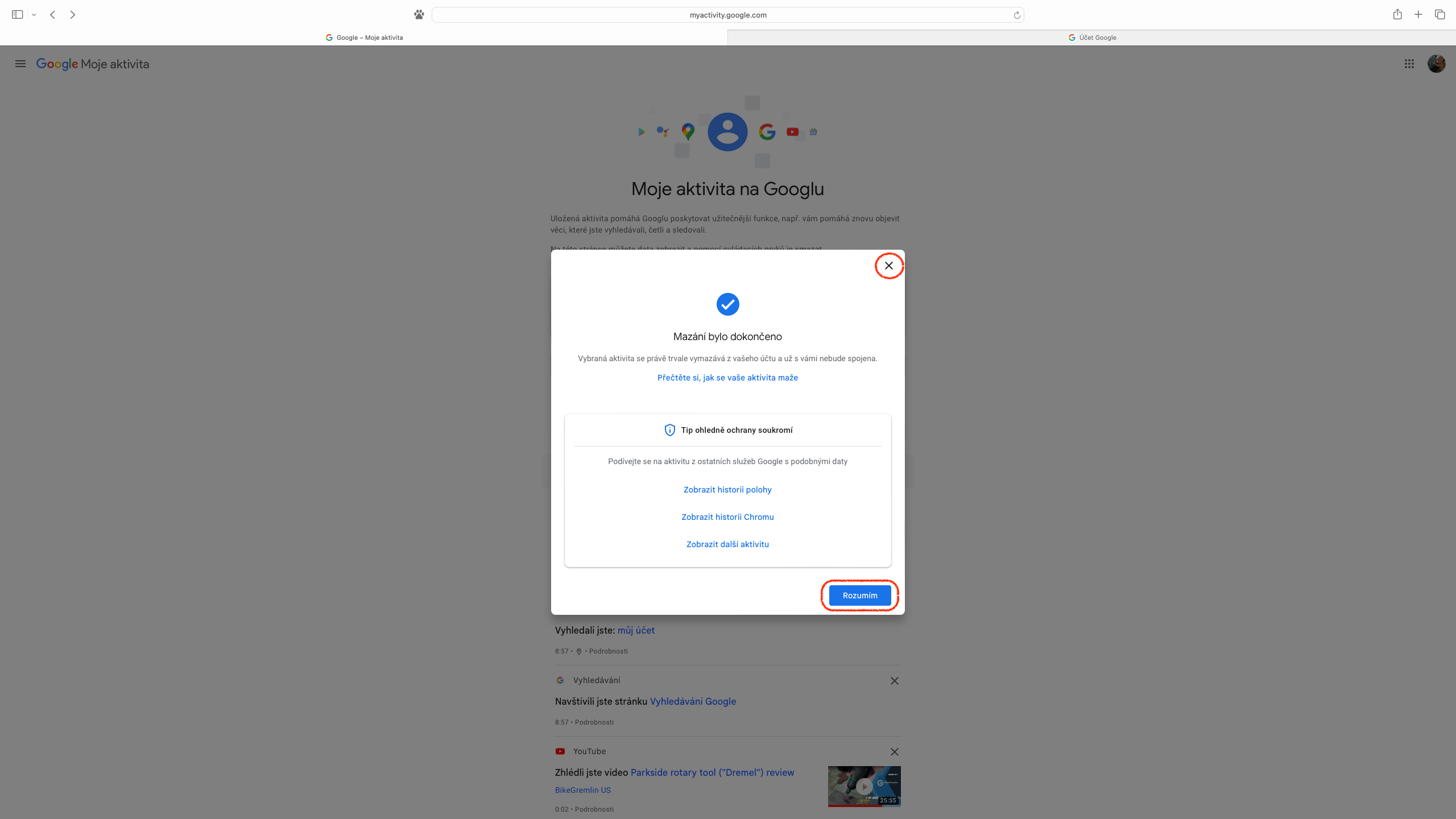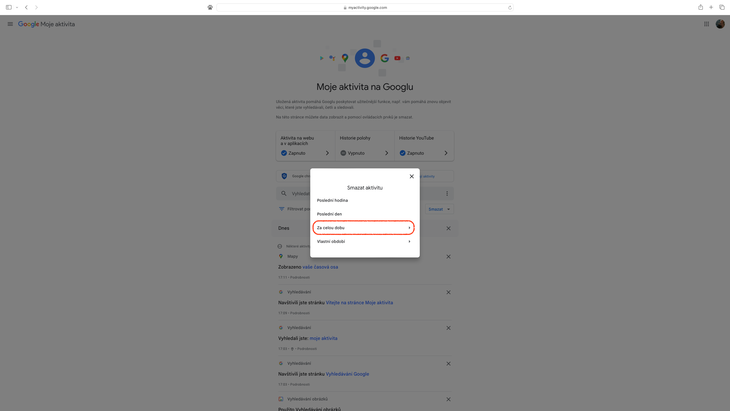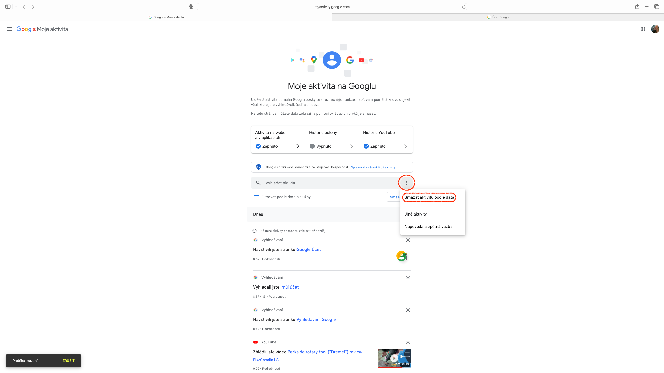 Pro ty, které udivilo množství dat, která jsou propojena s účtem Google a pojali záměr svou webovou aktivitu vymazat kompletně, je na stránce „Moje aktivita“ k dispozici ikona se třemi svislými tečkami v pravé části pole „Vyhledat aktivitu“. Z rozevřené nabídky stačí vybrat „Smazat aktivitu podle data“ a dále zvolit „Za celou dobu“. Následně opět můžeme určit, zda tak chceme učinit pro veškeré služby, nebo pouze pro jejich část. Předposledním úkonem je tlačítko „Smazat“, na které navazuje výpis provedených změn, přičemž seznámení se s nimi zbývá potvrdit přes položku „Rozumím“, případně zobrazené informace zavřít křížkem.