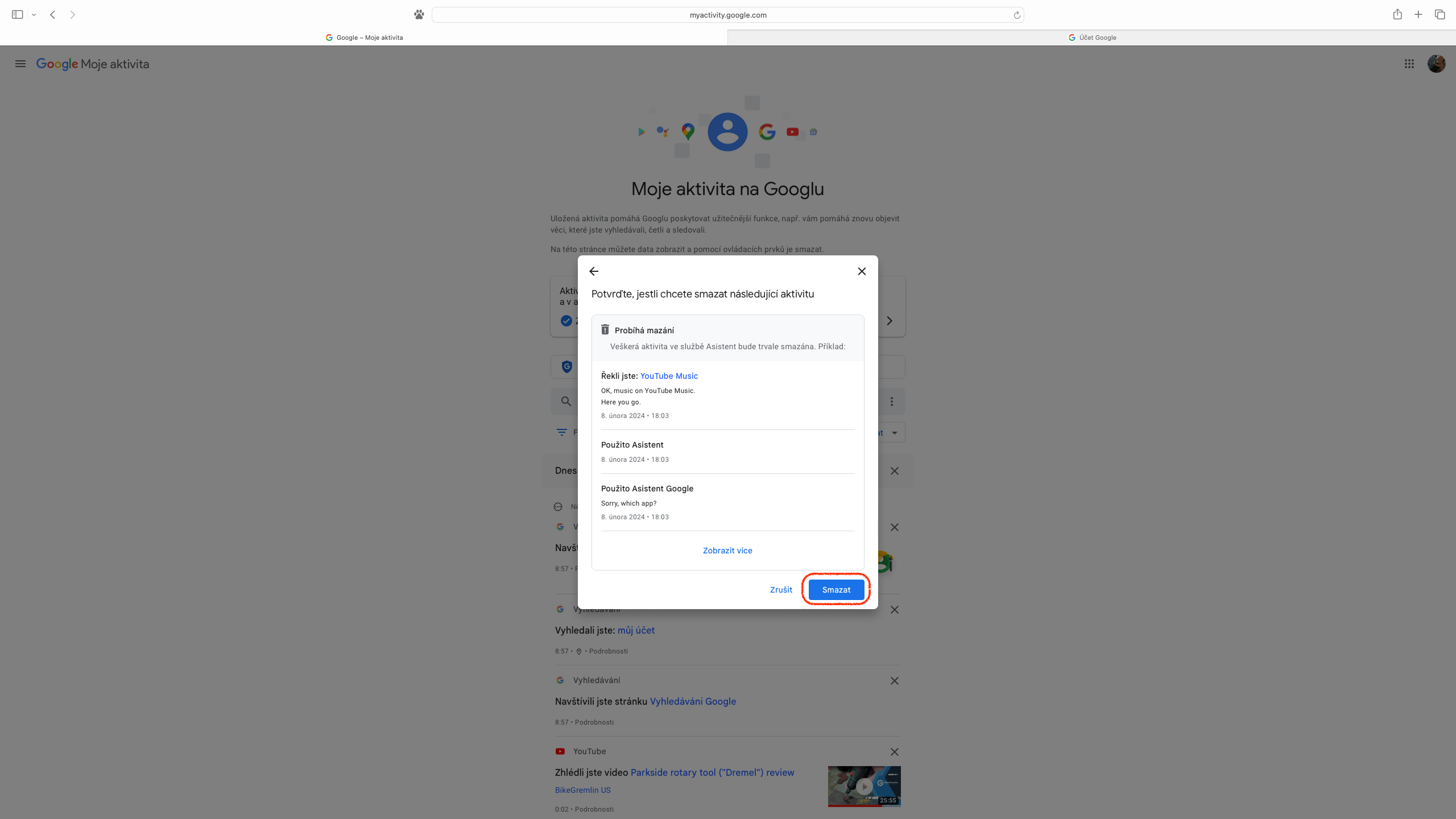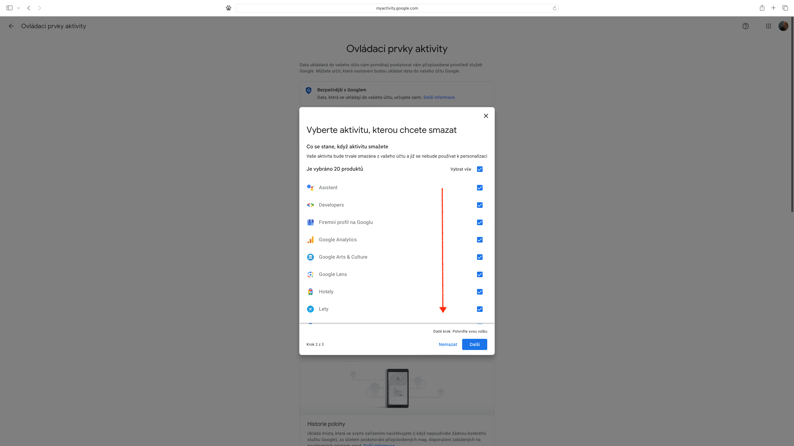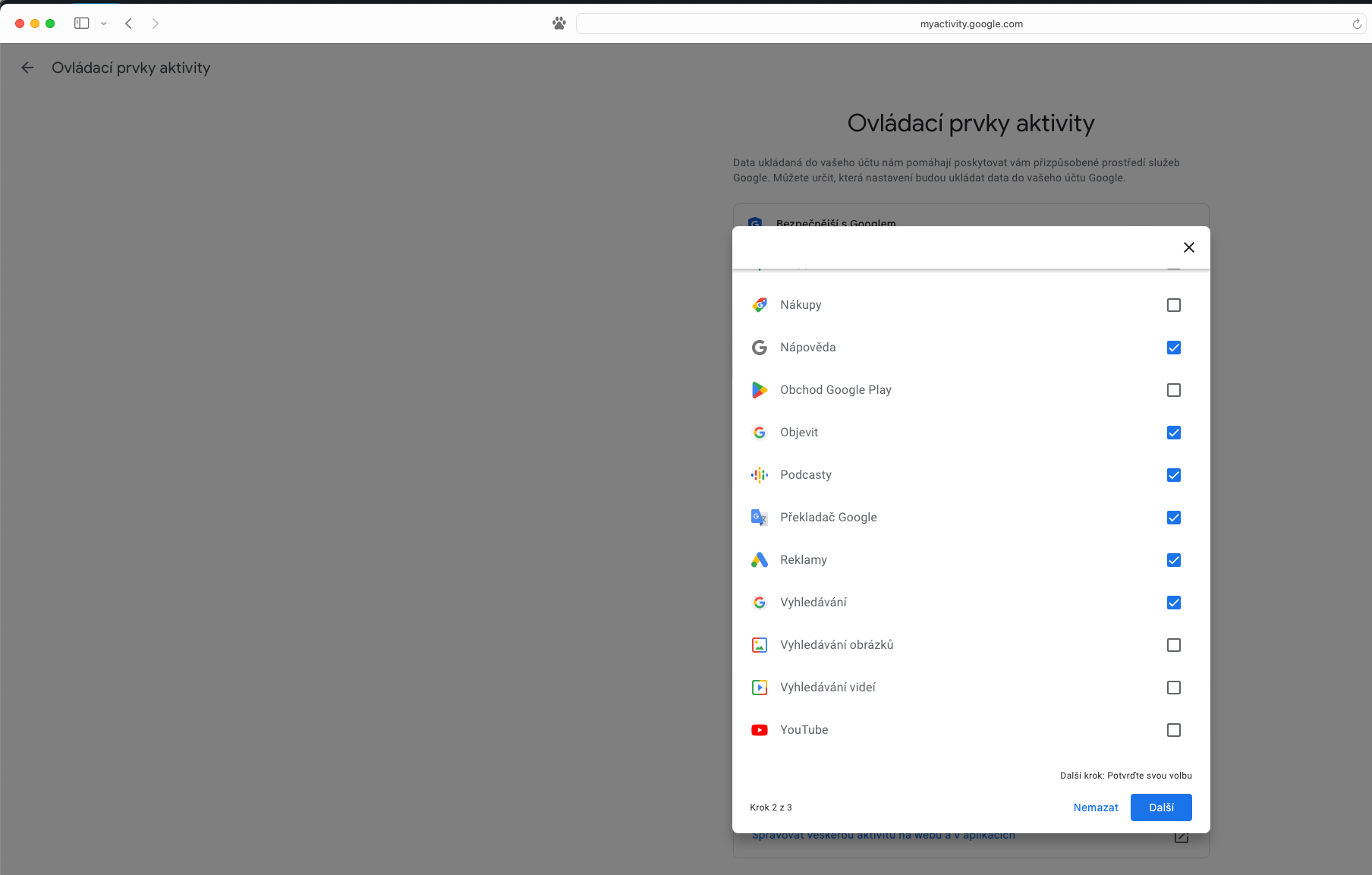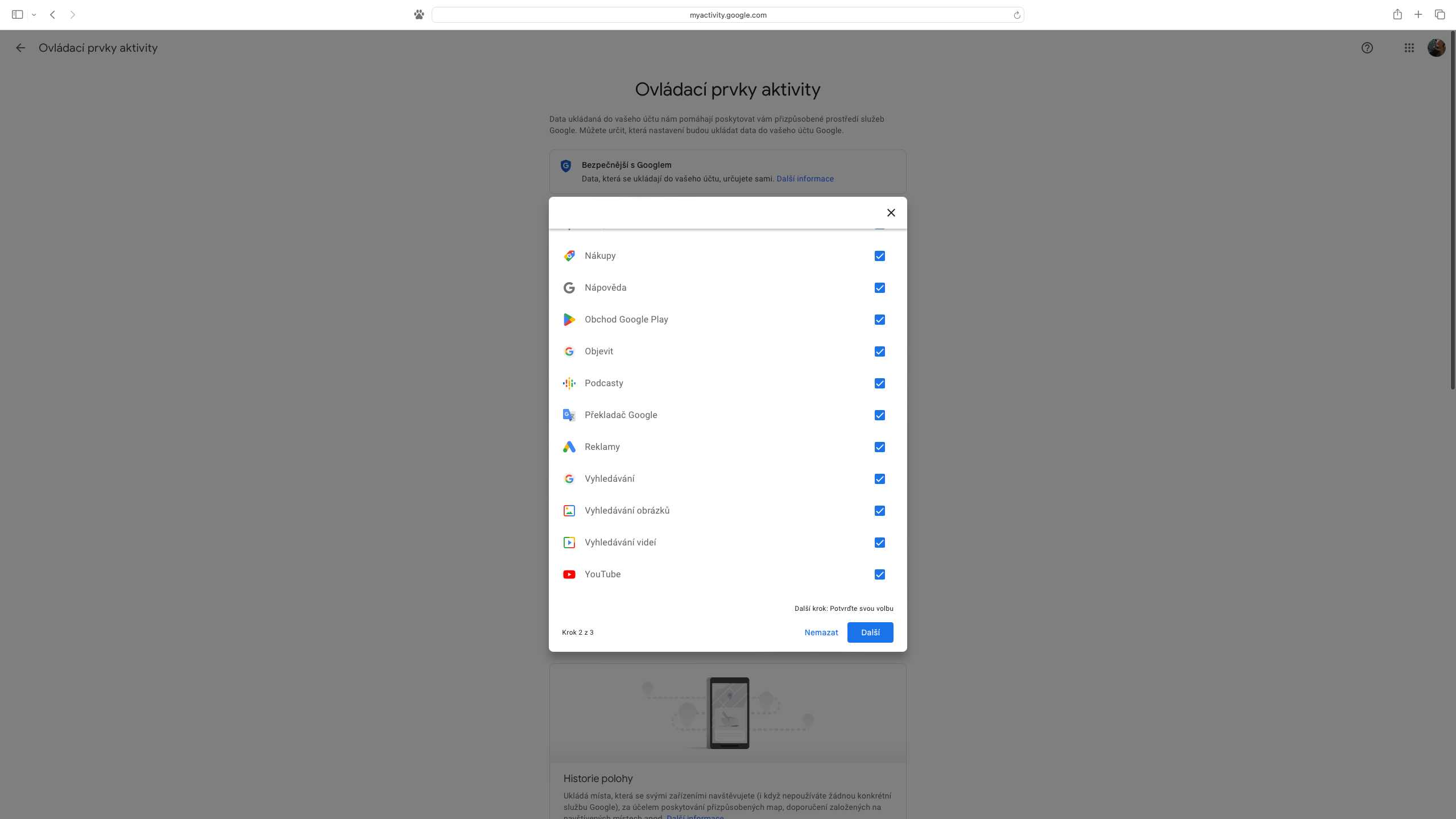 Pro ty, které udivilo množství dat, která jsou propojena s účtem Google a pojali záměr svou webovou aktivitu vymazat kompletně, je na stránce „Moje aktivita“ k dispozici ikona se třemi svislými tečkami v pravé části pole „Vyhledat aktivitu“. Z rozevřené nabídky stačí vybrat „Smazat aktivitu podle data“ a dále zvolit „Za celou dobu“. Následně opět můžeme určit, zda tak chceme učinit pro veškeré služby, nebo pouze pro jejich část. Předposledním úkonem je tlačítko „Smazat“, na které navazuje výpis provedených změn, přičemž seznámení se s nimi zbývá potvrdit přes položku „Rozumím“, případně zobrazené informace zavřít křížkem.
