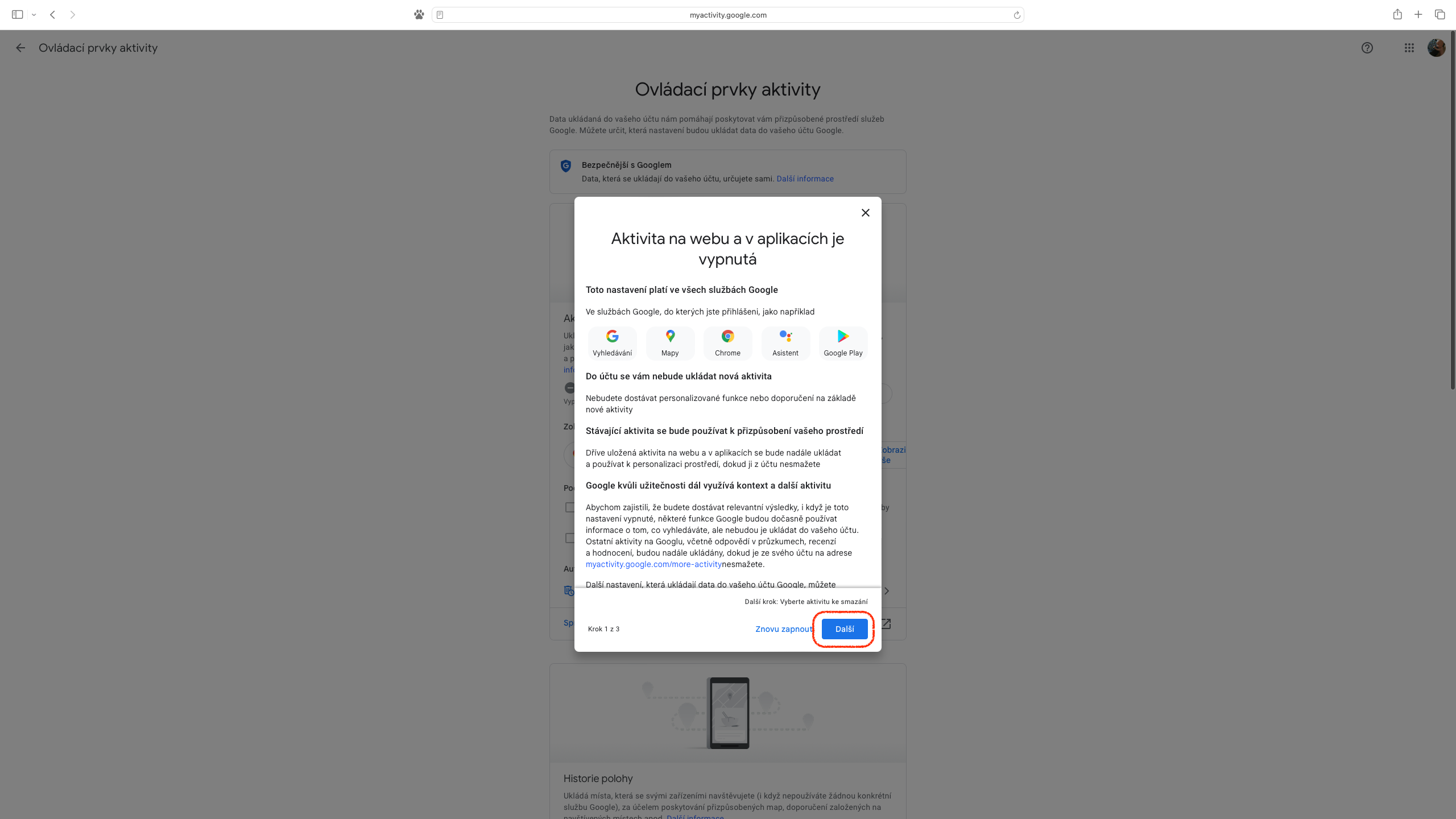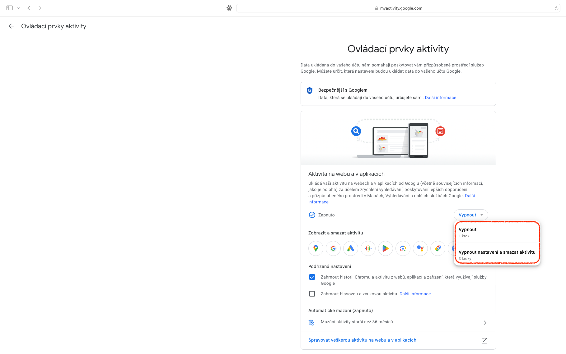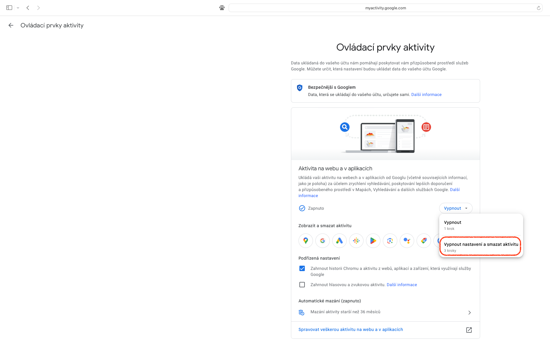 K ukončení monitorování slouží v oddílu „Aktivita na webu a v aplikacích“ tlačítko „Vypnout“. Po kliknutí se objeví výběr „Vypnout (1 krok)“ nebo „Vypnout nastavení a smazat aktivitu (3 kroky)“. Zvolíme-li první variantu, pak budeme po jediném kliknutí informováni o ukončení, což je ještě třeba potvrdit přes „Rozumím“. Druhá možnost funguje obdobně, ale nabízí vytvoření selekce údajů spojených s konkrétními službami či aplikacemi, které budou zachovány a těch, jež budou odstraněny.