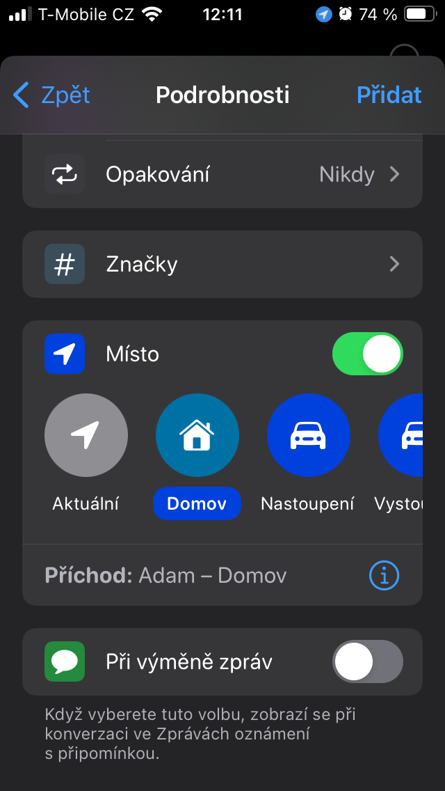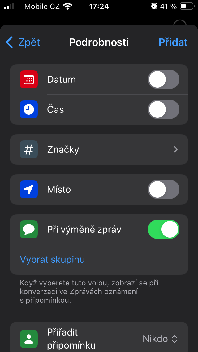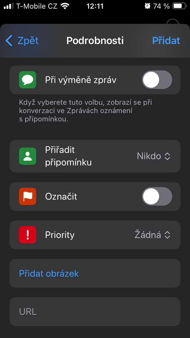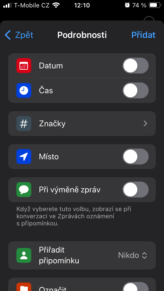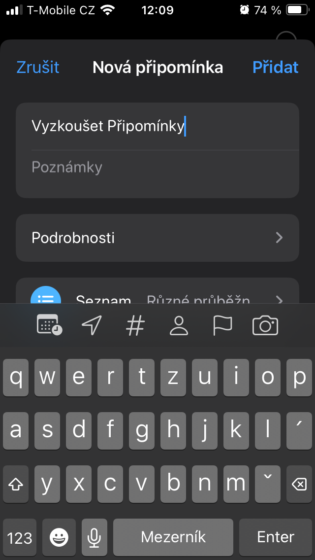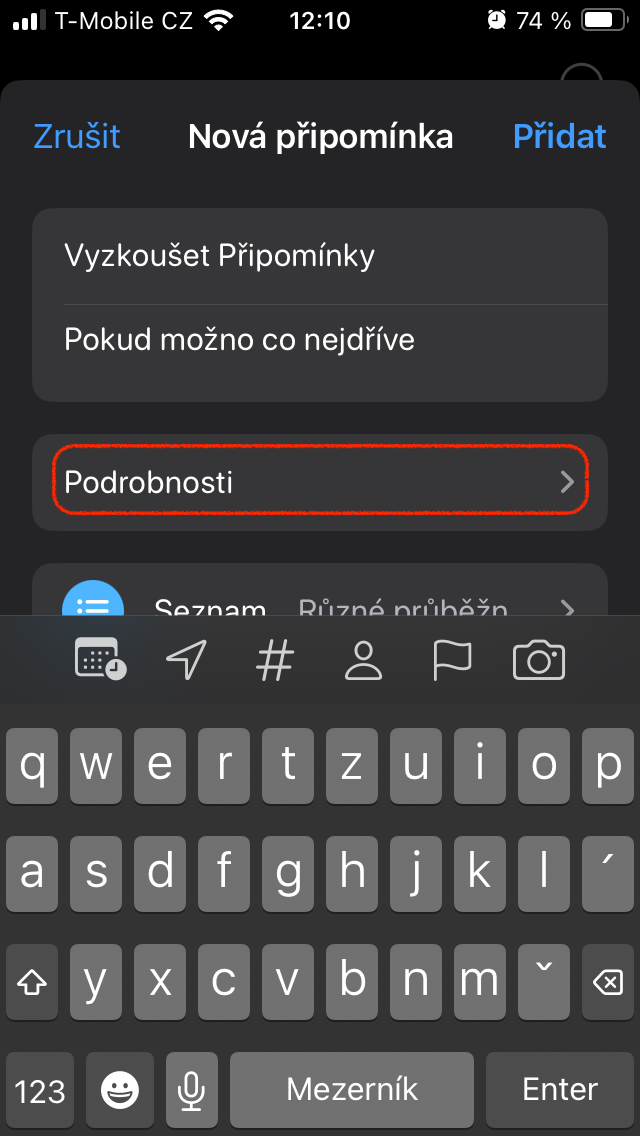 4. Přes „Podrobnosti“ si připomínku přizpůsobte, naplánujte datum a čas, přidejte místo nebo vytvořte značku, (s níž docílíte uspořádání též na základě klíčových slov).