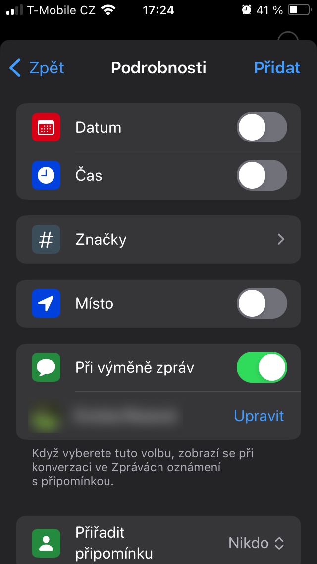 Méně používanou podmínkou pro obdržení připomínky je její návaznost na zaslání zprávy konkrétní osobě, například když se jí nechcete zapomenout zeptat na oblíbené jídlo, kterým byste ji rádi překvapili s večeří, čehož docílíte prostřednictvím aktivace přepínače vedle položky „Při výměně zpráv“ a výběrem kontaktu.