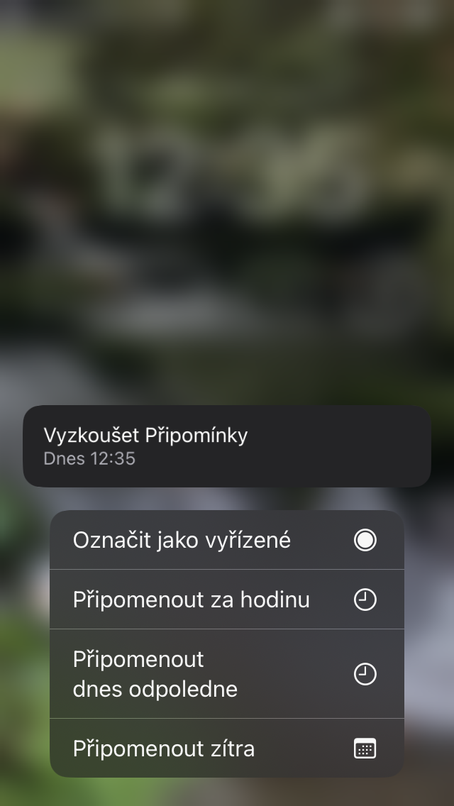 Dle zadaných parametrů vám zařízení odešle upozornění, které zůstane na obrazovce, dokud jej neoznačíte jako splněné. Podržením můžete také zvolit, aby se znovu zobrazilo za hodinu, později tentýž den (například dnes odpoledne) nebo zítra.