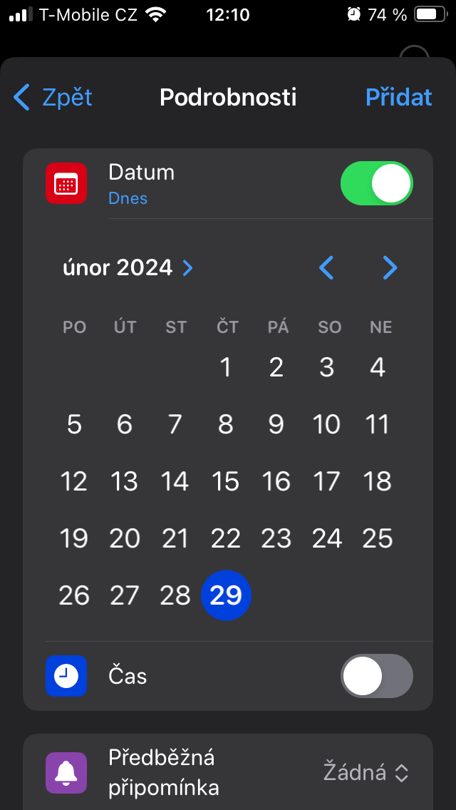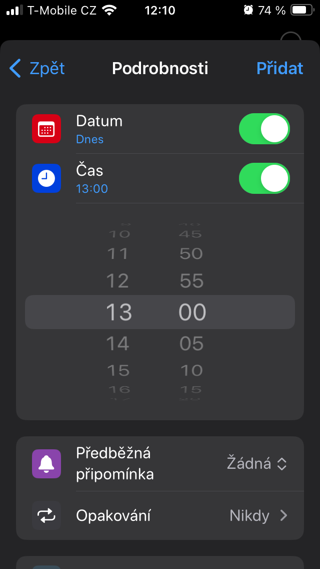 Chcete-li nastavit datum platnosti připomenutí, při jeho vytváření klepněte na kartu „Podrobnosti“ a prostřednictvím tlačítek „Datum“ a „Čas“ zvolte požadovaný termín. U již vytvořeného záznamu můžete také parametry upravit, a to přes symbol „i“ na konci řádku.