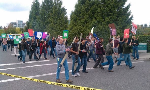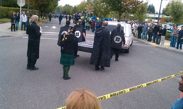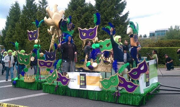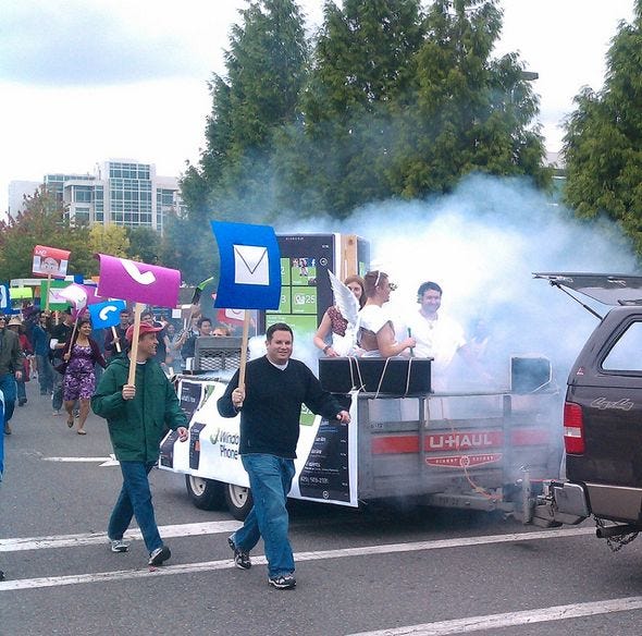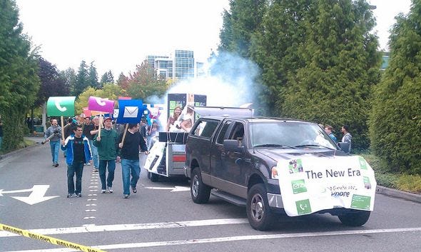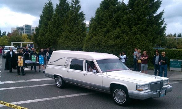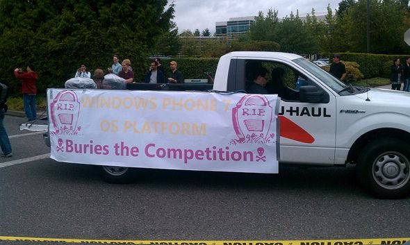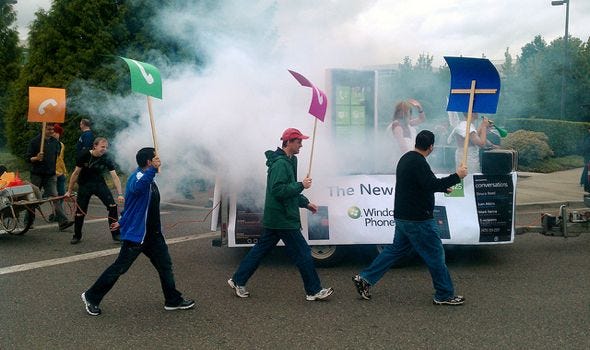 Byl srpen roku 2010, a areál kampusu v Redmondu byl poněkud živější než v kterýkoliv jiný den. Nejednalo se ale o žádný svátek nebo karneval – kampusem procházel podivný pohřební průvod, který se ovšem v mnoha ohledech podobal průvodu masopustnímu. Nechyběli v něm zaměstnanci Microsoftu, odění do černé barvy a vyzdobení ikonickým logem „oken“, obří makety konkurenčních chytrých mobilních telefonů, ale také pohřební limuzína, alegorický vůz, lidé v prapodivných kostýmech a hráči na nejrůznější nástroje včetně dud. Zaměstnanci Microsoftu, opilí nadšením z právě dokončeného operačního systému Windows Phone 7, se tímto způsobem rozhodli symbolicky „pohřbít“ konkurenci v podobě iPhonu a BlackBerry.