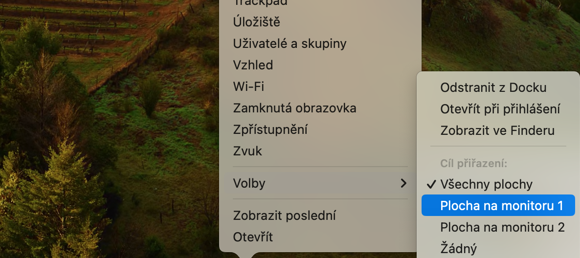 Přiřazení aplikace k ploše zajistí, že se aplikace bude vždy otevírat v tomto prostoru. Přejděte do Docku a klikněte na ikonu aplikace pomocí klávesy Ctrl nebo pravým tlačítkem myši. Pokud se aplikace v doku nenachází, otevřete ji a přeneste její ikonu do doku. Poté v menu zvolte, které ploše (případně plochám) chcete aplikaci přiřadit.