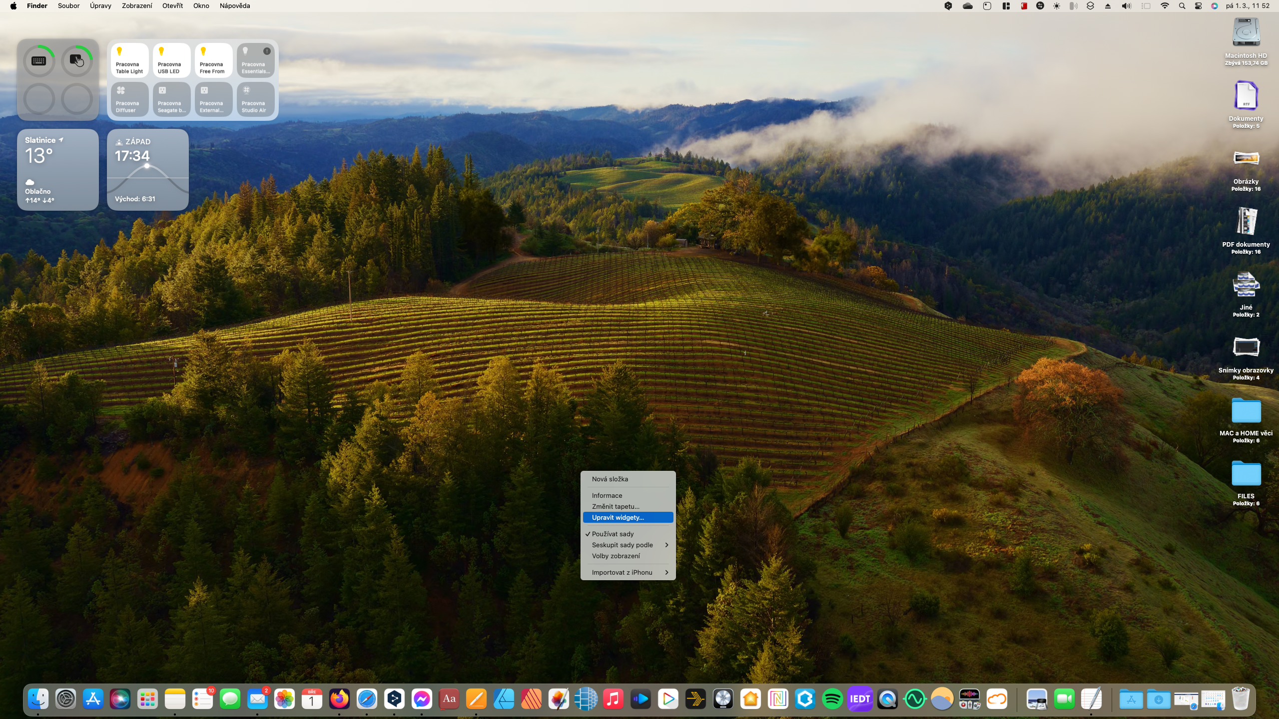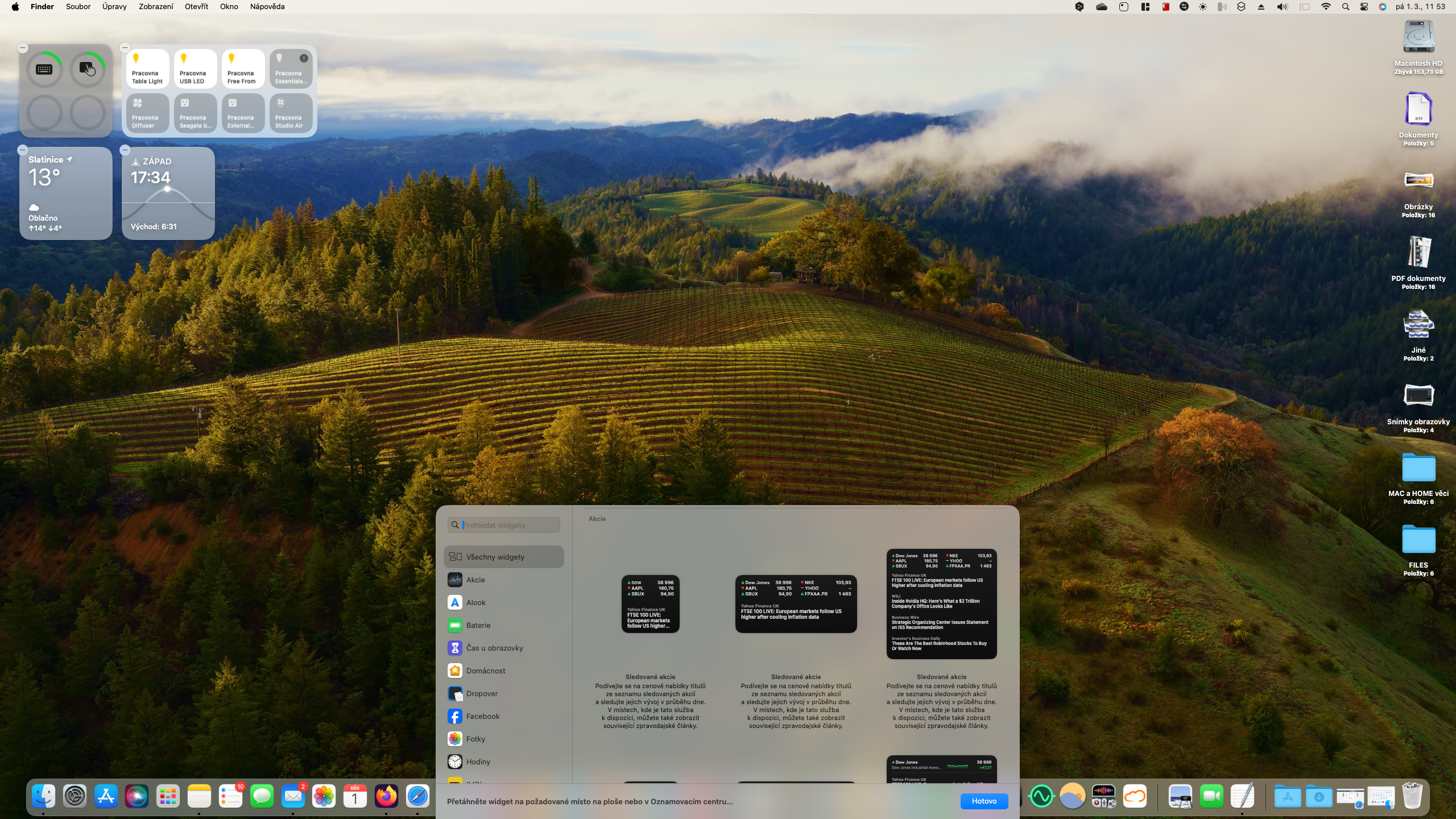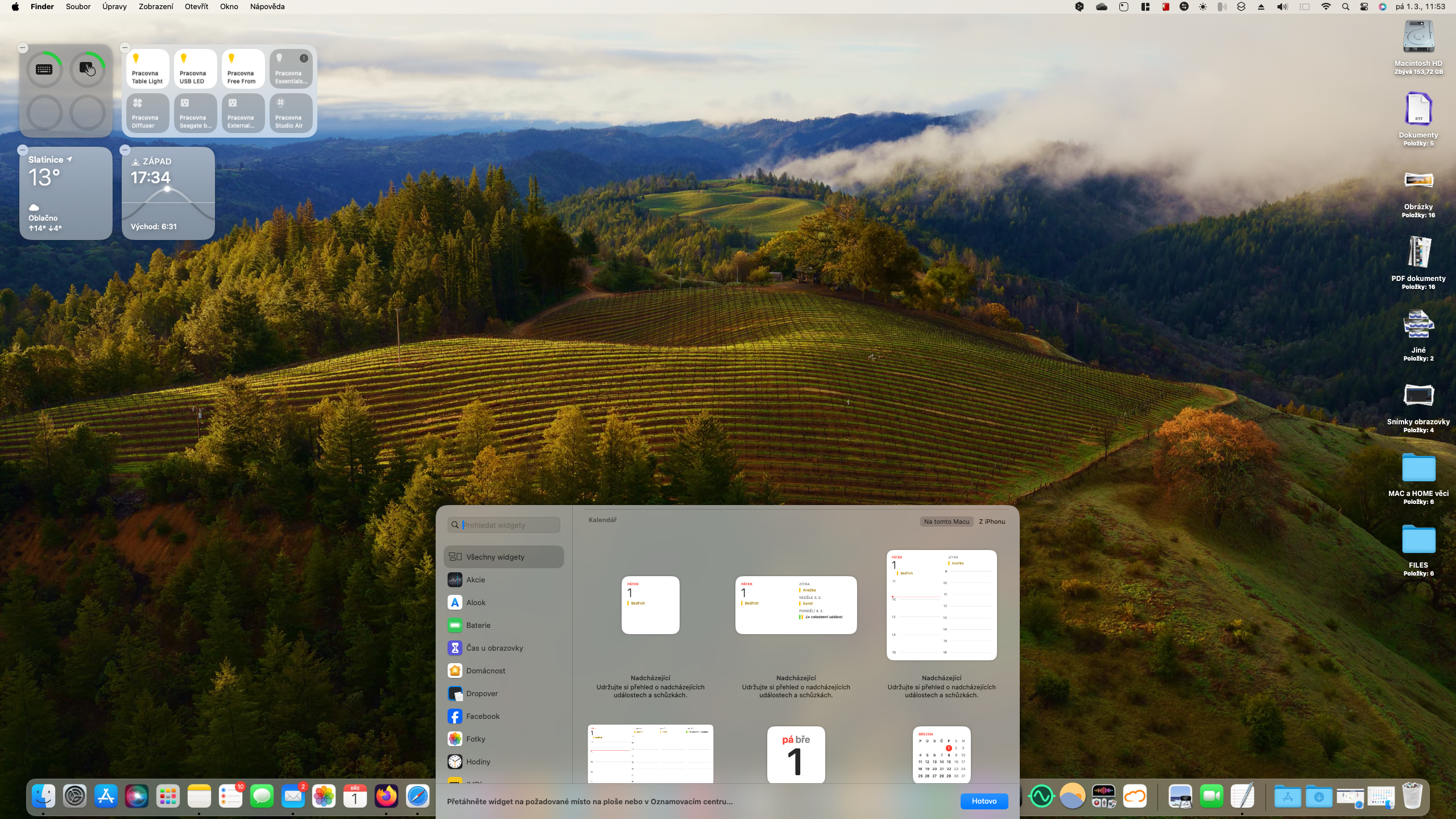 Pro přidání widgetů klepněte pravým tlačítkem myši na plochu macOS Sonoma a z nabídky vyberte „Upravit widgety“. Od spodního okraje obrazovky na vás vyskočí rozhraní, kde si můžete zvolit dle vaší aktuální potřeby. Nechybí ani pole vyhledávání ke zúžení výběru.