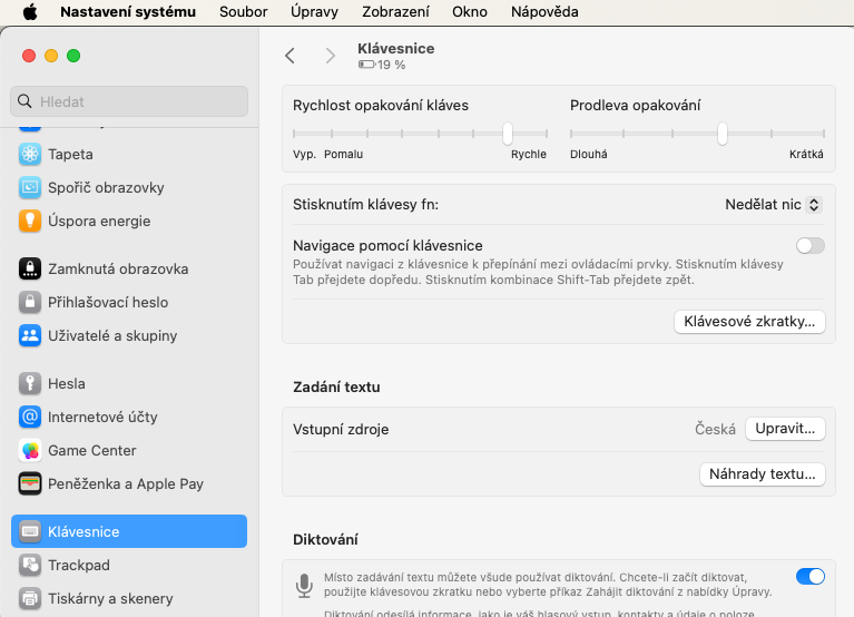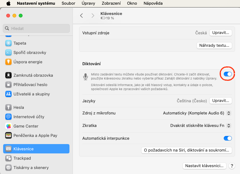 Pro aktivaci vstupte do Nastavení systému a skrolujte dolů ke „Klávesnici“, kde v oddílu „Diktování“ zapnete k tomu určený přepínač, případně vyberete Zdroj mikrofonu.