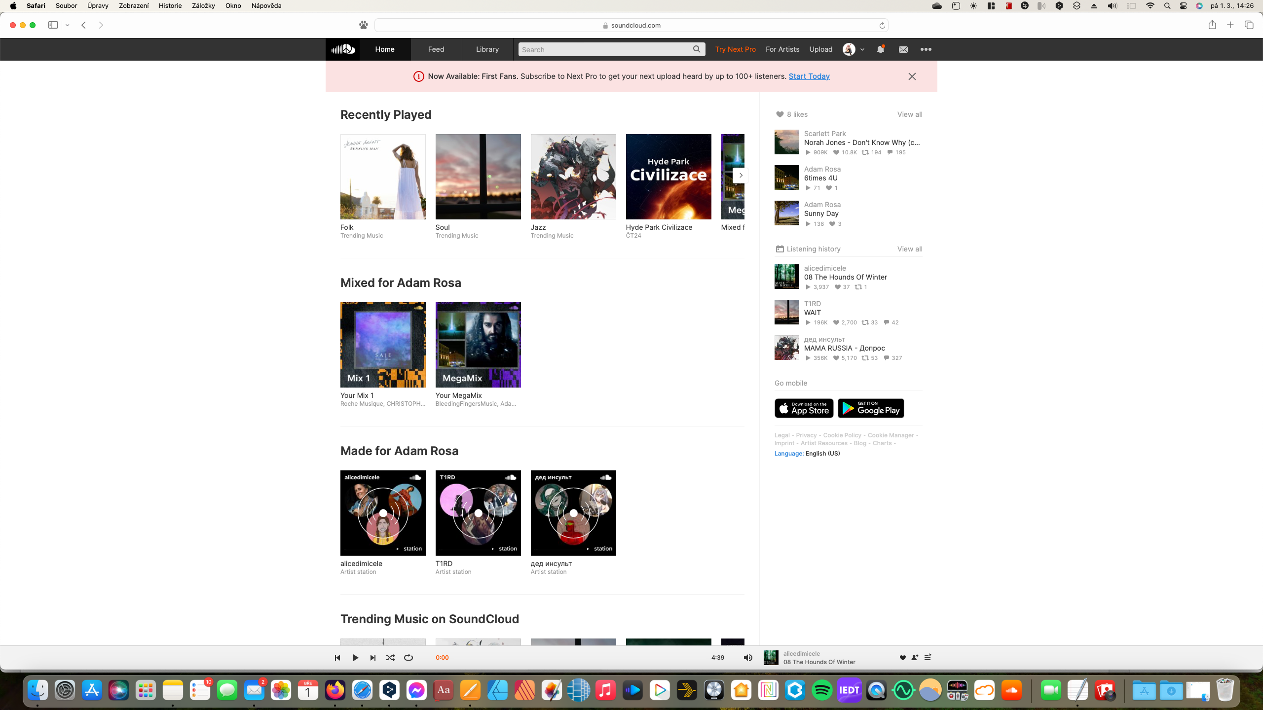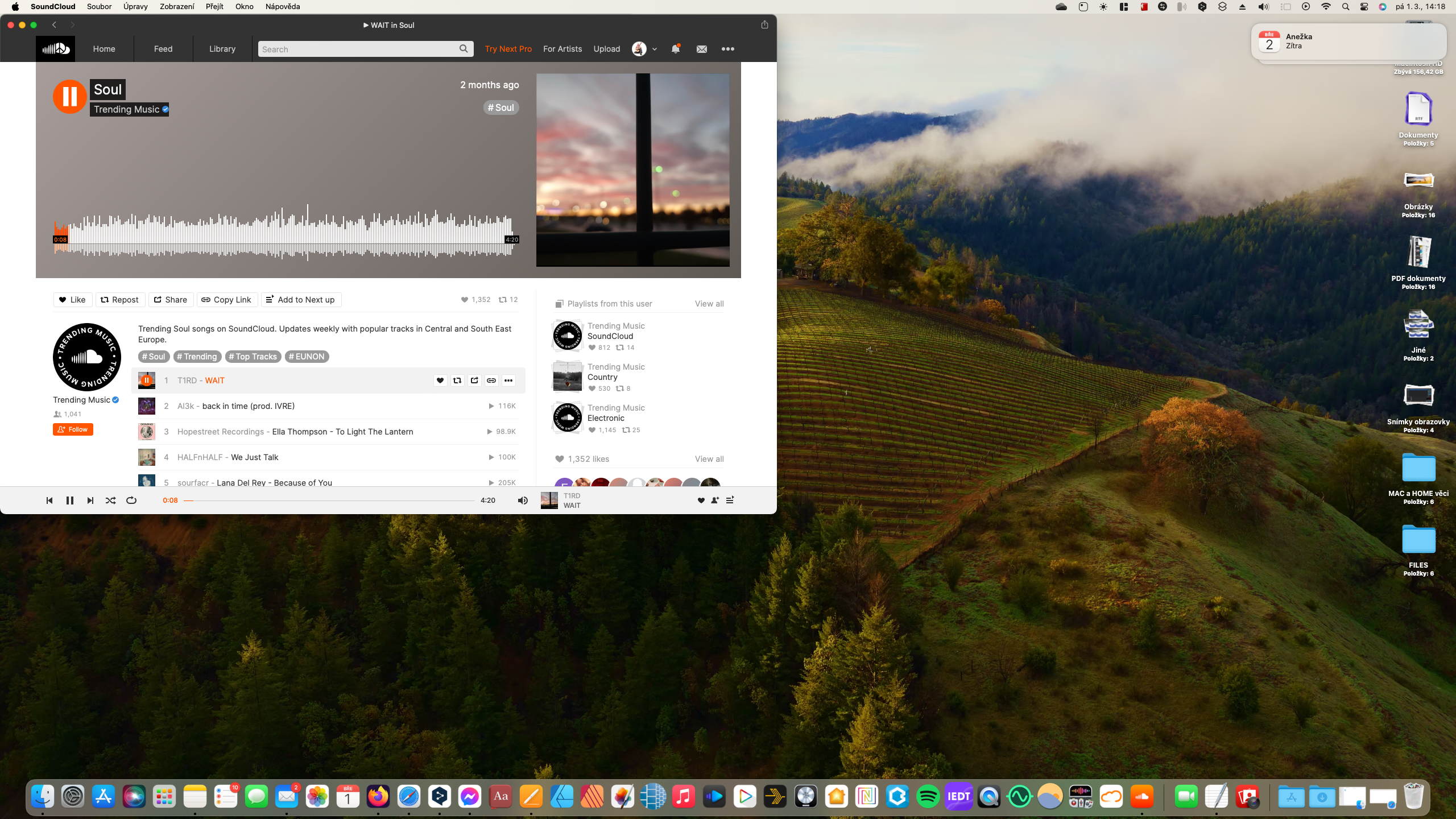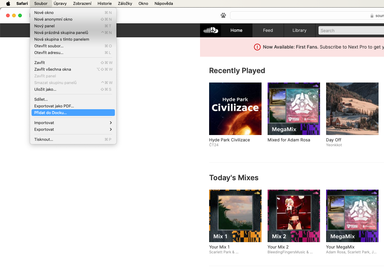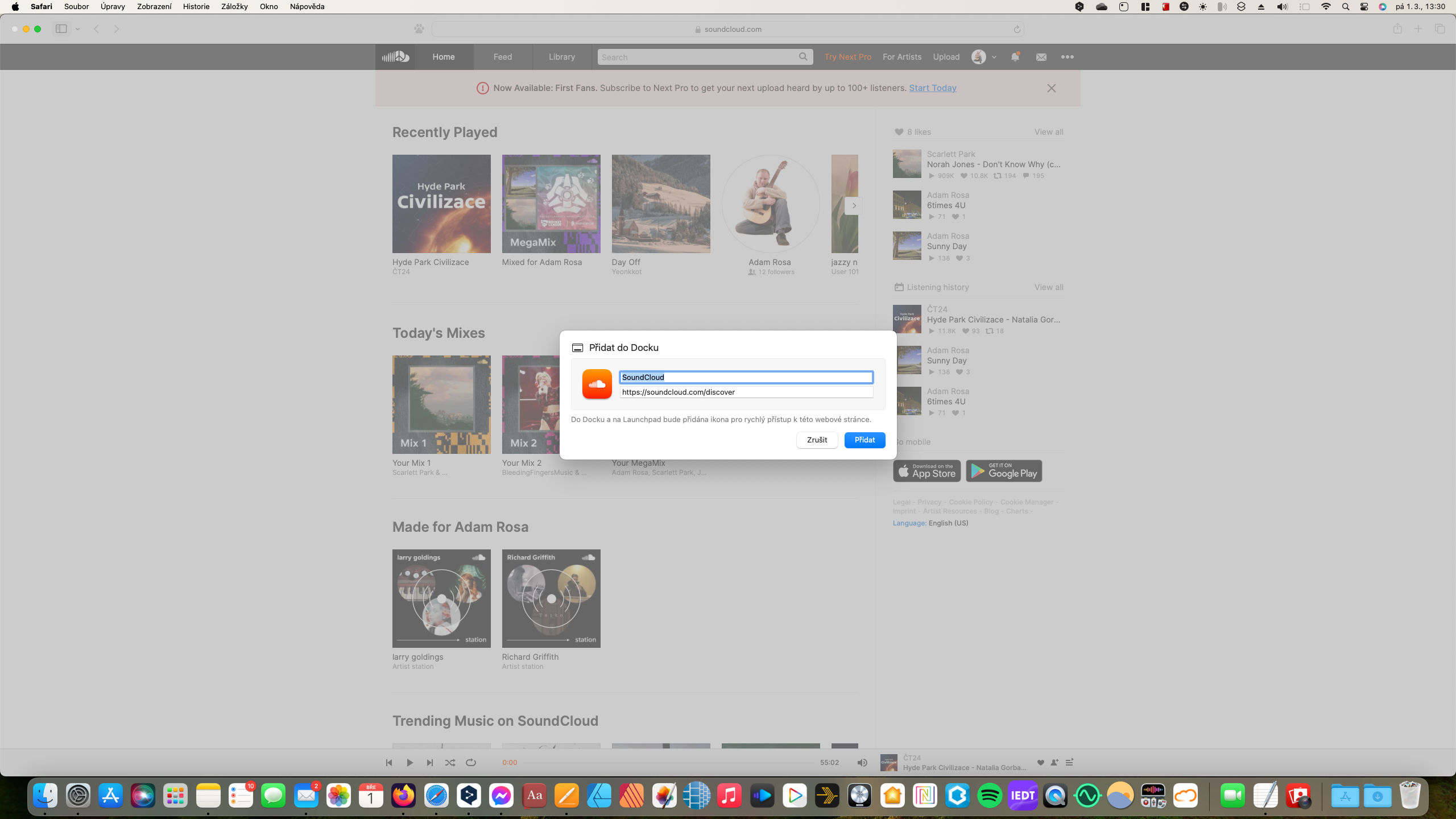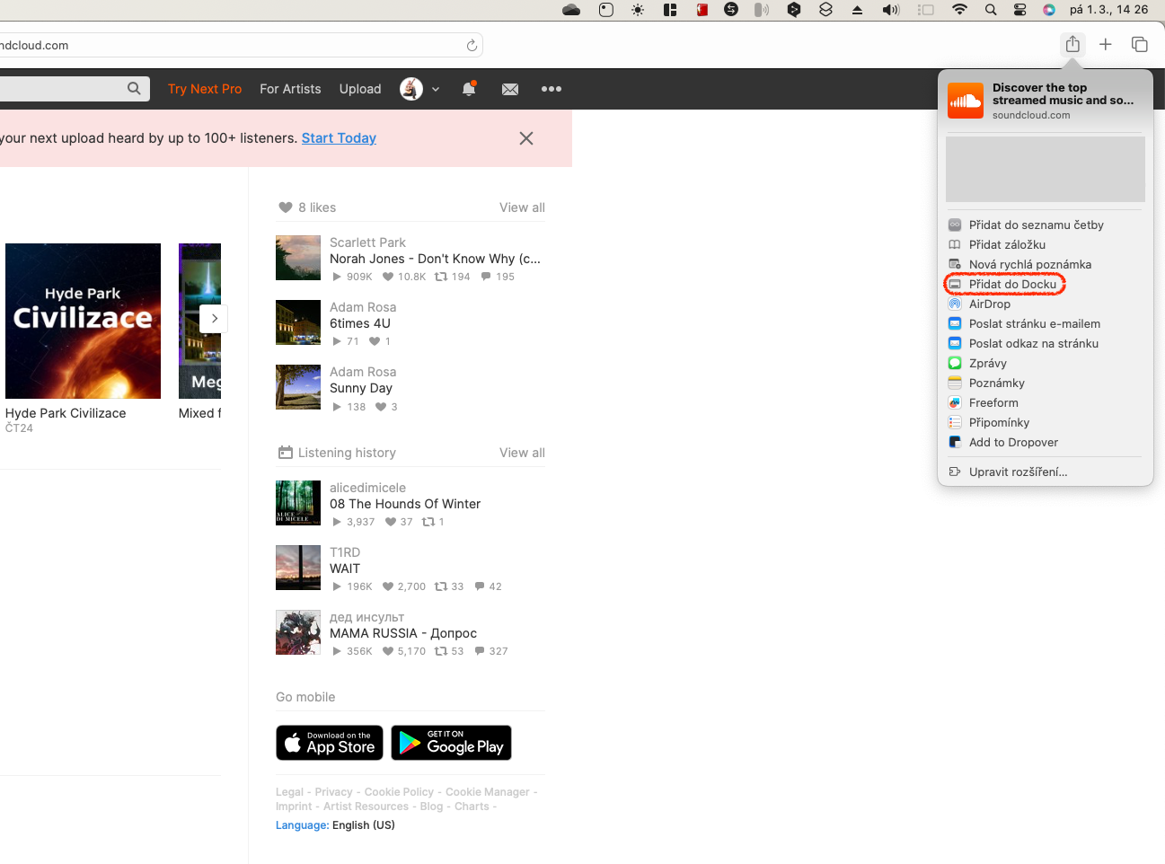 Chcete-li si užít tuto velmi příjemnou zkušenost, zadejte v Safari požadovanou adresu, poté klikněte na tlačítko Sdílet a zde na „Přidat do Docku“. Téhož docílíte také přes nabídku Soubor, kde se zmíněná položka rovněž nachází. Následně se Dock rozroste o další ikonu, přes kterou budete mít kdykoli přístup k oblíbeným informacím, hudbě nebo jinému obsahu. Například portál pro přehrávání hudby SoundCloud má sice aplikaci pro obě mobilní platformy, ale verze pro desktop bohužel chybí, pročež se tento způsob jeho používání jeví jako vítaná alternativa.