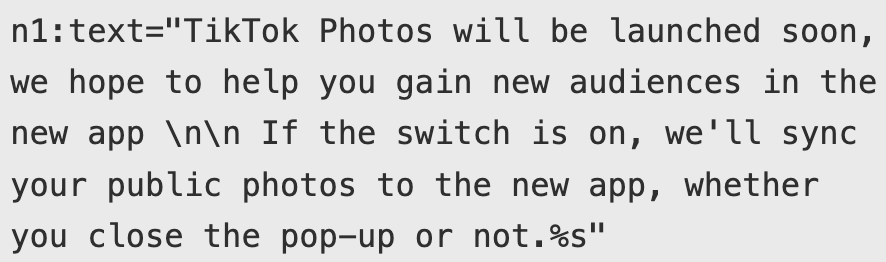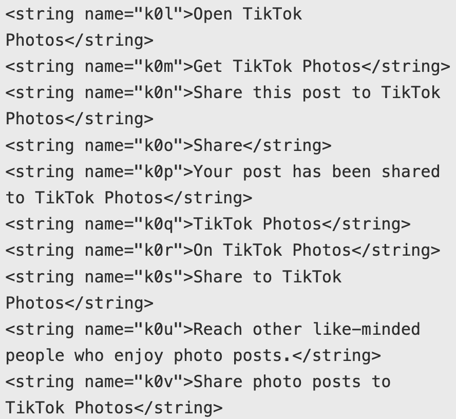 Server TheSpAndroid tento týden informoval o tom, že se v kódu nejnovější verze aplikace TikTok objevilo hned několik odkazů na aplikaci zvanou „TikTok Photos“. Na základě řetězců redaktoři zmíněného serveru usoudili, že by se mohlo jednat o zcela novou aplikaci velmi podobnou Instagramu, s kanálem, kde mohou uživatelé sdílet fotografie se svými přáteli a rodinou. Zmíněné řetězce vyzývají uživatele k vyzkoušení nové aplikace TikTok Photos. Vypadá to také, že uživatelé budou moci sdílet obsah z hlavní aplikace TikTok do aplikace Fotky. Další řetězec popisuje aplikaci jako místo, kde se lze dostat k „dalším podobně smýšlejícím lidem, kteří mají rádi příspěvky s fotografiemi“.