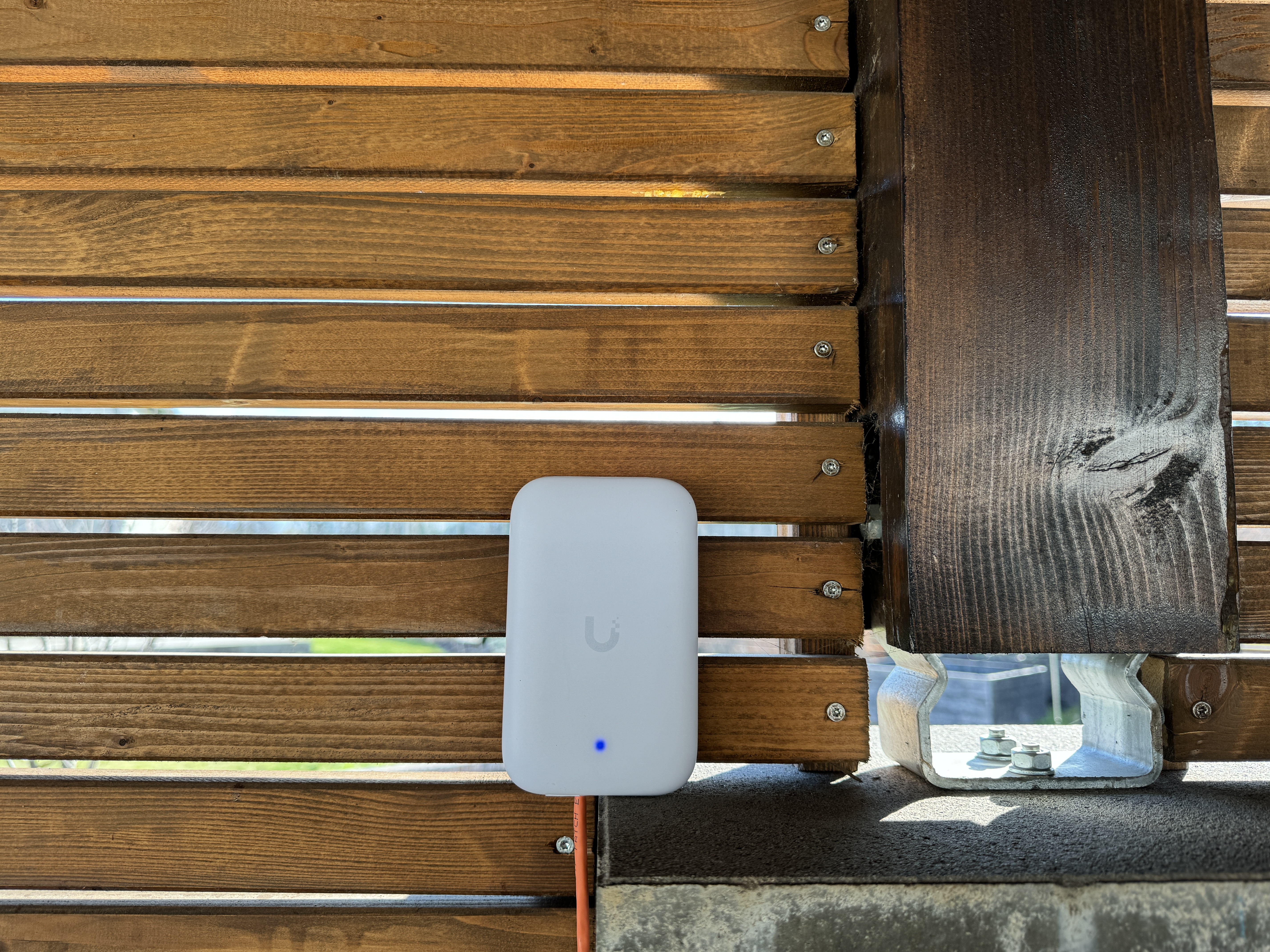 Zcela upřímně by Wi-Fi z domu postačovala i na pokrytí pozemku, ovšem vzhledem k tomu, co vše na pozemku je k Wi-Fi připojeno a také s ohledem na fakt, že máme v altánku poměrně kvalitní reproduktory přehrávající hudbu přes AirPlay, zvolili jsme také venkovní Wi-Fi jednotku. Ta je umístěná přímo v altánku a je určená přímo na outdoorové použití s tím, že snáší vlivy počasí. Jedná se o UniFi Swiss Army Knife Ultra, jenž je v rohu pozemku v altánku a Wi-Fi „střílí“ směrem k domu, zatímco již zmíněné Wi-Fi moduly uvnitř domu ji směřují právě proti altánku. Díky tomu je pokryt Wi-Fi stabilně nejen dům, ale i zahrada a altánek.