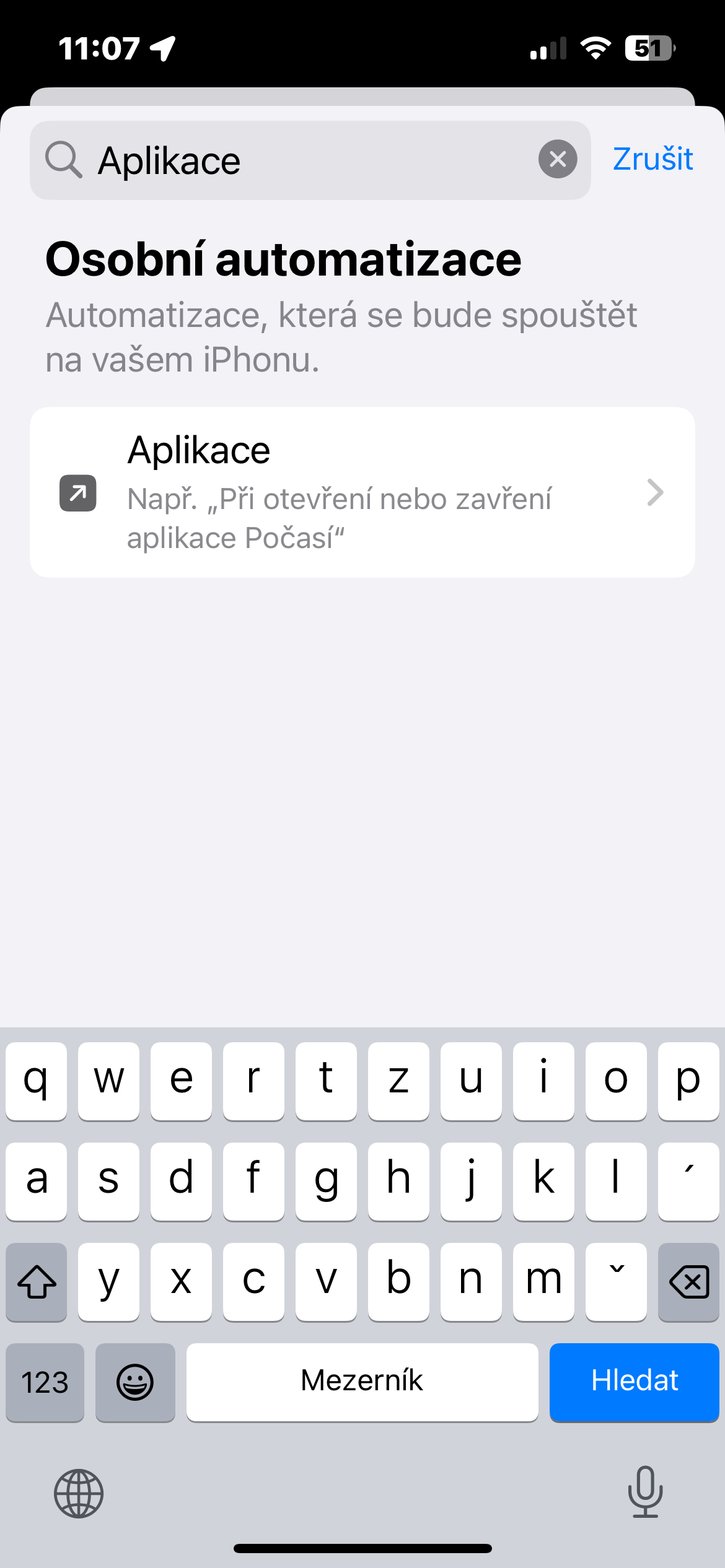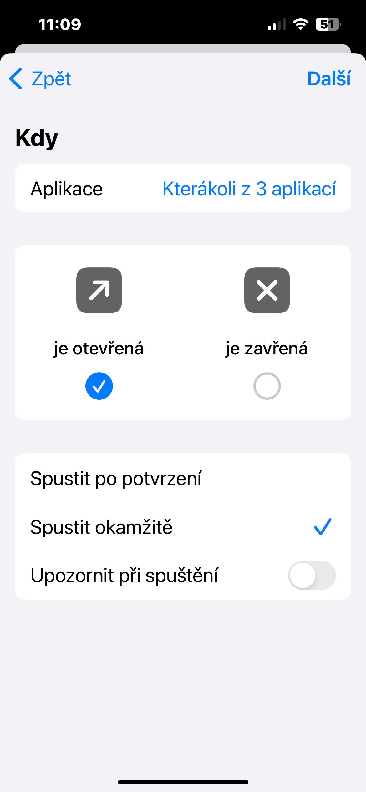 - Do vyhledávacího pole zadejte Aplikace a přidejte příslušnou položku k automatizaci. Ujistěte se, že jste zaškrtli položku Je otevřená.