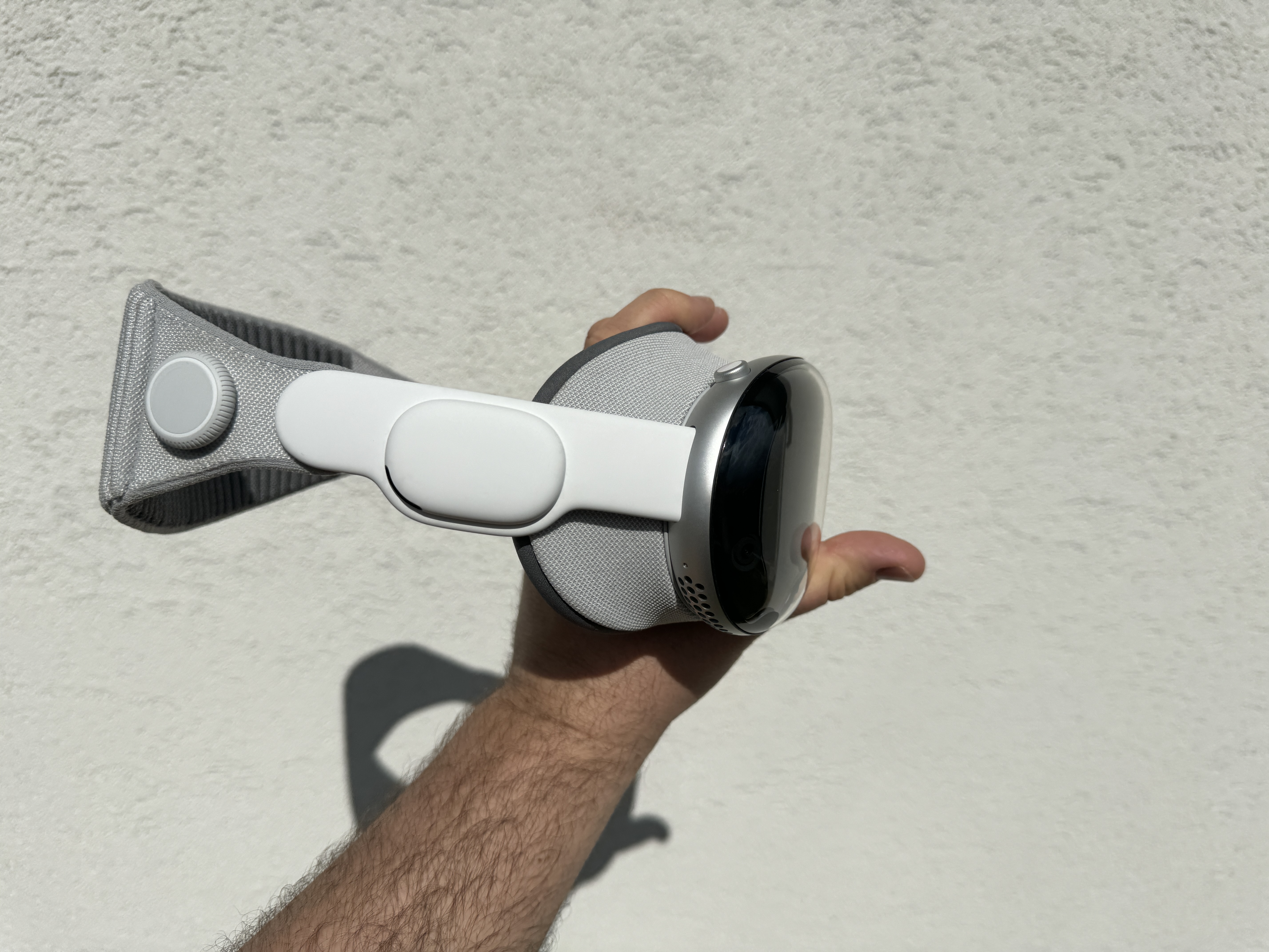 Další části je pak čelenka vyrobená z velmi jemné látky, kterou je možné přizpůsobit hlavě a regulovat pomocí otáčení kolečka, jak moc má být těsná. Tu lze nahradit také za čelenku s trojicí popruhů, aby se lépe rozložila váha. Upřímně řečeno, ani po dvou hodinách nošení jsem neměl nejmenší problém s hmotností Vision Pro, ale chápu, že padesáti kilogramová žena je mít může a je to tak velmi individuální záležitost.