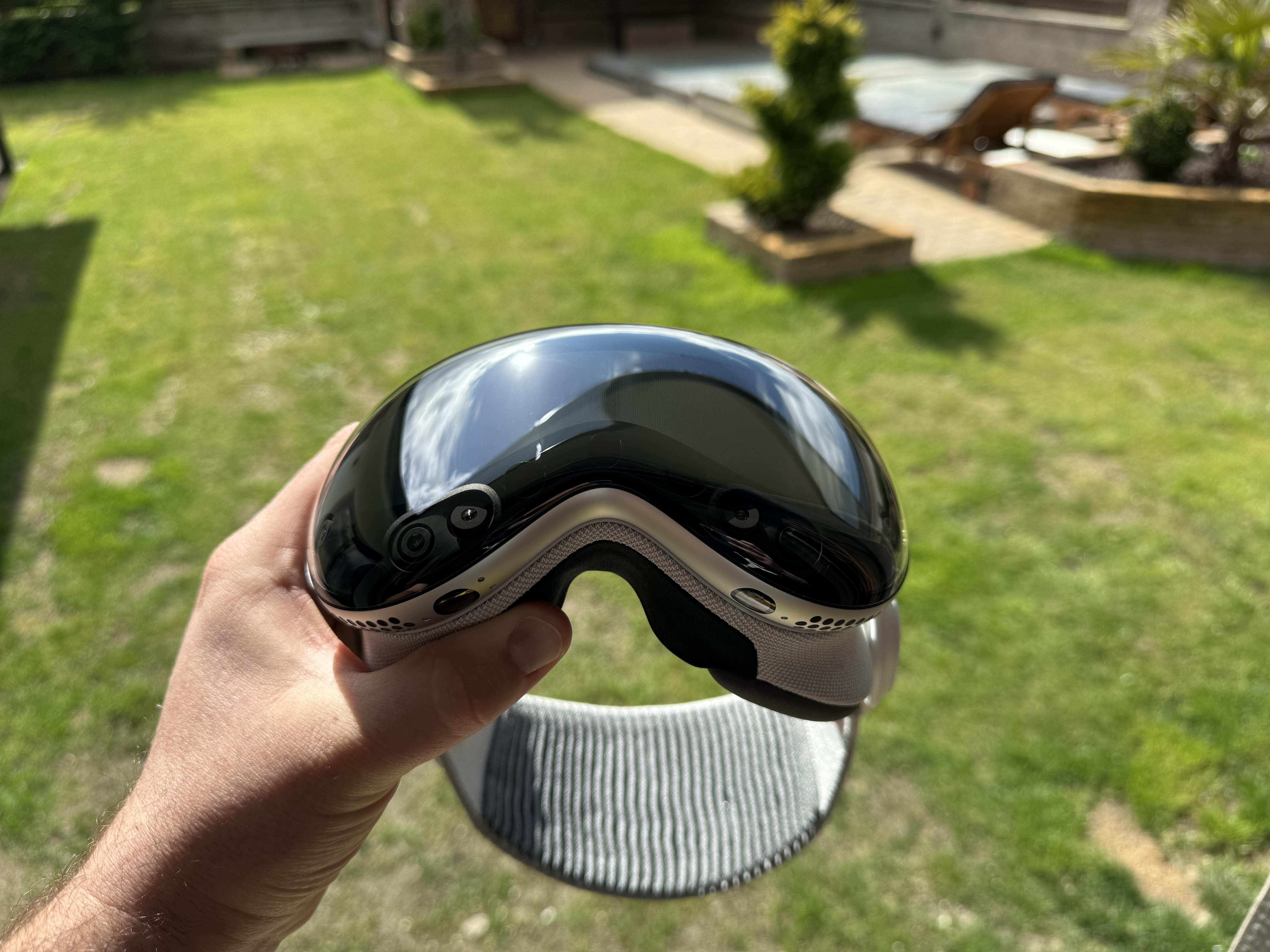 Tato část obsahuje LiDAR, dvanáct kamer, chlazení, veškeré čipy a v podstatě naprosto celou elektroniku tohoto zařízení. Dvanáct kamer slouží jednak ke snímání vašich očí a zejména pak ke snímání okolí, z něhož vám v reálném čase zobrazují obraz na vnitřních displejích a vy tak vidíte skrze brýle prostor před nimi a právě díky tomuto principu pak může VisionOS umístit do prostoru v reálném světě virtuální objekty.