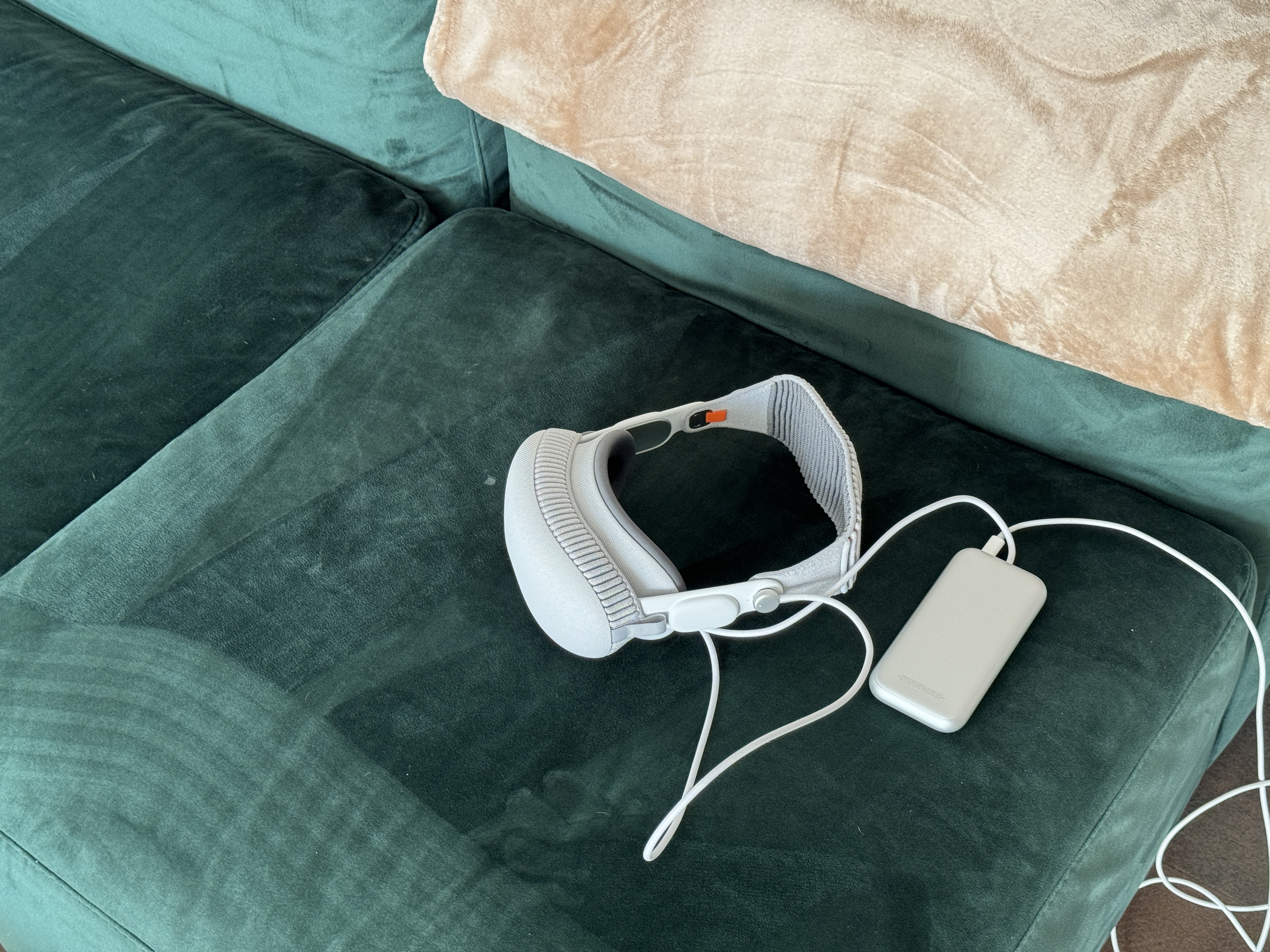 Třetí a poslední částí je pak baterka, která je připojena k brýlím pomocí speciálního konektoru a má napevno připojený kabel. Baterie se nabíjí pomocí USB-C portu. Je možné ji nabíjet a přitom používat Vision, případně k ní připojit USB-C powerbanku a tak si prodloužit výdrž mimo místa, kde máte k dispozici zásuvku.