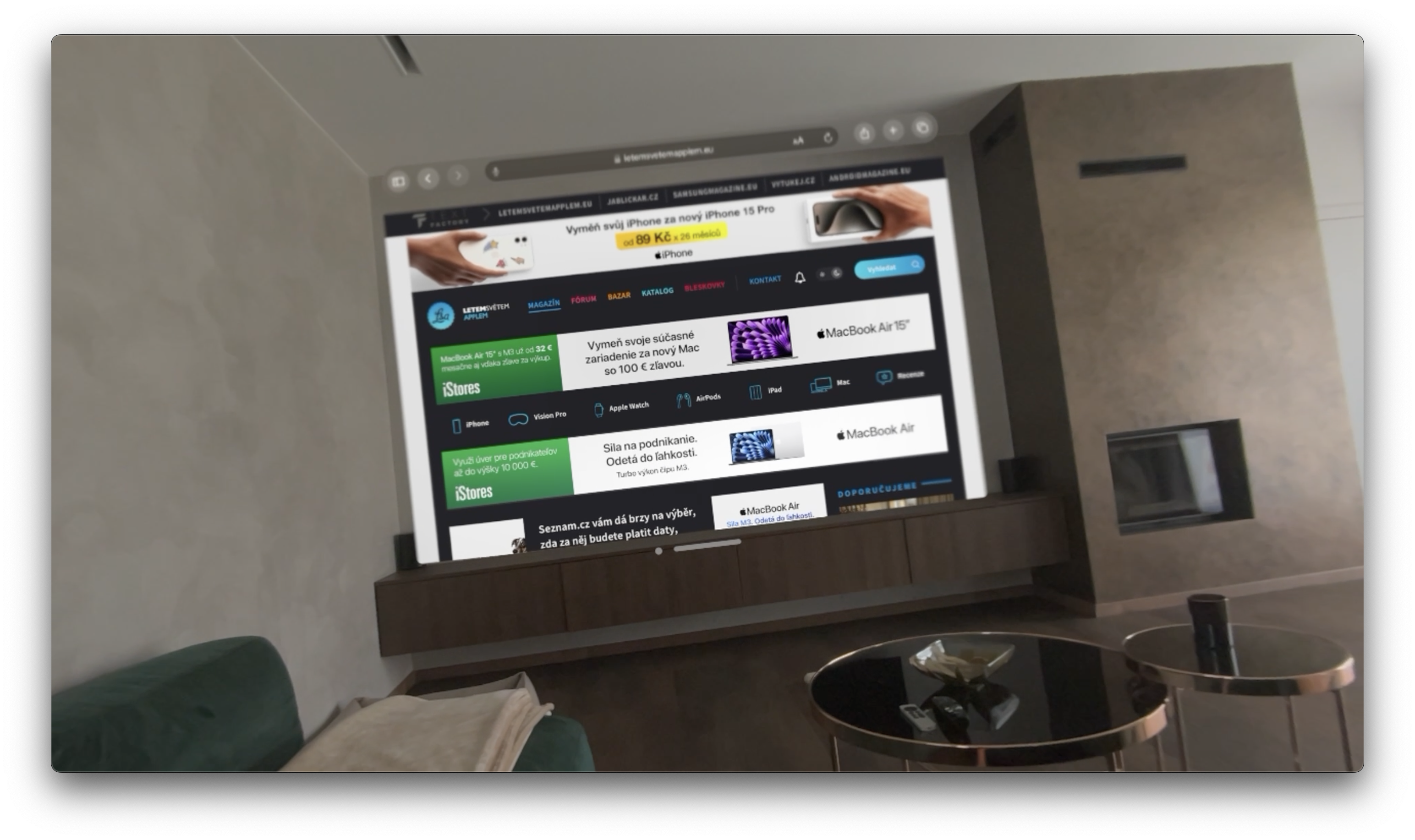 Druhým režimem je AR, tedy Augmented reality, kdy se virutální objekty a je jedno, zda jsou 2D nebo 3D, zobrazují pomocí headsetu ve vašem skutečném prostředí. Zde je naprosto neuvěřitelné, jak se podařilo Applu dokonale přizpůsobit umisťování oken ve vašem okolním prostředí. Jednoduše vezmete okno a můžete si jej libovolně zvětšit, přiblížit a oddálit. Otevřu například Safari a to si mohu zobrazit ve vzdálenosti 50 centimetrů od očí a mít jej velké stejně jako na 13″ MacBooku Air. Zároveň však mohu vzít toto okno a posunout jej na stěnu ve svém obýváku a zobrazit jej ve velikosti 5×3 metry. Pokud mi to nestačí, vyjdu na zahradu, okno posunu 30 metrů od sebe a zobrazím jej ve velikosti 50×50 metrů.