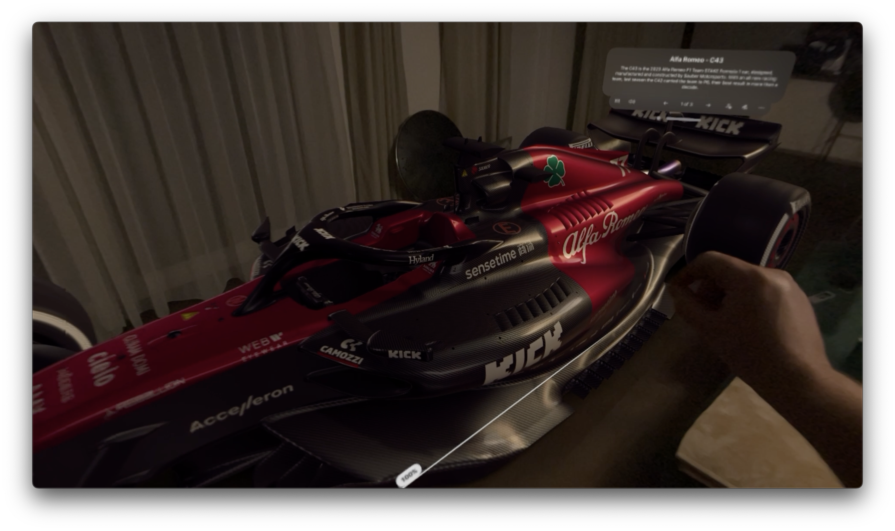 U každé věci, kterou si zobrazíte, máte jednak možnost jejího zmenšení a zvětšení s tím, že nechybí ani hodnota ukazující 100% velikost odpovídající danému předmětu. Věci, které jsou funkční, můžete rozpohybovat a uvidíte tak například, jak se F1 točí kola, jak okolo ní proudí vzduch a mnoho dalšího. Nechybí pak ani možnost vše detailně rozebrat a podívat se dovnitř formule nebo například proudového motoru. Vše vypadá tak neuvěřitelně realisticky, že si nedovolíte například šlápnout na přední spiler formule, protože by vás přece mrzelo, že jste šlápli na kus karbonu. Naprosto dokonalá ukázka toho, co umí Vision Pro v AR režimu.