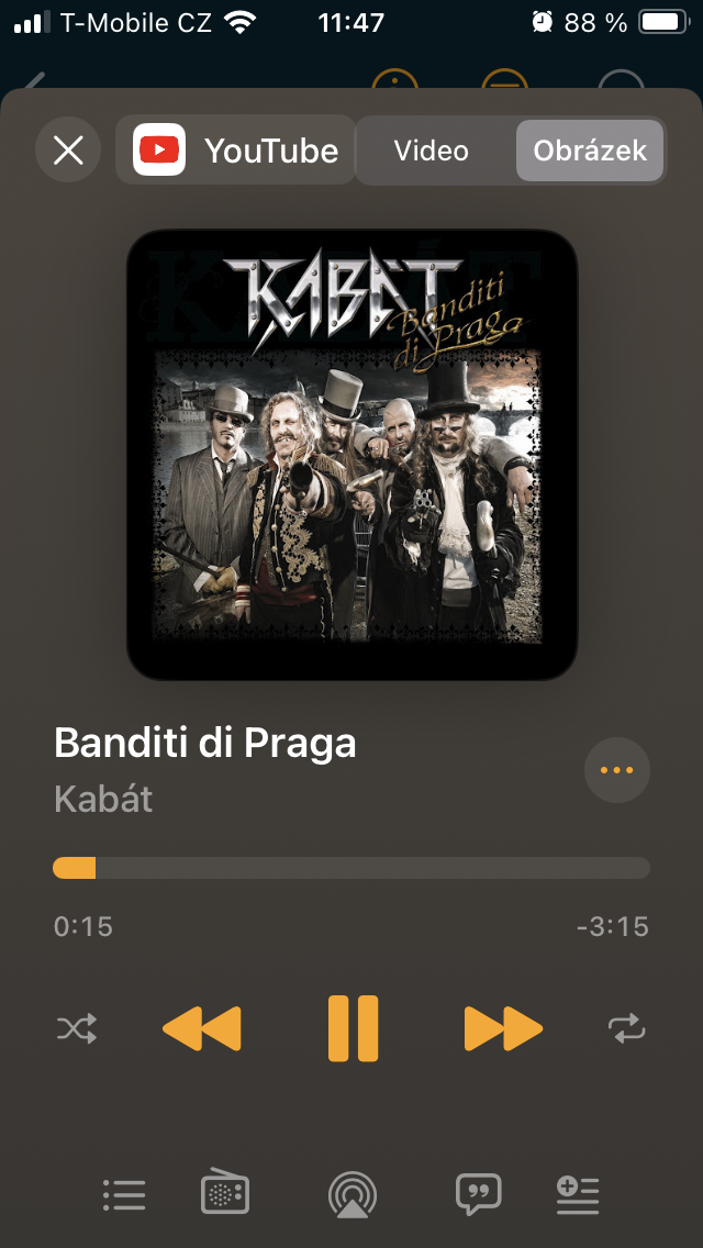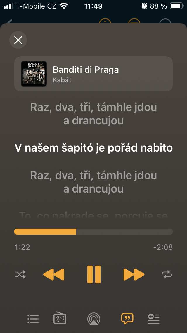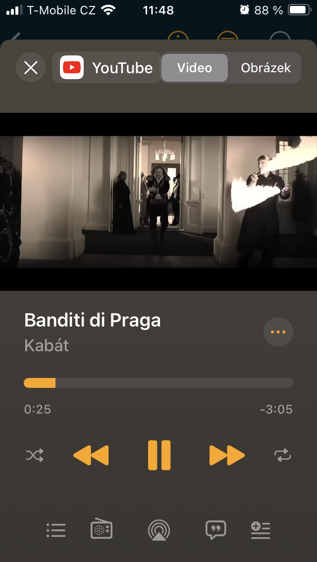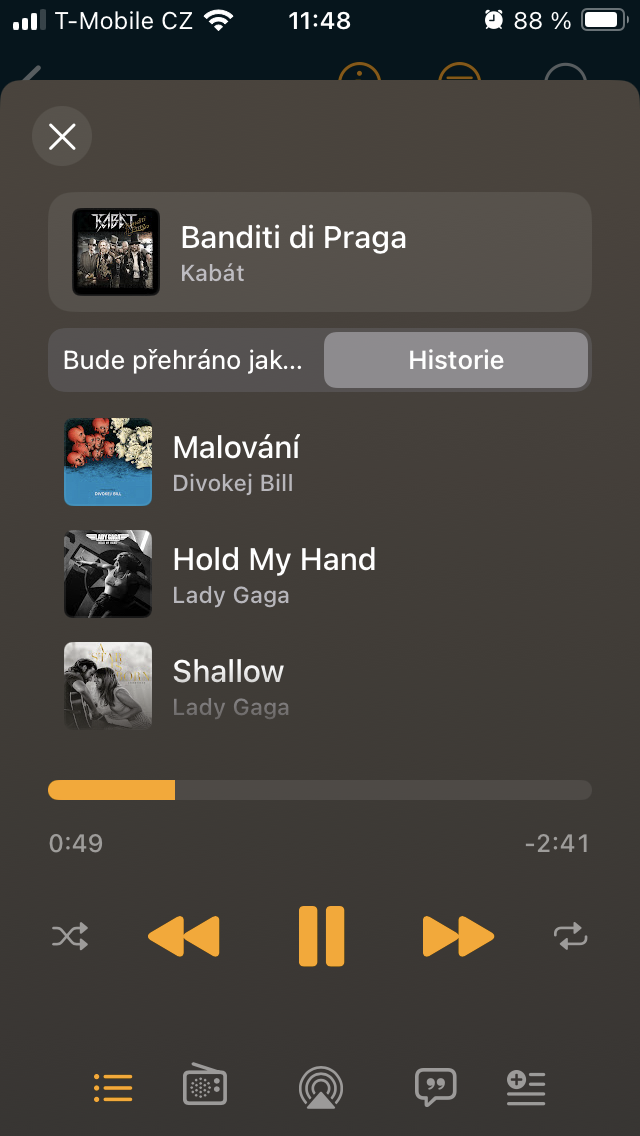 S výběrem písně se před vámi objeví přehrávač, kde si lze zvolit, zda se zobrazí video nebo grafika, pomocí + docílit zařazení do knihovny nebo se skrze symbol třech teček rozhodnout pro další akce typu sdílení, přechod k umělci, spuštění rádia, přidání do playlistu a další. Samozřejmostí je pak posun v rámci aktuálně přehrávaného obsahu a soubor ovládacích ikon pro spuštění či pozastavení a přeskočení vpřed i vzad. Nejníže pak narazíte na sadu pěti položek zjednodušujících dostupnost nejdůležitějších operací, včetně přístupu k nadcházejícím a historii, výběru směrování signálu do jakéhokoliv audio systému podporujícího přenos přes Bluetooth nebo AirPlay, prohlížení textu k písni i jejího zahrnutí do selektovaného seznamu.