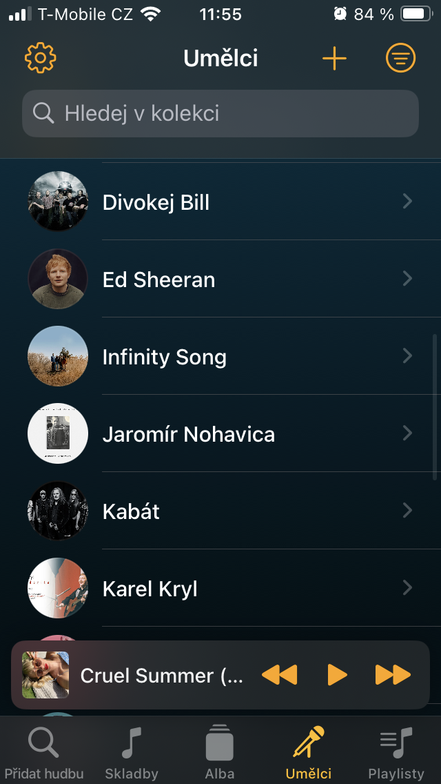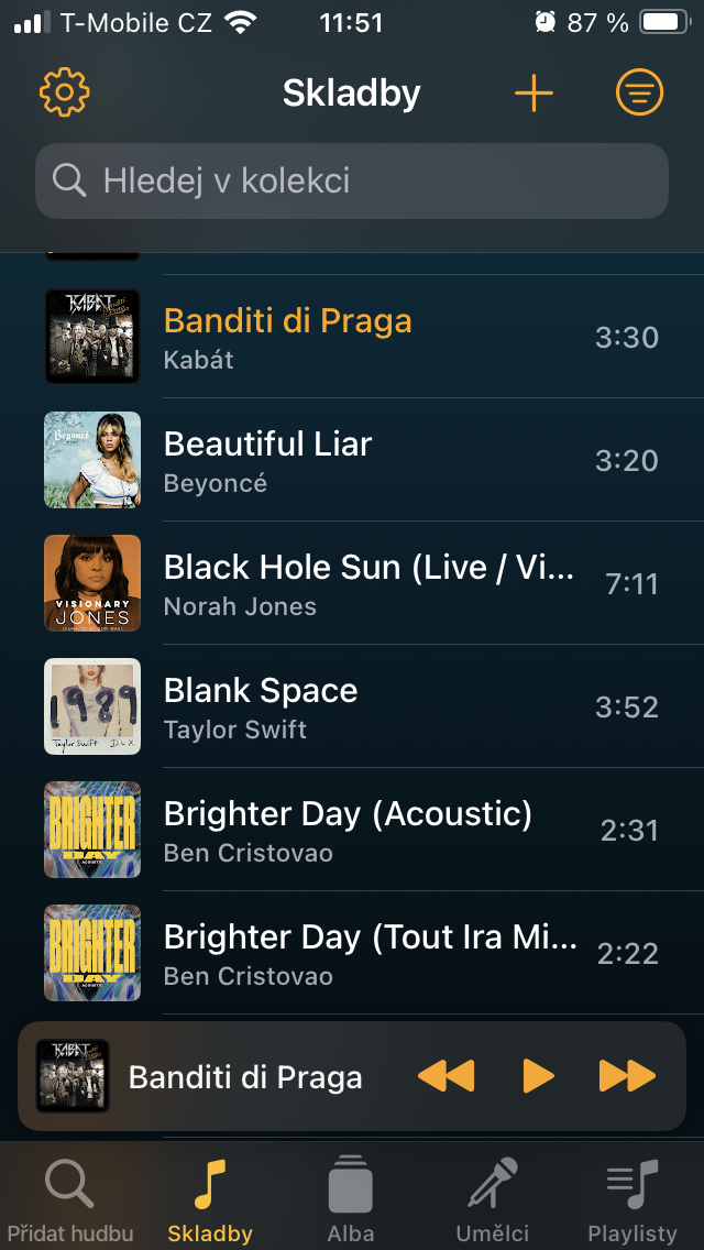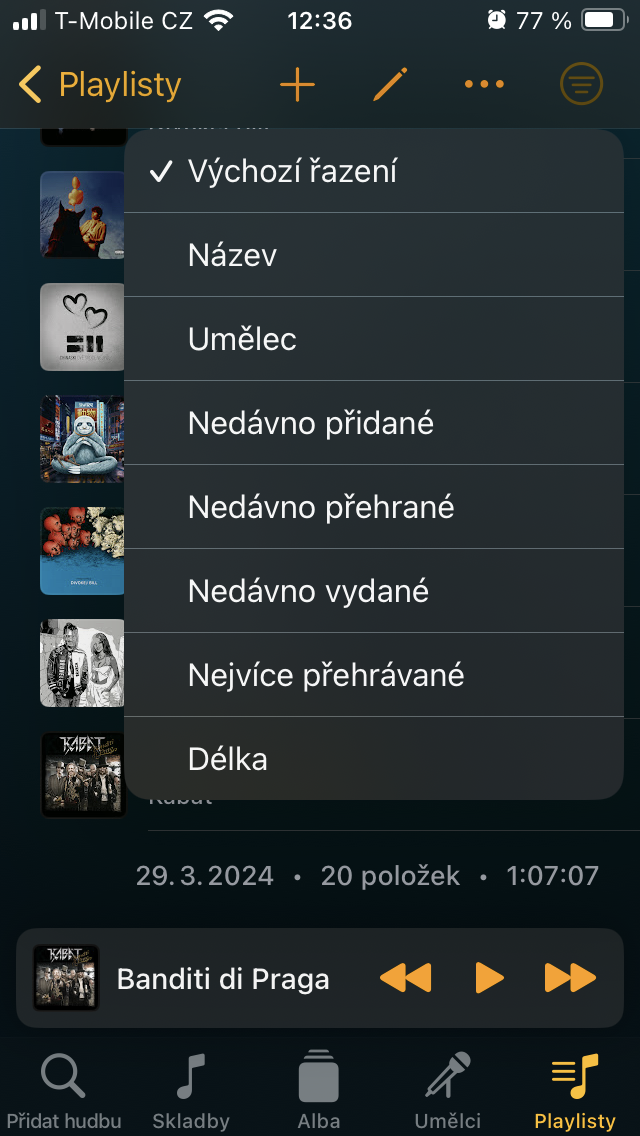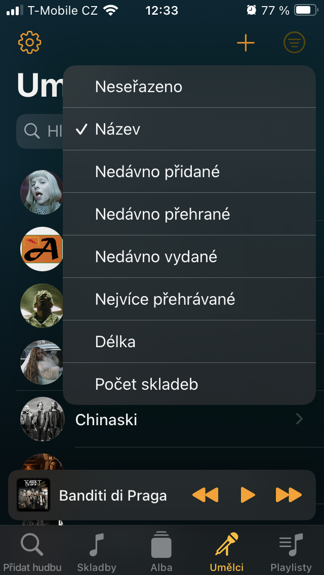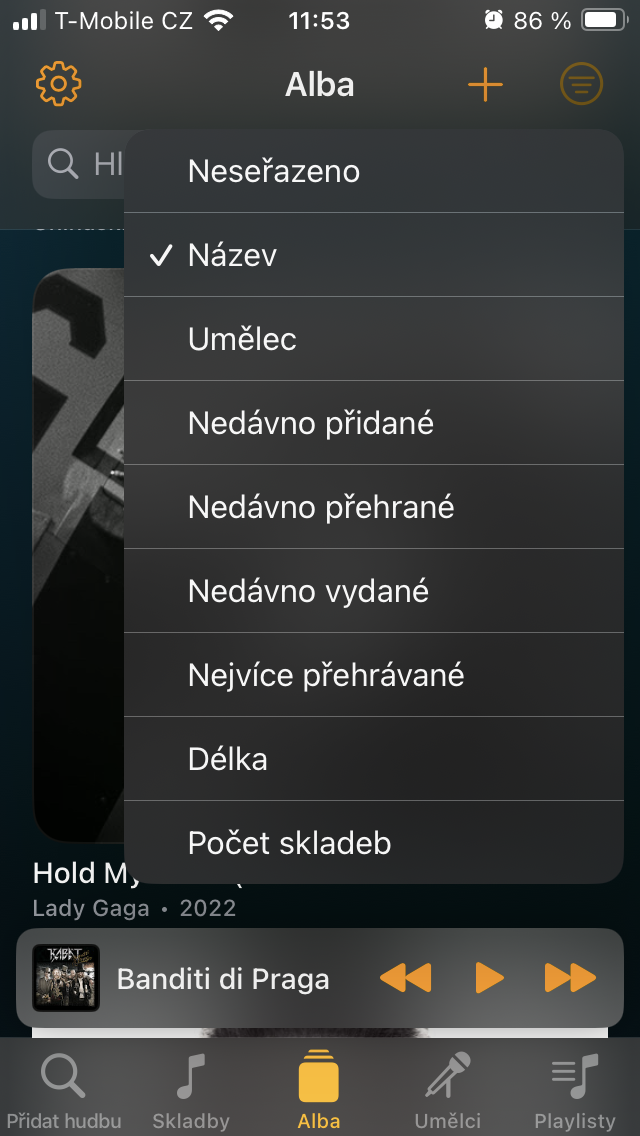 Přesuneme-li se ke Skladbám, setkáte se zde s veškerým obsahem, který jste sem umístili prostřednictvím tlačítka +. Ten je pak možné stisknutím již zmíněné ikony se třemi čárkami vpravo nahoře třídit například podle názvu, umělce, doby vydání, délky a podobně. Pro rychlou organizaci zobrazíte podržením podnabídku, s níž je zařazení tracku k ostatním podobného charakteru o to jednodušší.