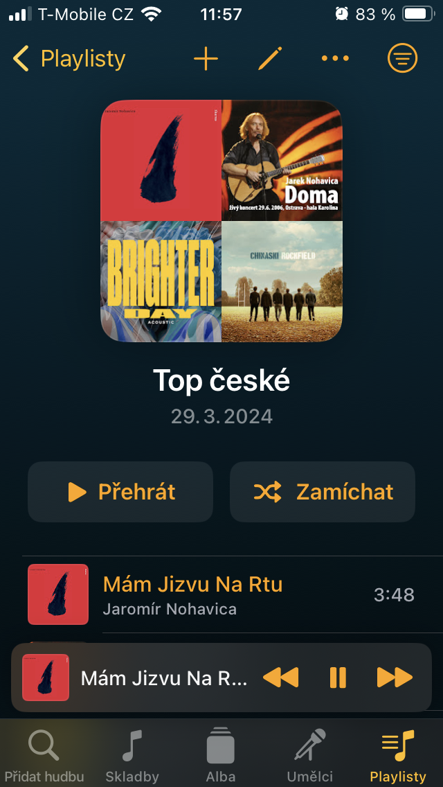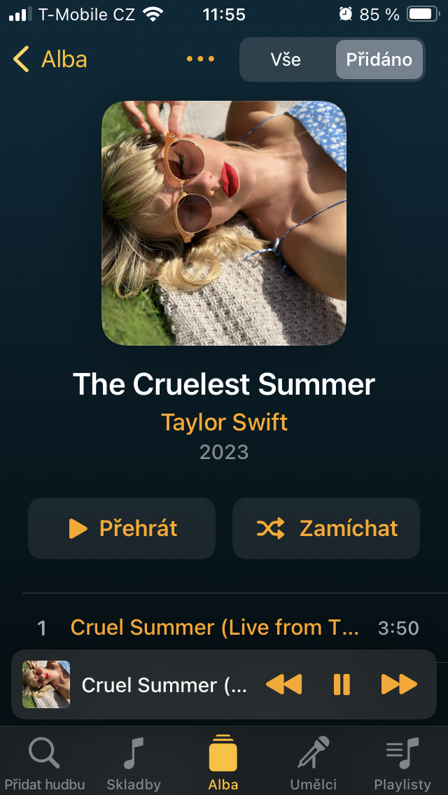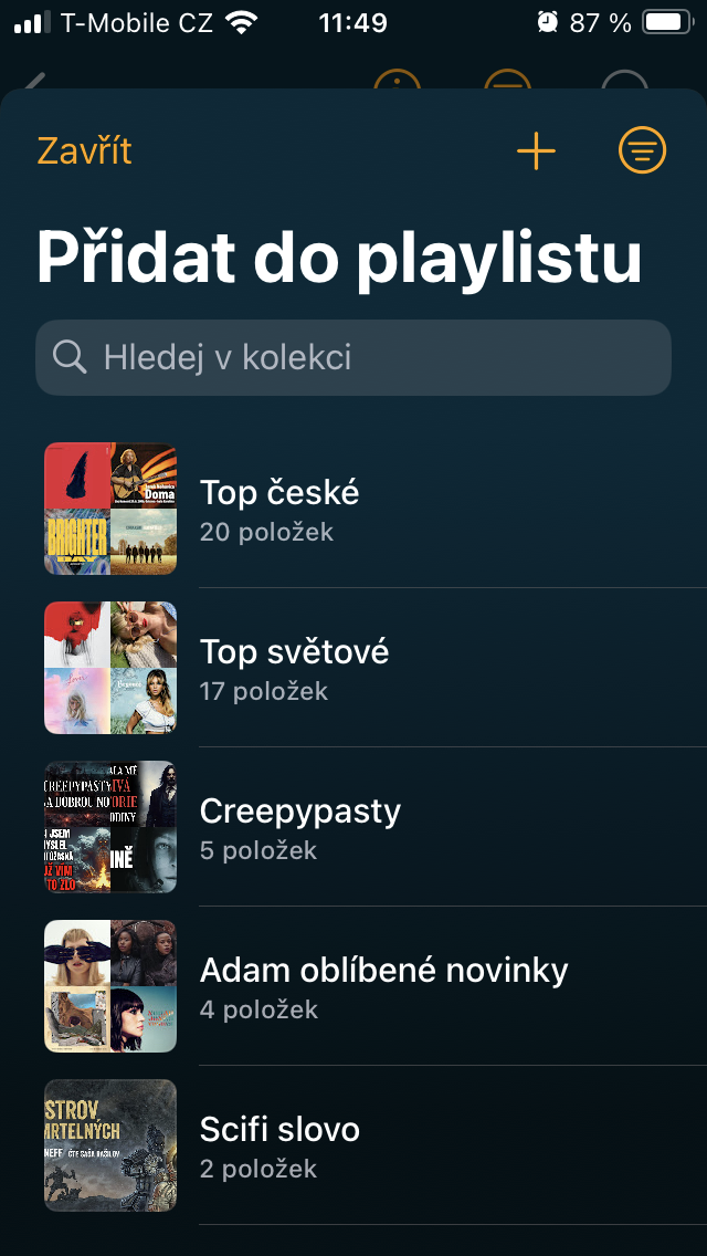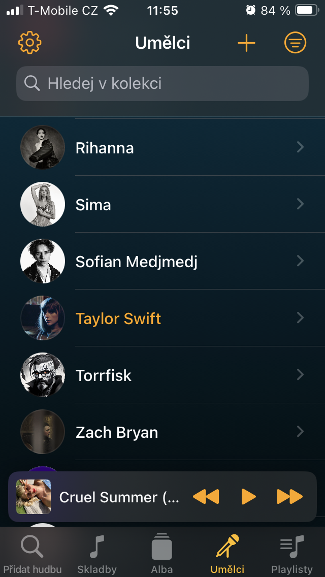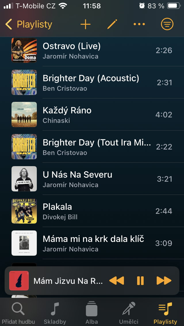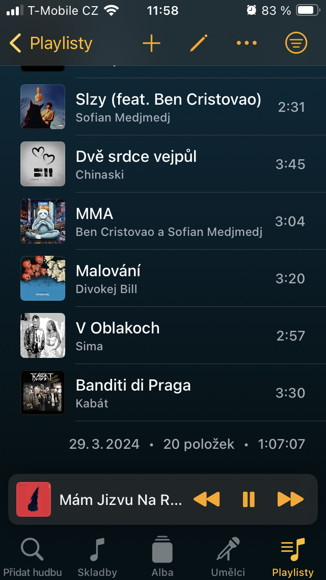 Přesuneme-li se ke Skladbám, setkáte se zde s veškerým obsahem, který jste sem umístili prostřednictvím tlačítka +. Ten je pak možné stisknutím již zmíněné ikony se třemi čárkami vpravo nahoře třídit například podle názvu, umělce, doby vydání, délky a podobně. Pro rychlou organizaci zobrazíte podržením podnabídku, s níž je zařazení tracku k ostatním podobného charakteru o to jednodušší.