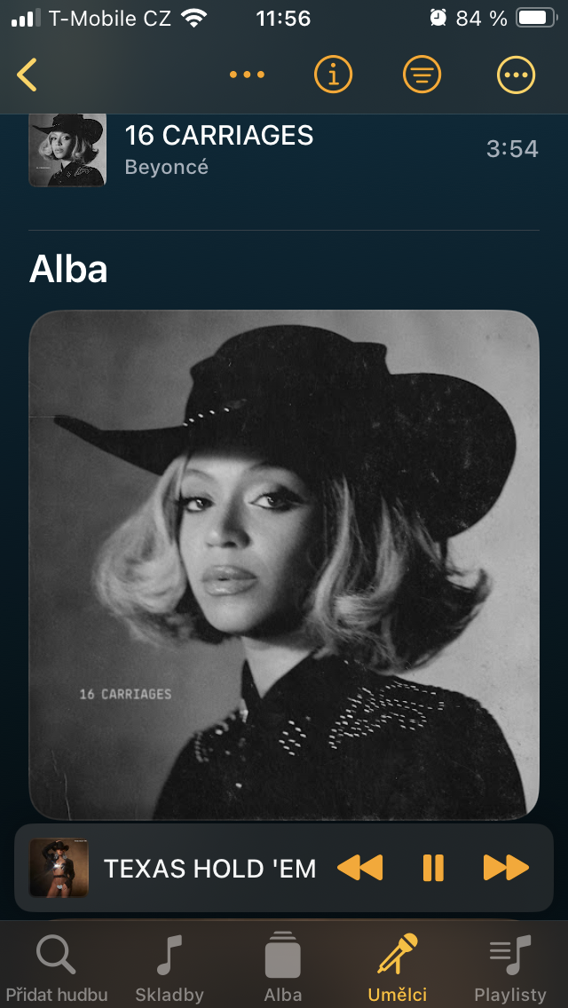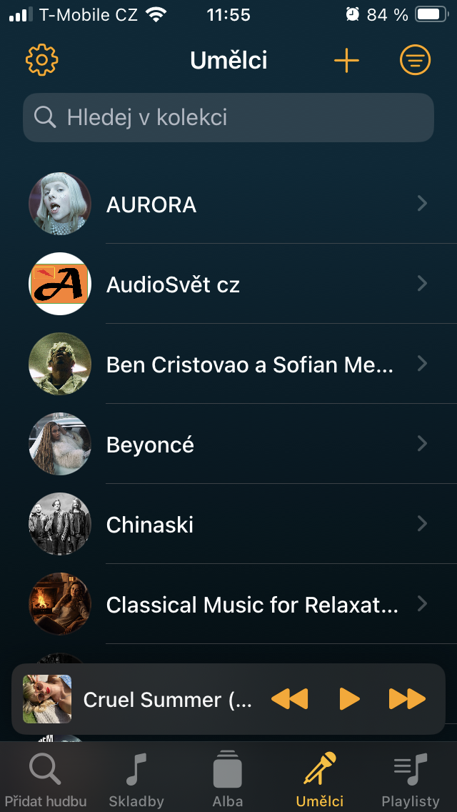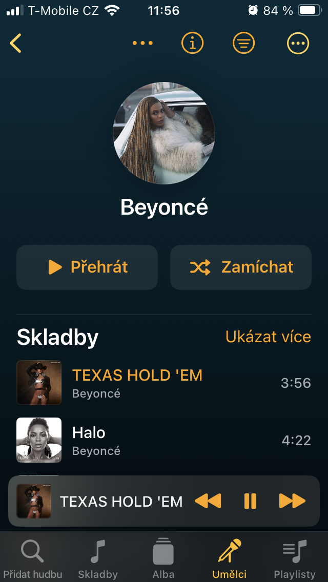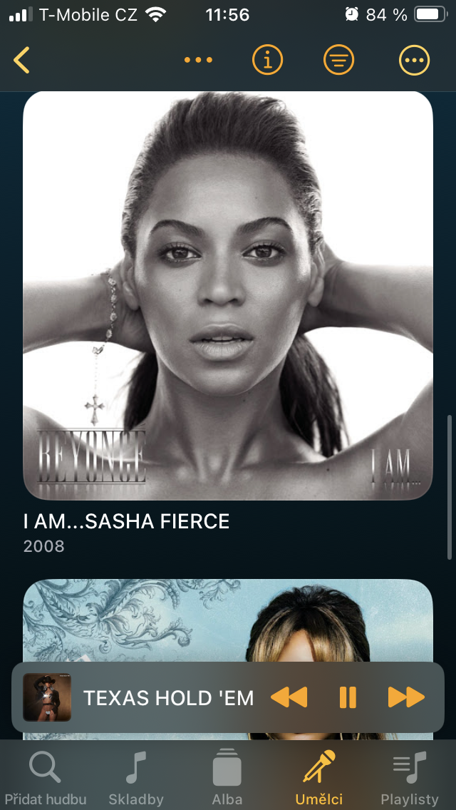 Obdobným způsobem je řešen oddíl Umělci, kde pod konkrétním interpretem získáte přehled o jeho jednotlivých skladbách i kompletních albech, zatímco v horní části kromě zařazení do fronty přehrávání, playlistu a dalších úkonů se klepnutím na ikonu „i“ propracujete k informacím o interpretovi. Pakliže jste zařadili od daného oblíbence větší množství hudby (nebo mluveného slova) a potřebujete se v soupisu lépe orientovat, opět se nabízí možnost různého typu řazení.