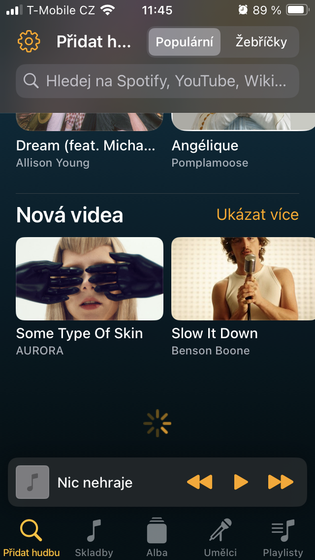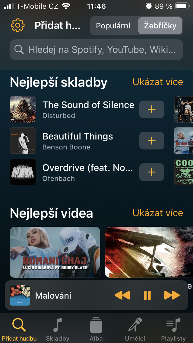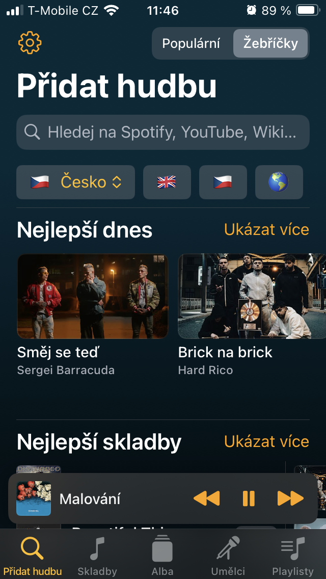 Po spuštění vstoupíte automaticky do sekce Přidat hudbu, což je velmi praktické. Kromě klasického vyhledávání je zde uživateli k ruce pod záložkou Populární souhrn nejnovějších vydání, zatímco klepnutím na Žebříčky v pravém horním rohu se můžete nechat inspirovat nejúspěšnějšími kusy u nás, v Anglii, Spojených státech a desítkách dalších zemí rozdělených do několika kategorií zvýrazňujících to nej pro dnešek, mezi umělci i napříč jejich tvorbou.