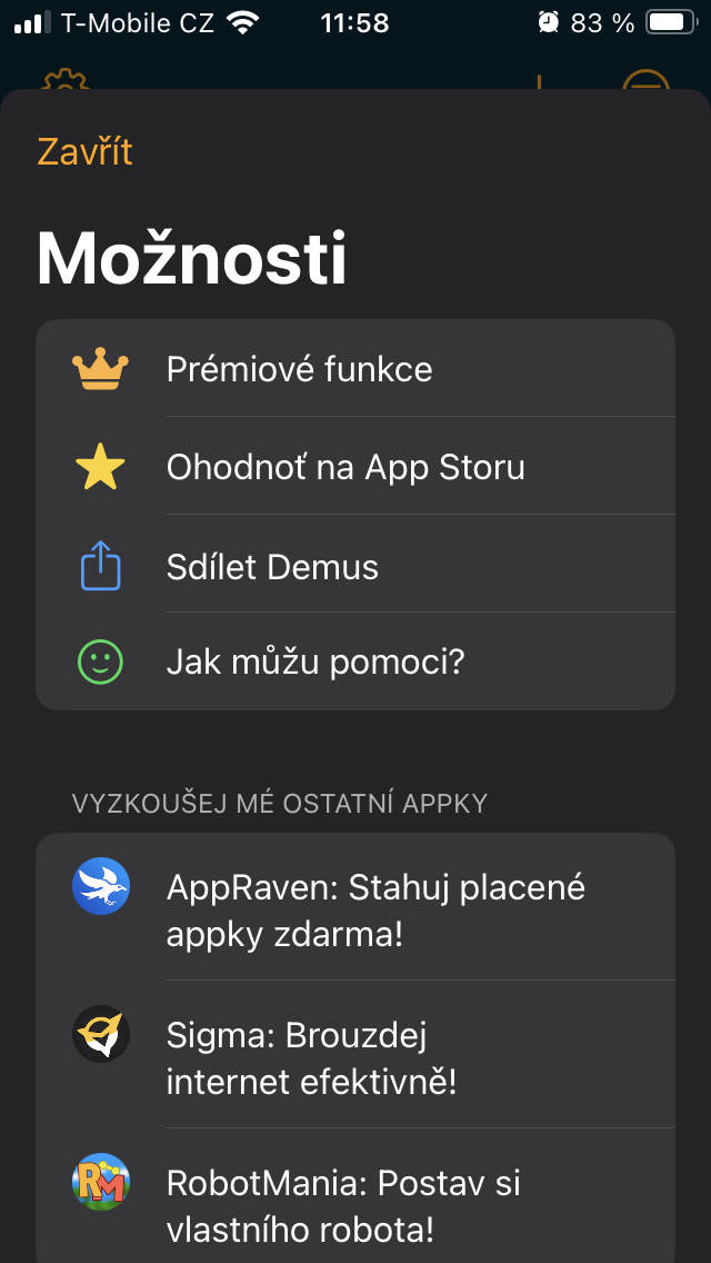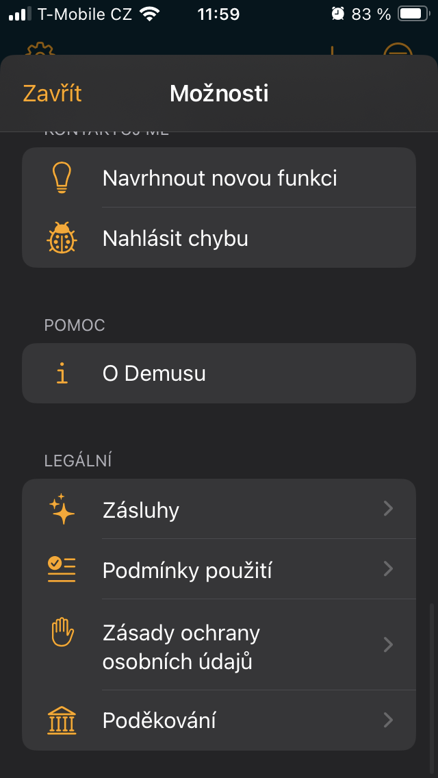 Pod nastavením v levém horním rohu se vedle možnosti ohodnocení, sdílení i dalších prací vývojáře, můžete přidat ke komunitě na Telegramu, Redditu či Twitteru, ale také si vybrat jazyk, případně změnit výchozí stránku z Přidání hudby na kteroukoli z výše zmíněných položek. Opomenout ovšem nelze také například volbu automatického přehrávání, velmi užitečný časovač spánku, smazání historie hledání nebo, je-li to žádoucí, celé existující knihovny. Pakliže vás schopnosti aplikace oslovily, můžete je jednorázovým nákupem Demus Prémium za pouhých 149 Kč ještě rozšířit o barevné motivy, ikonky nebo propracované statistiky a společně s tím podpořit další vývoj.