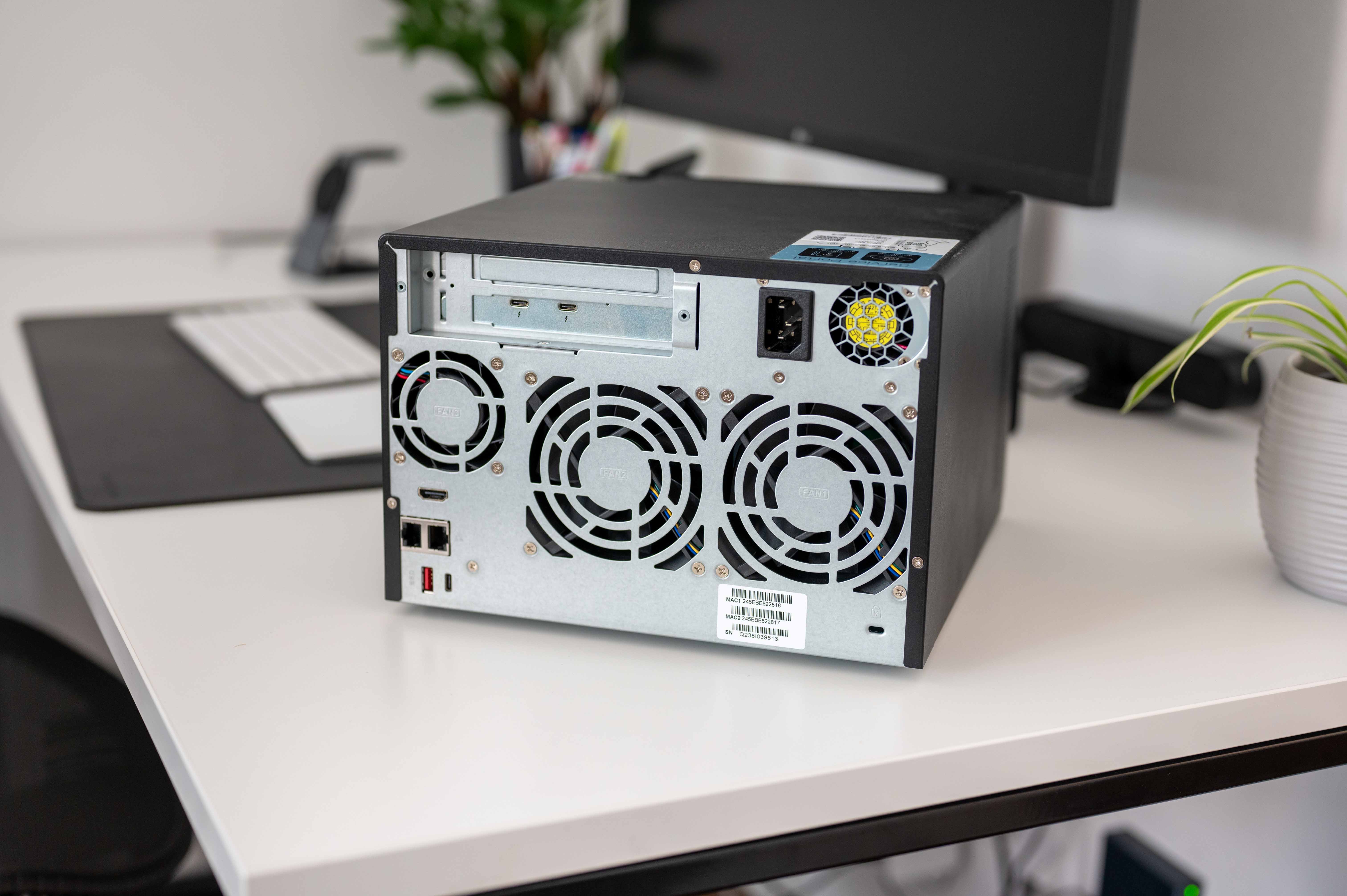 QNAP rozhodně nešetřil ani na pozicích pro diskové jednotky. K dispozici je konkrétně šest pozic pro 3,5“ SATA 6 Gb/s, 3Gb/s, přičemž pevné disky jsou vyměnitelné za provozu. K dispozici jsou zde ale třeba i sloty M.2 a to konkrétně ve verzi 2280 PCIe Gen 4 x4, či 2,5Gb ethernetové porty. Co se týče portů sloužících pro propojení s počítačem či jiným médiem, pro tyto účely je tu konkrétně Thunderbolt 4, takže se tu bavíme o maximální přenosové rychlosti 40 Gb/s. Je však nutné mít na paměti, že dosažení podobných rychlostí vyžaduje použití Thunderbolt 4 kabelu a počítače vybaveného tímto portem. V případě počítačů od Applu se však naštěstí nejedná o nic až tak nedosažitelného. Thunderbolt 4 porty totiž nabízí všechny MacBooky Pro od M1 Pro výše, stejně jako třeba Macy mini s M2. MacBook Air však nenabízí podporu pro takové rychlé porty.